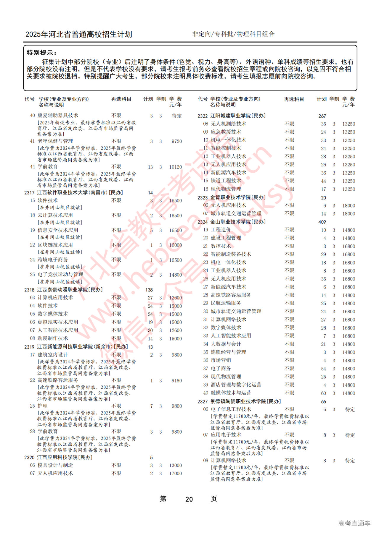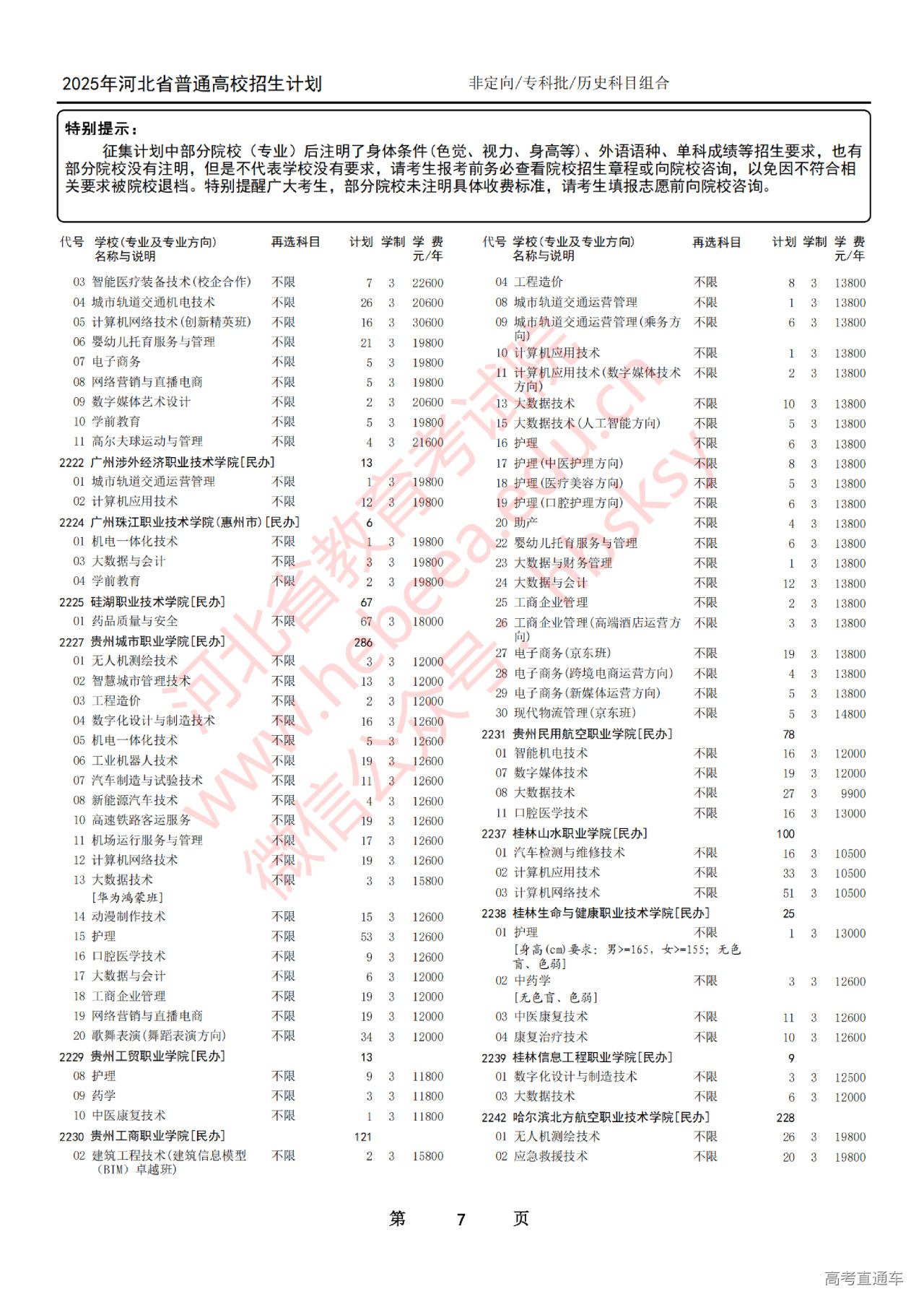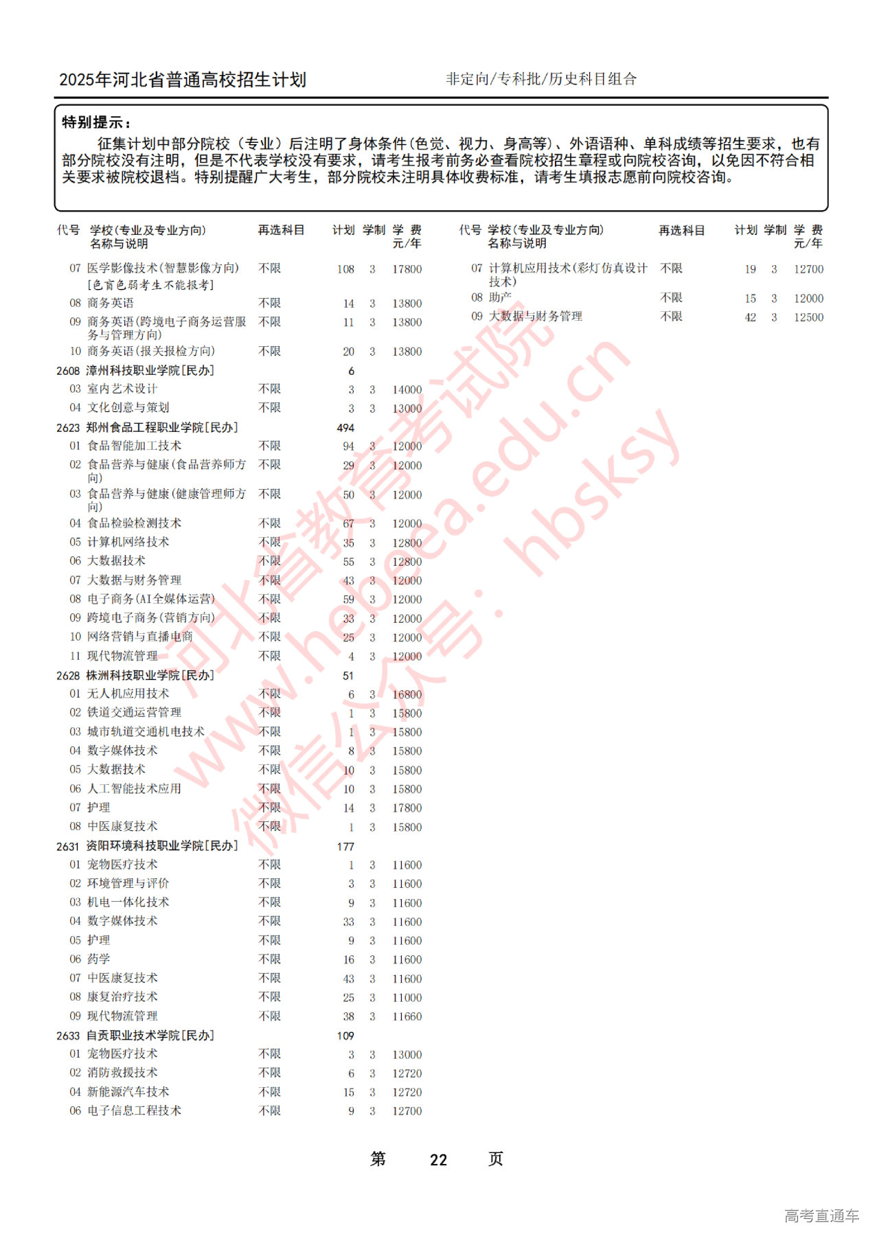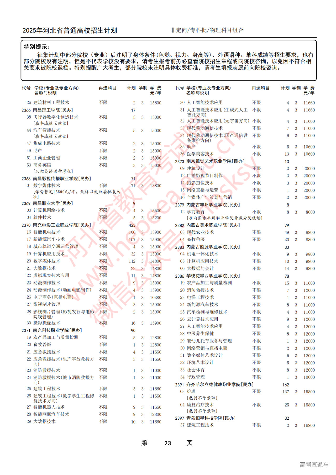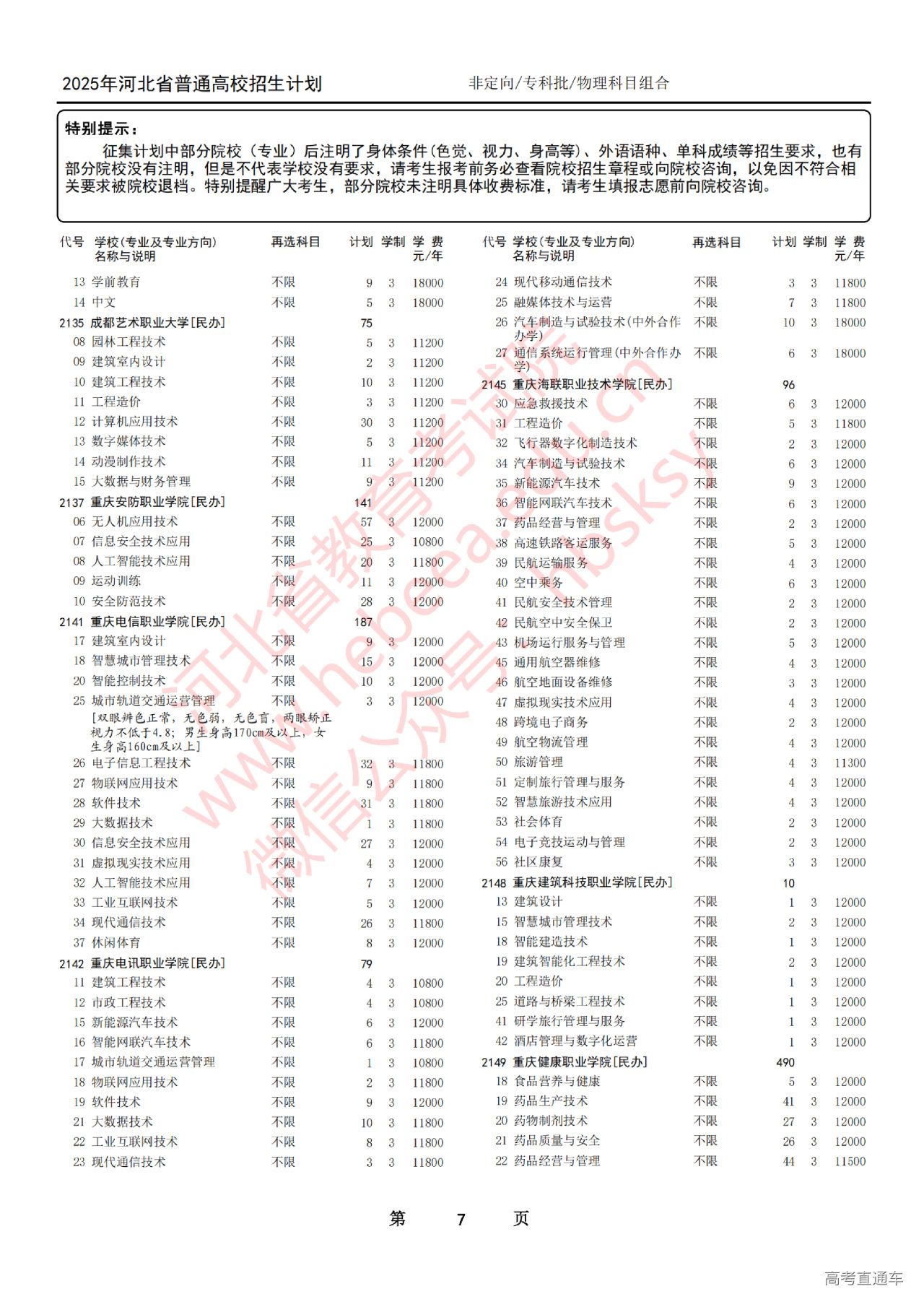 2025年河北省普通高校招生征集志愿计划说明 (专科批第三次征集) 一、本次征集是专科批最后一次征集志愿,公布的征集计划是专科批第二次征集志愿录取结束后院校缺额和新增计划,填报志愿的时间为8月25日12时至8月26日10时,未查到录取结果的考生可根据自身情况填报征集志愿。 二、本次征集录取时,如招生院校录取控制分数线上报考生源不足, 经招生院校申请,可降分录取,低于专科批文化控制分数线的考生可以填报。 三、本次填报志愿操作要求和集中填报志愿时要求一致,请考生登录我院网站,在规定时间内尽早完成志愿填报。在本次志愿填报截止时间前,考生可多次登录志愿填报系统进行志愿修改和保存并提交,最终以其网上最后一次修改并保存提交成功的志愿为准。 四、考生要切实增强安全意识,严格保管用户名及密码,密码设置不要过于简单,不要将密码告诉他人,不要让他人代为操作,以防志愿填报信息泄露或被他人篡改。遗忘密码的考生可在系统登录页面点击“密码重置”,进行重置密码操作。登录成功后,系统将向考生报名时预留的手机号码发送短信予以提示,如考生本人未登录而收到登录短信,请及时修改密码。 五、考生身体条件以高考体检表记载为准。部分院校专业对考生的身高、体重、视力、色觉、单科成绩等有要求,部分院校学费较高,请考生认真查阅拟填报院校招生章程或咨询院校。 六、本征集计划采用PDF格式公布,请考生使用PDF阅读器查看。部分浏览器自带的PDF阅读器浏览时存在缺字现象,遇到这种情况请考生下载正版PDF阅读器进行查看。 七、特别提醒:志愿是考生本人升学意愿的真实表达,是投档及录取的依据,如被高校录取,则不能退档。考生须慎重填报并对所填志愿负责。