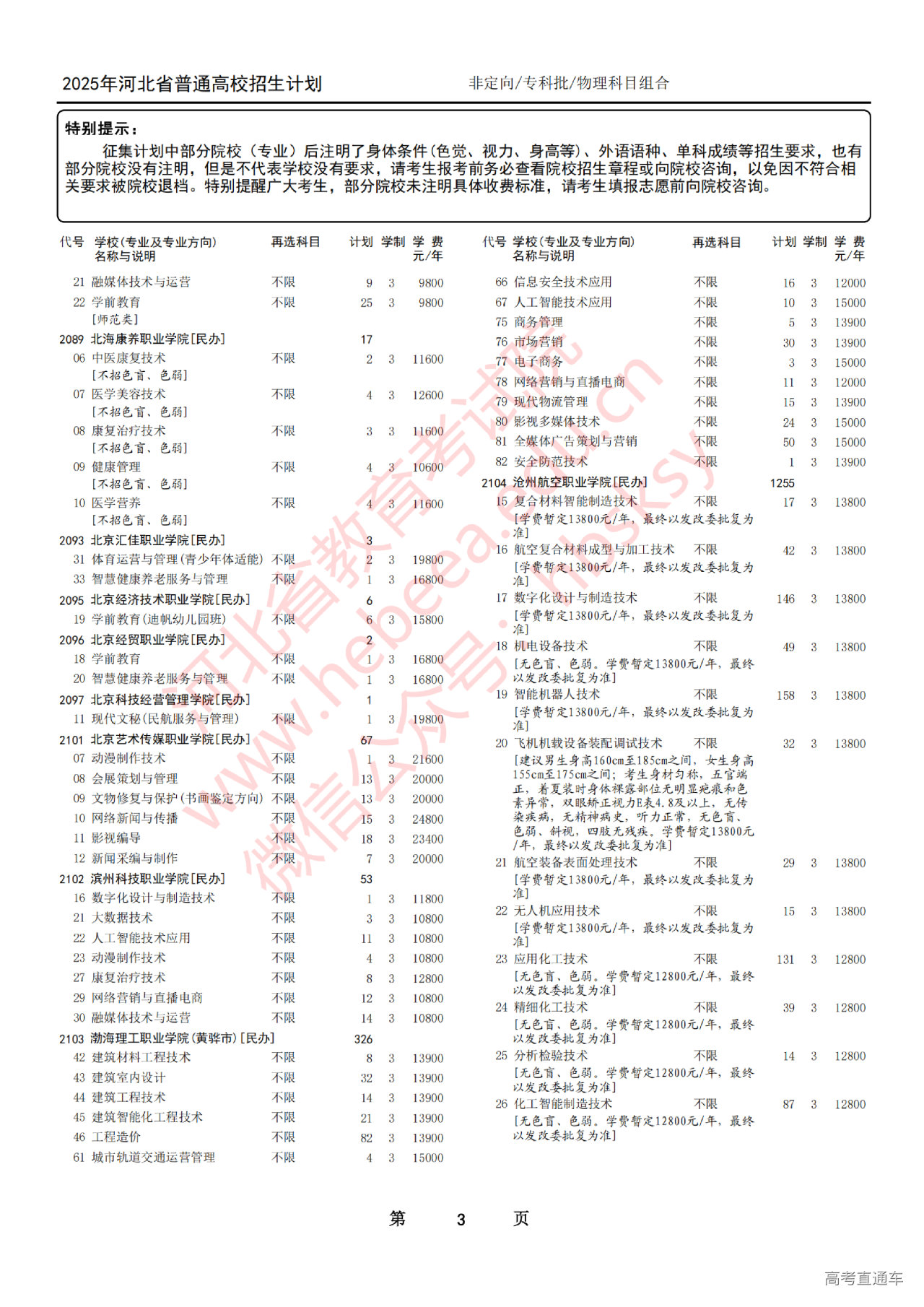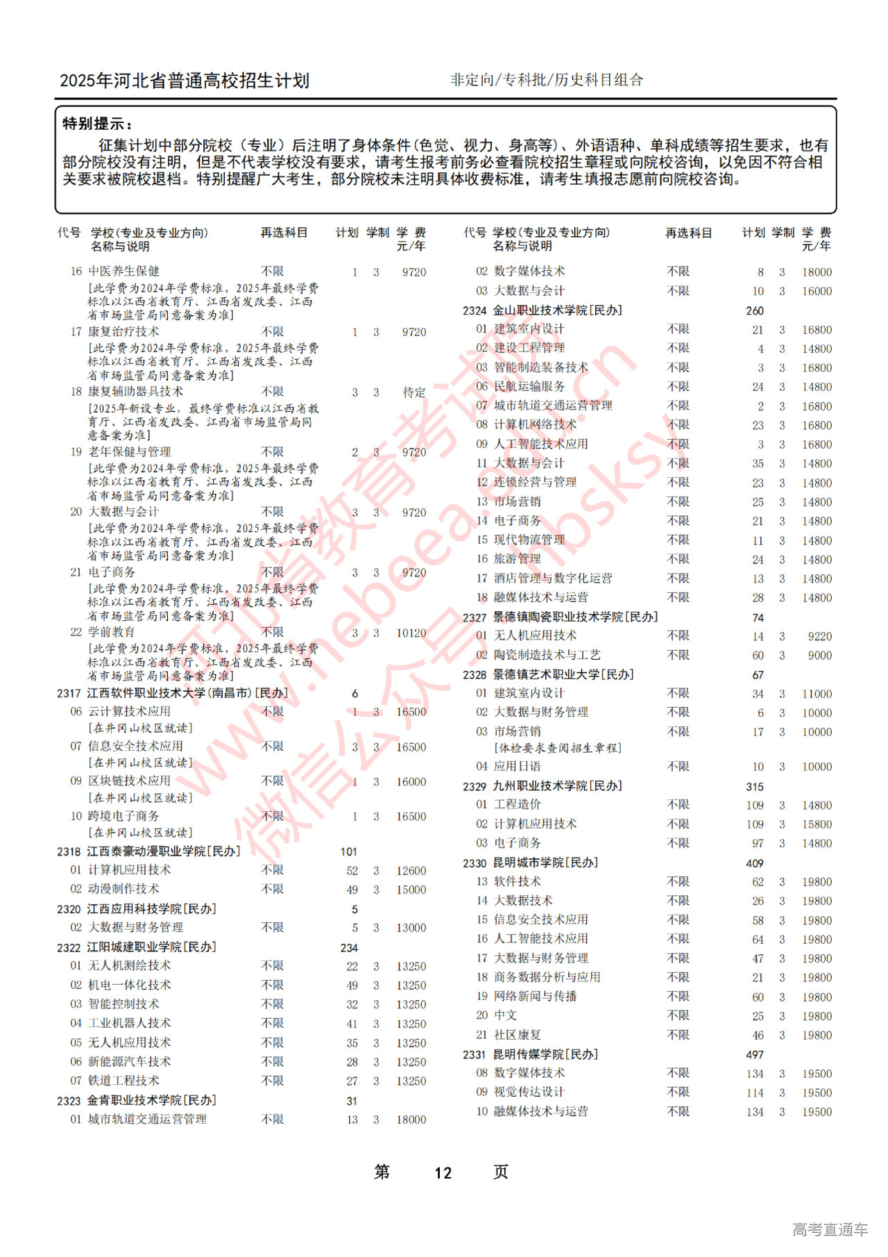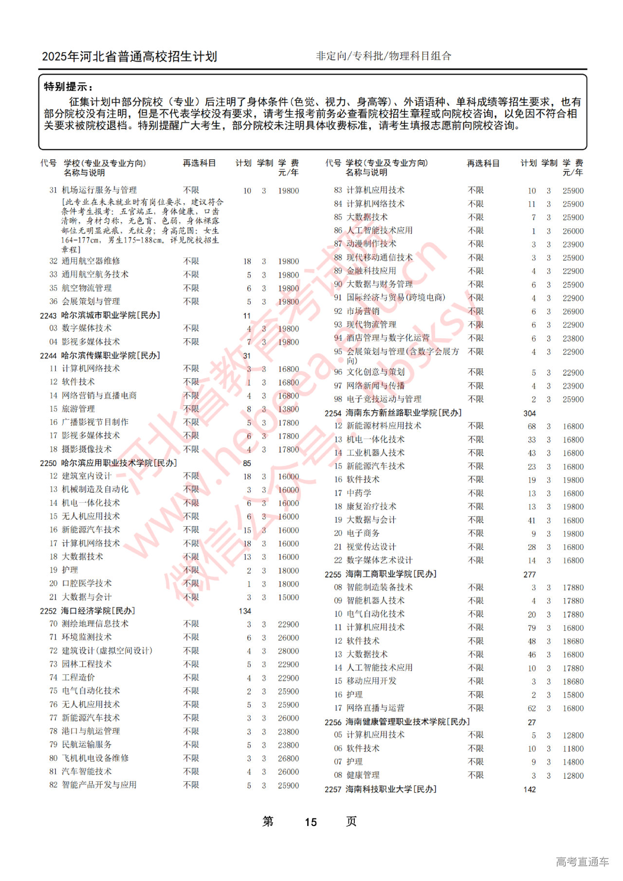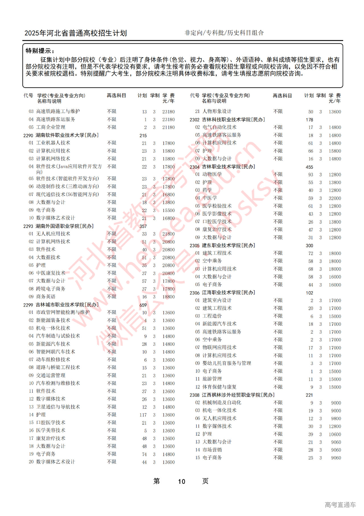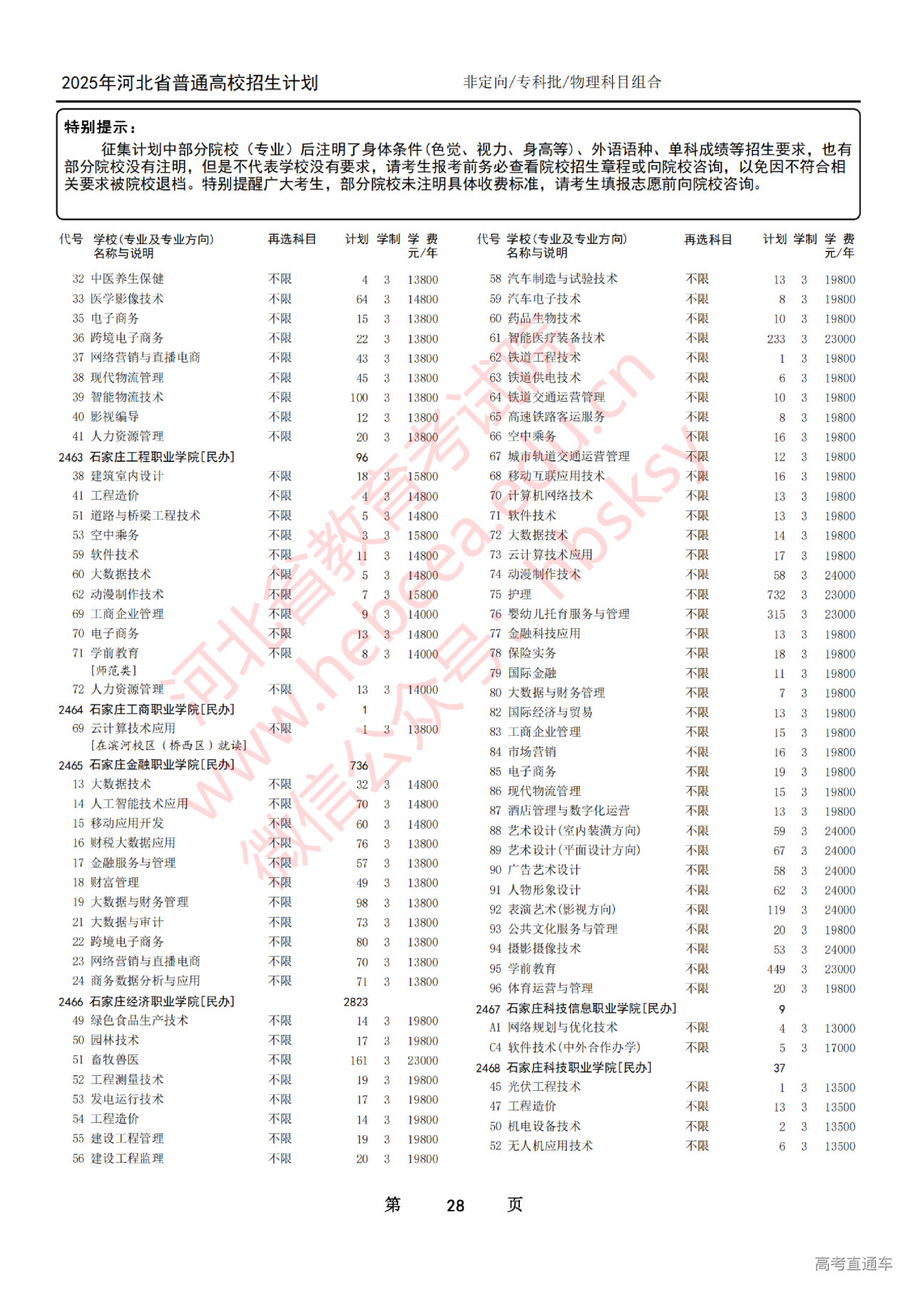 2025年河北省普通高校招生征集志愿计划说明 (专科批第三次征集) 一、本次征集是专科批最后一次征集志愿,公布的征集计划是专科批第二次征集志愿录取结束后院校缺额和新增计划,填报志愿的时间为8月25日12时至8月26日10时,未查到录取结果的考生可根据自身情况填报征集志愿。 二、本次征集录取时,如招生院校录取控制分数线上报考生源不足, 经招生院校申请,可降分录取,低于专科批文化控制分数线的考生可以填报。 三、本次填报志愿操作要求和集中填报志愿时要求一致,请考生登录我院网站,在规定时间内尽早完成志愿填报。在本次志愿填报截止时间前,考生可多次登录志愿填报系统进行志愿修改和保存并提交,最终以其网上最后一次修改并保存提交成功的志愿为准。 四、考生要切实增强安全意识,严格保管用户名及密码,密码设置不要过于简单,不要将密码告诉他人,不要让他人代为操作,以防志愿填报信息泄露或被他人篡改。遗忘密码的考生可在系统登录页面点击“密码重置”,进行重置密码操作。登录成功后,系统将向考生报名时预留的手机号码发送短信予以提示,如考生本人未登录而收到登录短信,请及时修改密码。 五、考生身体条件以高考体检表记载为准。部分院校专业对考生的身高、体重、视力、色觉、单科成绩等有要求,部分院校学费较高,请考生认真查阅拟填报院校招生章程或咨询院校。 六、本征集计划采用PDF格式公布,请考生使用PDF阅读器查看。部分浏览器自带的PDF阅读器浏览时存在缺字现象,遇到这种情况请考生下载正版PDF阅读器进行查看。 七、特别提醒:志愿是考生本人升学意愿的真实表达,是投档及录取的依据,如被高校录取,则不能退档。考生须慎重填报并对所填志愿负责。