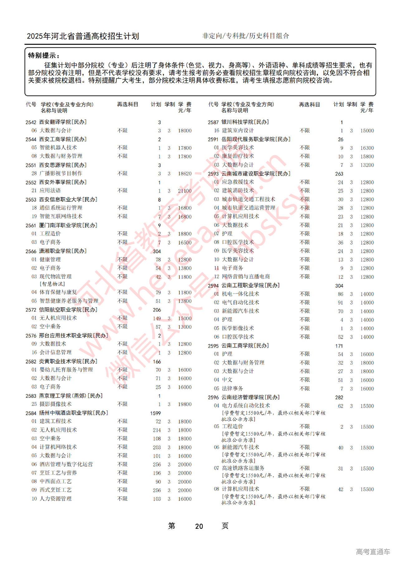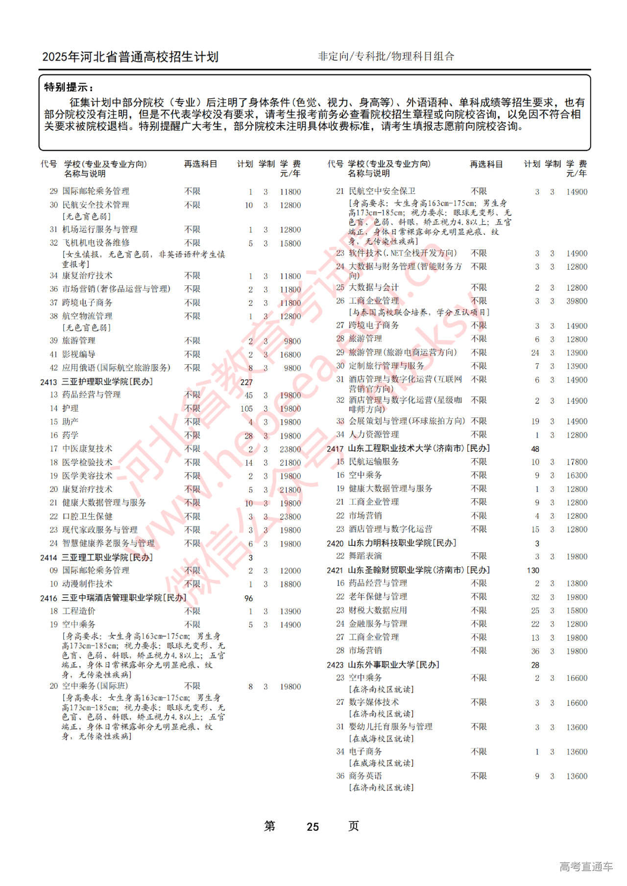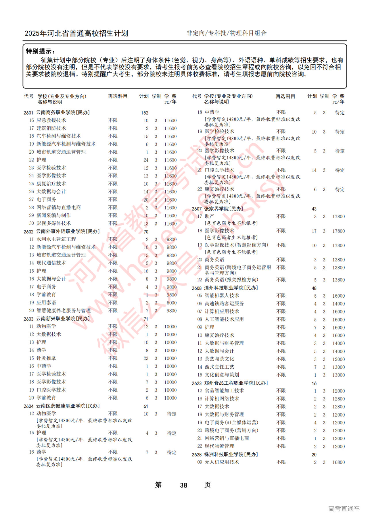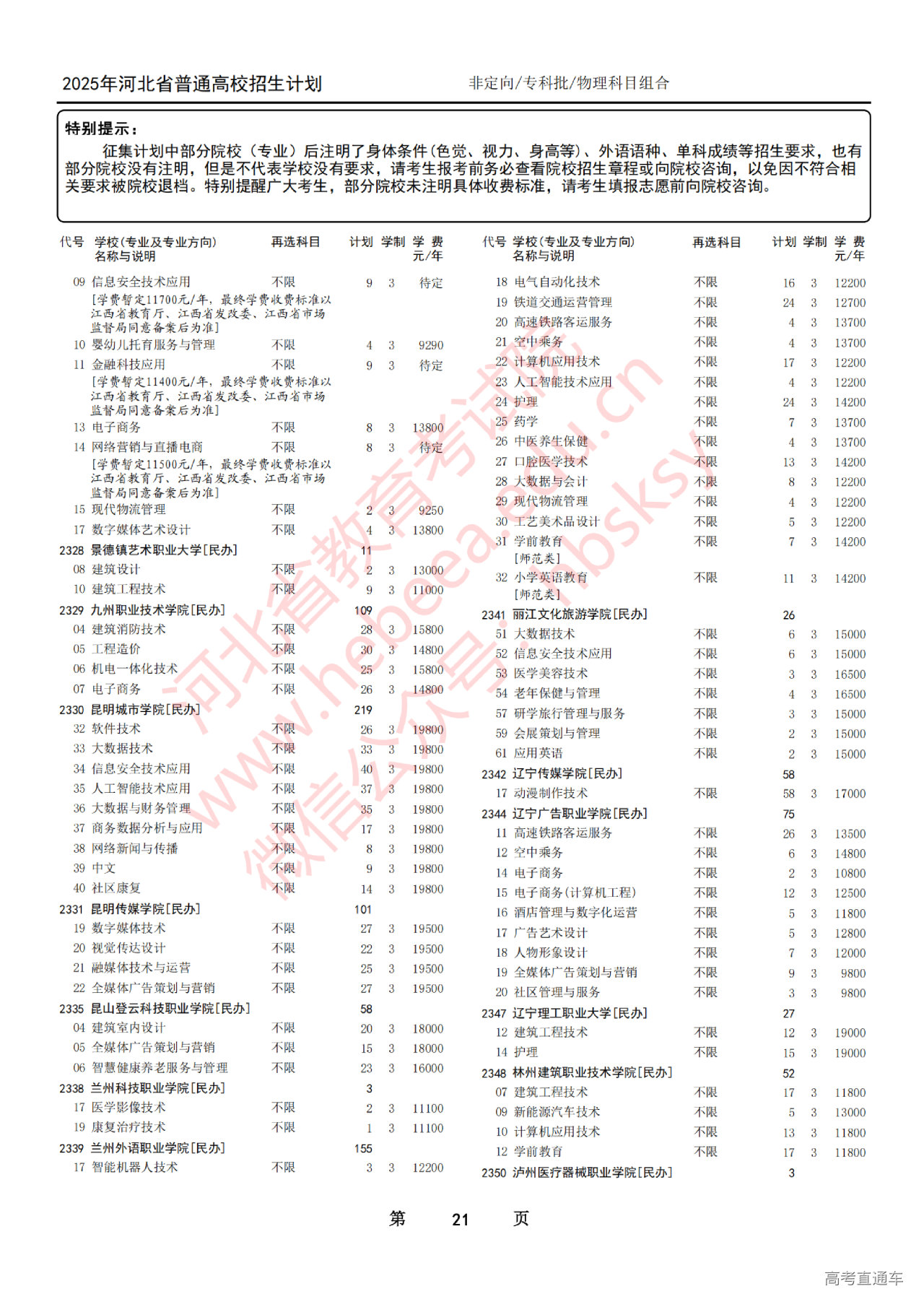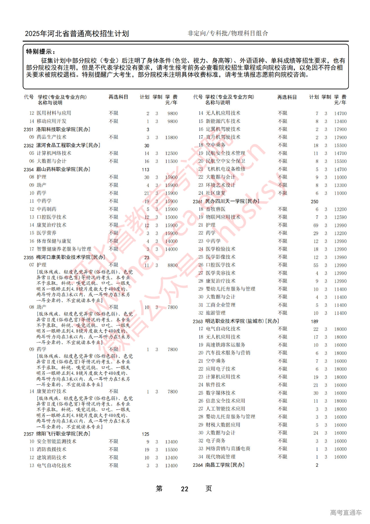 2025年河北省普通高校招生征集志愿计划说明 (专科批第三次征集) 一、本次征集是专科批最后一次征集志愿,公布的征集计划是专科批第二次征集志愿录取结束后院校缺额和新增计划,填报志愿的时间为8月25日12时至8月26日10时,未查到录取结果的考生可根据自身情况填报征集志愿。 二、本次征集录取时,如招生院校录取控制分数线上报考生源不足, 经招生院校申请,可降分录取,低于专科批文化控制分数线的考生可以填报。 三、本次填报志愿操作要求和集中填报志愿时要求一致,请考生登录我院网站,在规定时间内尽早完成志愿填报。在本次志愿填报截止时间前,考生可多次登录志愿填报系统进行志愿修改和保存并提交,最终以其网上最后一次修改并保存提交成功的志愿为准。 四、考生要切实增强安全意识,严格保管用户名及密码,密码设置不要过于简单,不要将密码告诉他人,不要让他人代为操作,以防志愿填报信息泄露或被他人篡改。遗忘密码的考生可在系统登录页面点击“密码重置”,进行重置密码操作。登录成功后,系统将向考生报名时预留的手机号码发送短信予以提示,如考生本人未登录而收到登录短信,请及时修改密码。 五、考生身体条件以高考体检表记载为准。部分院校专业对考生的身高、体重、视力、色觉、单科成绩等有要求,部分院校学费较高,请考生认真查阅拟填报院校招生章程或咨询院校。 六、本征集计划采用PDF格式公布,请考生使用PDF阅读器查看。部分浏览器自带的PDF阅读器浏览时存在缺字现象,遇到这种情况请考生下载正版PDF阅读器进行查看。 七、特别提醒:志愿是考生本人升学意愿的真实表达,是投档及录取的依据,如被高校录取,则不能退档。考生须慎重填报并对所填志愿负责。