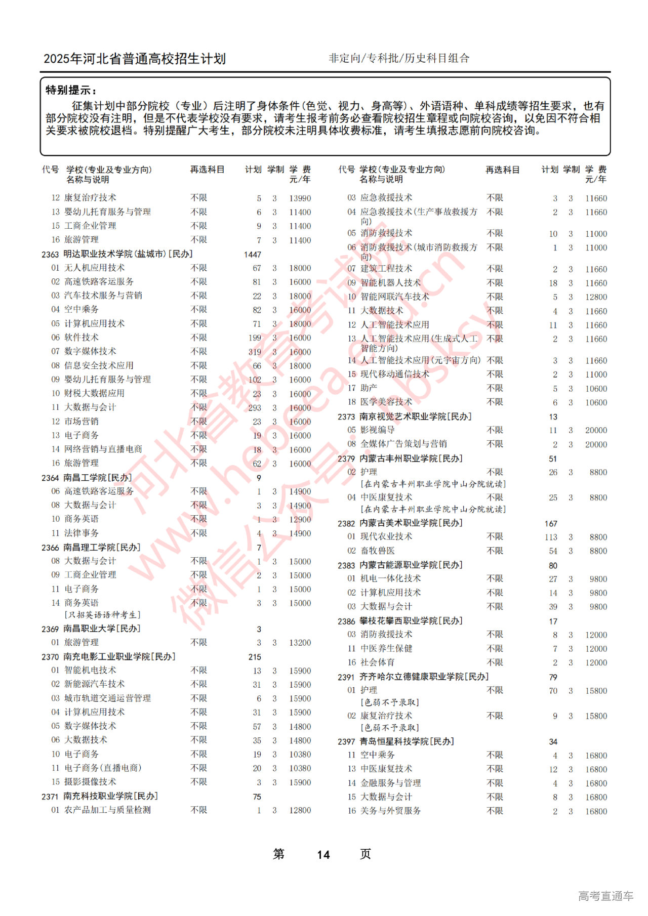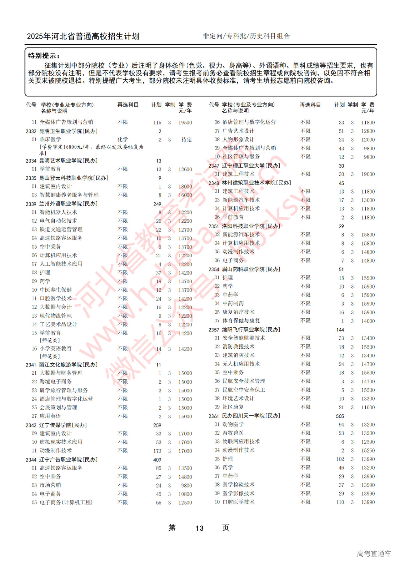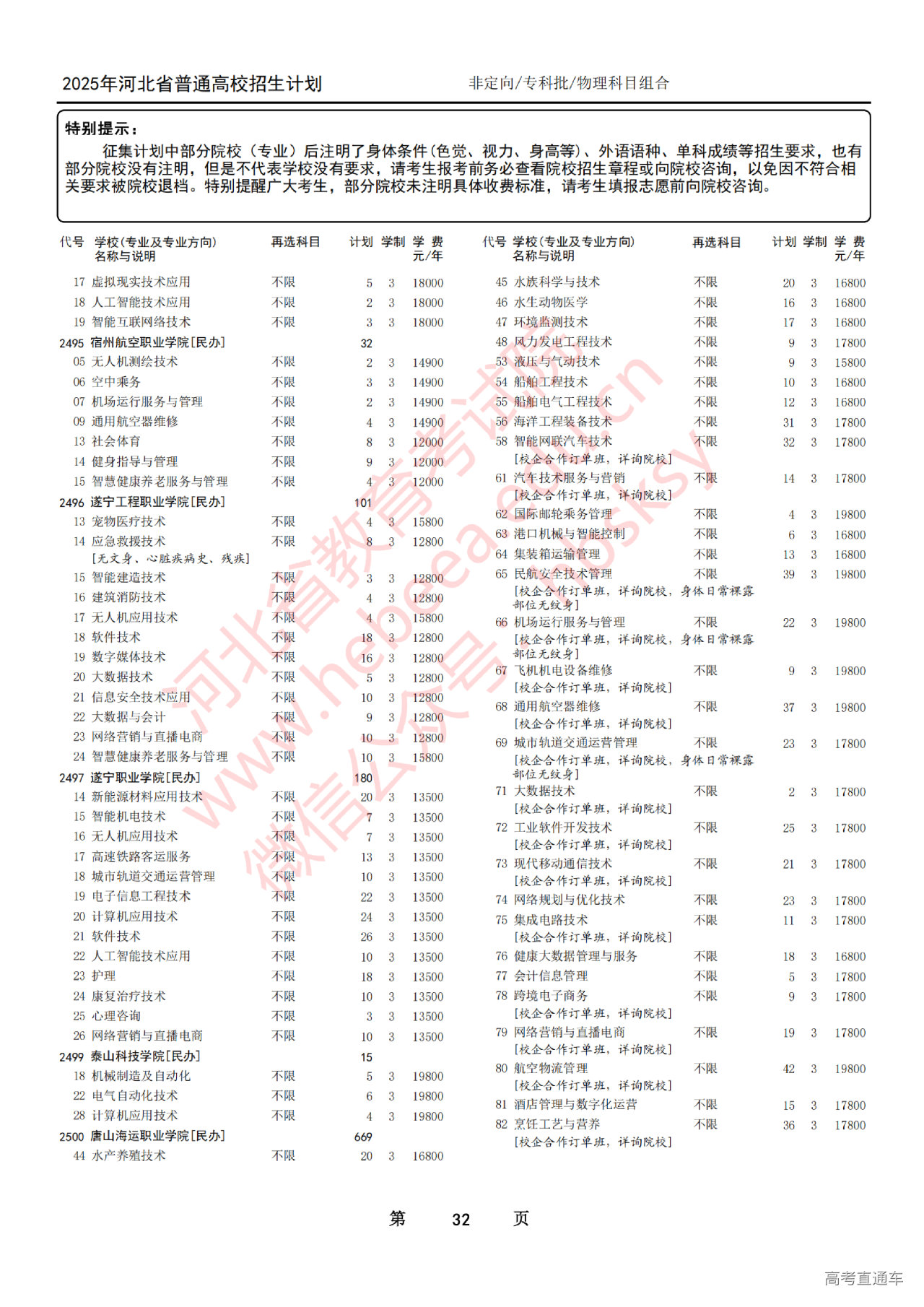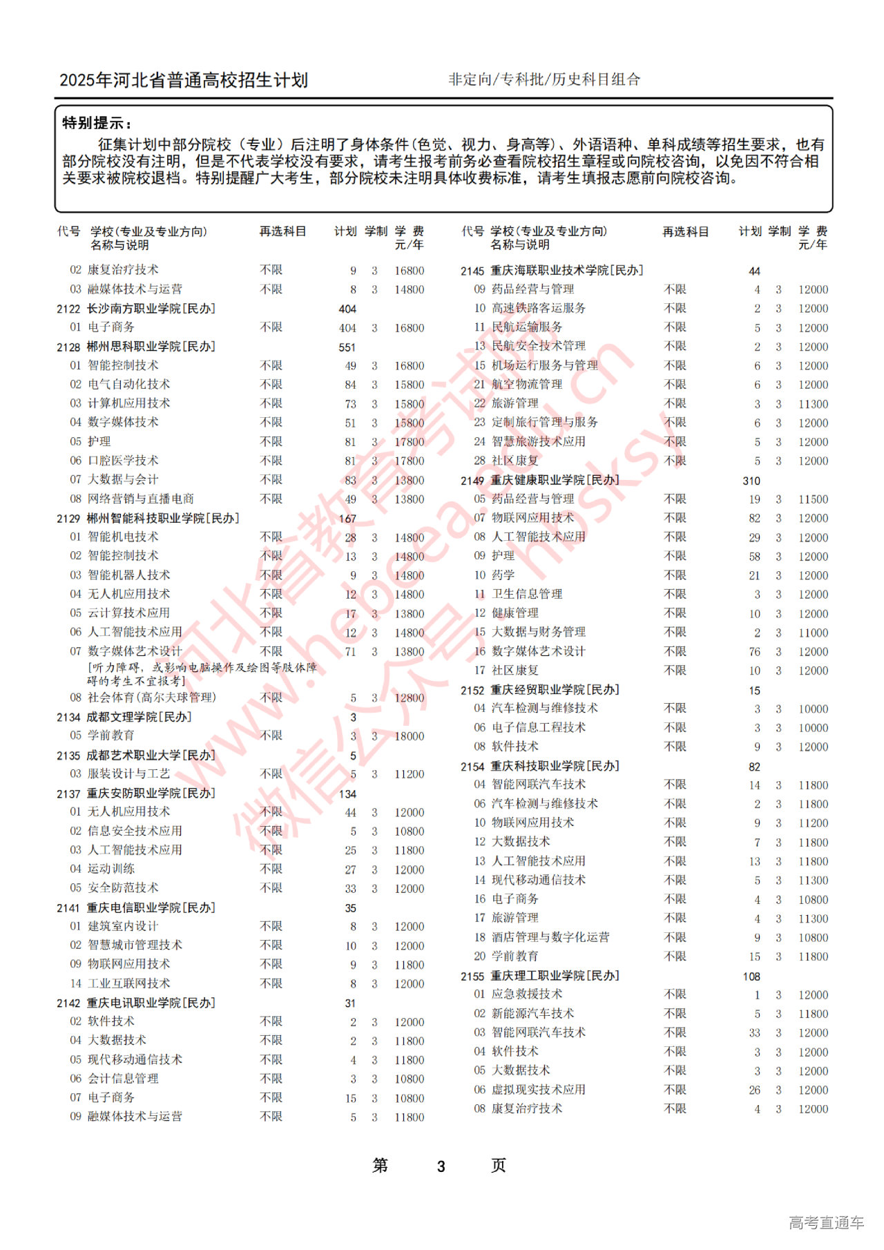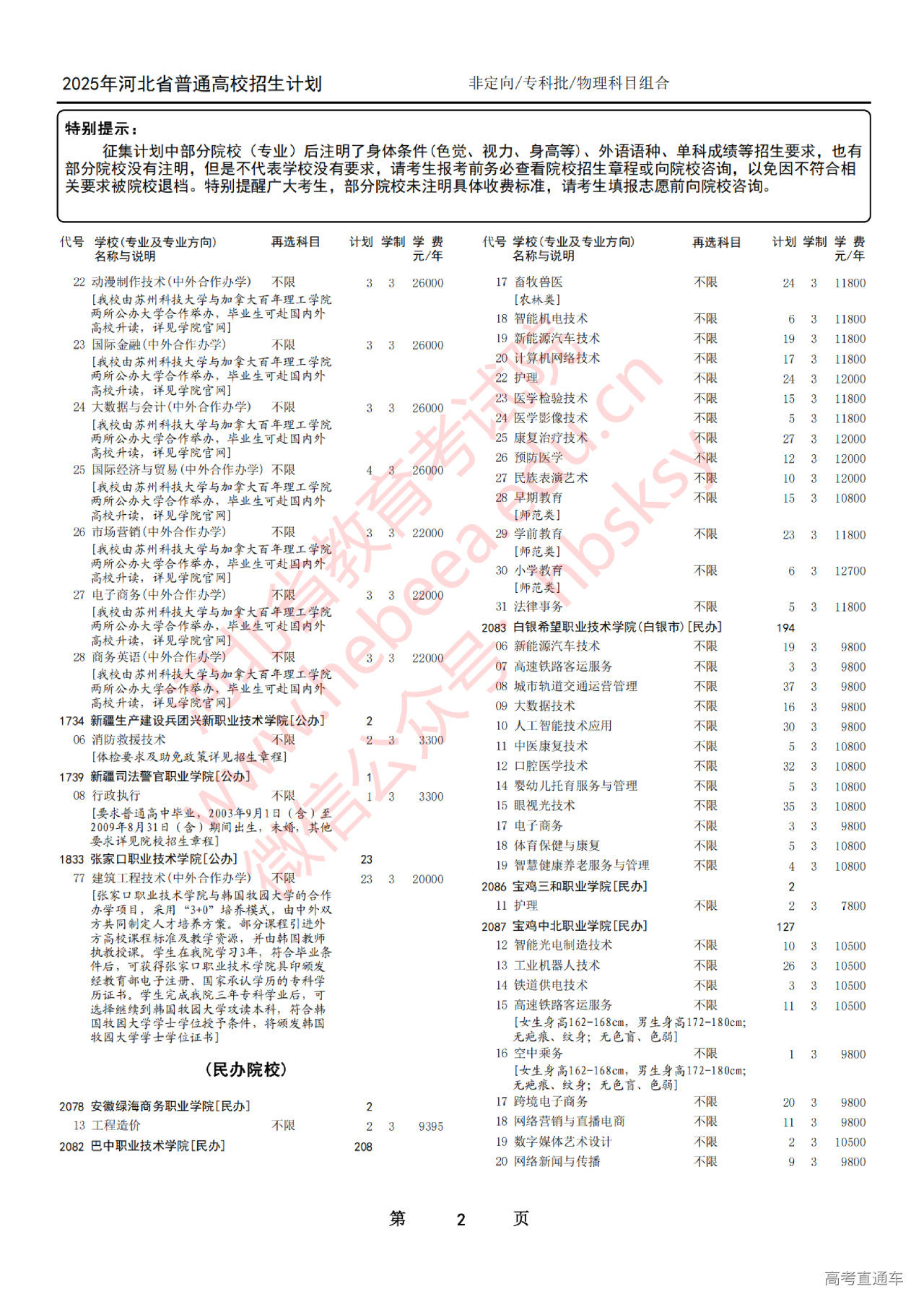2025年河北省普通高校招生征集志愿计划说明 (专科批第三次征集) 一、本次征集是专科批最后一次征集志愿,公布的征集计划是专科批第二次征集志愿录取结束后院校缺额和新增计划,填报志愿的时间为8月25日12时至8月26日10时,未查到录取结果的考生可根据自身情况填报征集志愿。 二、本次征集录取时,如招生院校录取控制分数线上报考生源不足, 经招生院校申请,可降分录取,低于专科批文化控制分数线的考生可以填报。 三、本次填报志愿操作要求和集中填报志愿时要求一致,请考生登录我院网站,在规定时间内尽早完成志愿填报。在本次志愿填报截止时间前,考生可多次登录志愿填报系统进行志愿修改和保存并提交,最终以其网上最后一次修改并保存提交成功的志愿为准。 四、考生要切实增强安全意识,严格保管用户名及密码,密码设置不要过于简单,不要将密码告诉他人,不要让他人代为操作,以防志愿填报信息泄露或被他人篡改。遗忘密码的考生可在系统登录页面点击“密码重置”,进行重置密码操作。登录成功后,系统将向考生报名时预留的手机号码发送短信予以提示,如考生本人未登录而收到登录短信,请及时修改密码。 五、考生身体条件以高考体检表记载为准。部分院校专业对考生的身高、体重、视力、色觉、单科成绩等有要求,部分院校学费较高,请考生认真查阅拟填报院校招生章程或咨询院校。 六、本征集计划采用PDF格式公布,请考生使用PDF阅读器查看。部分浏览器自带的PDF阅读器浏览时存在缺字现象,遇到这种情况请考生下载正版PDF阅读器进行查看。 七、特别提醒:志愿是考生本人升学意愿的真实表达,是投档及录取的依据,如被高校录取,则不能退档。考生须慎重填报并对所填志愿负责。