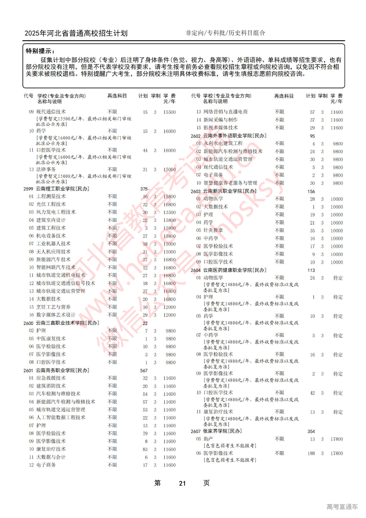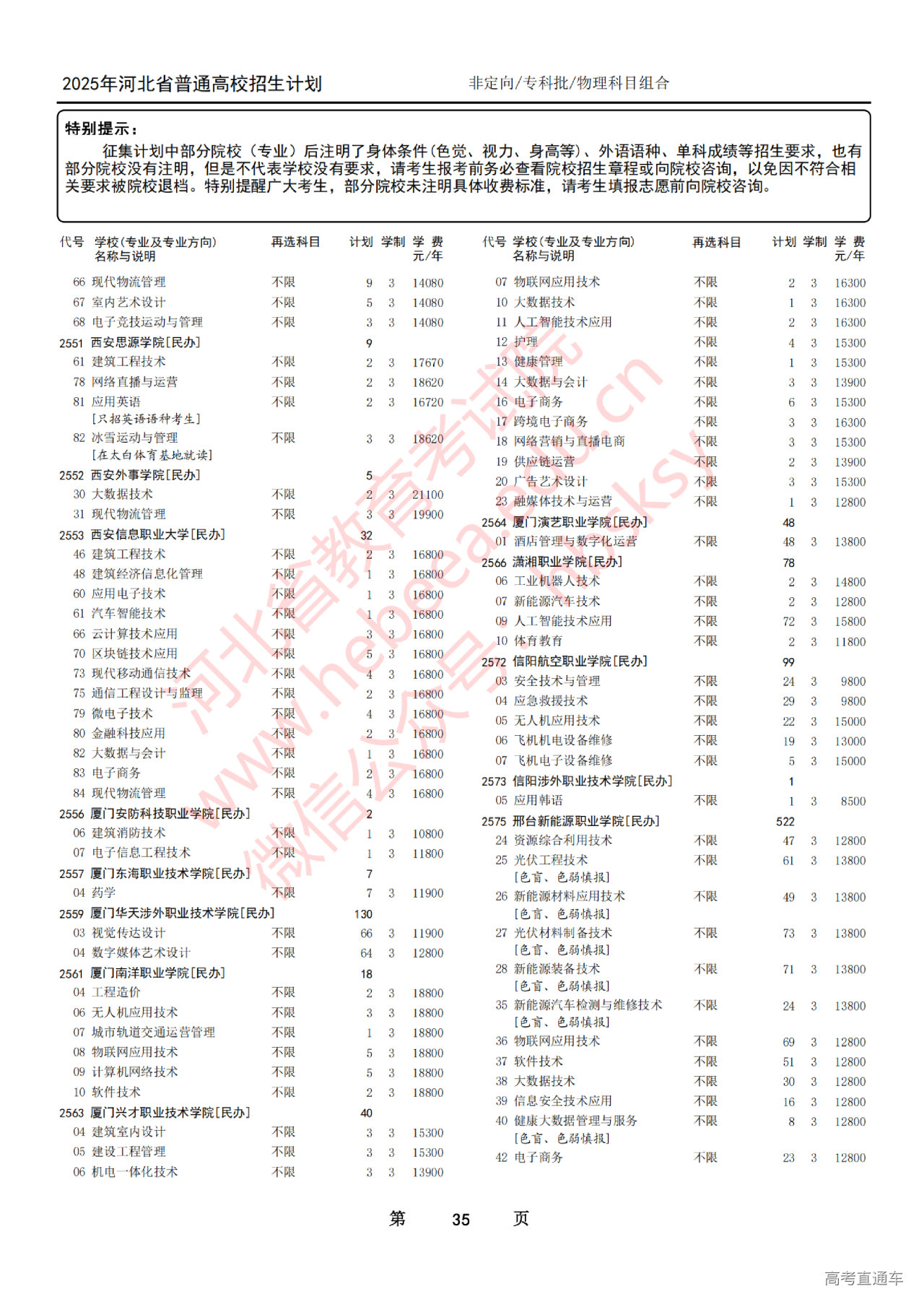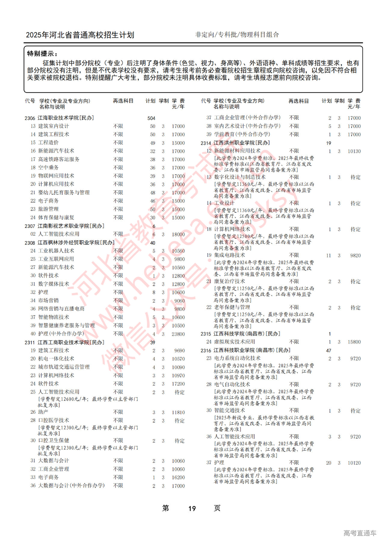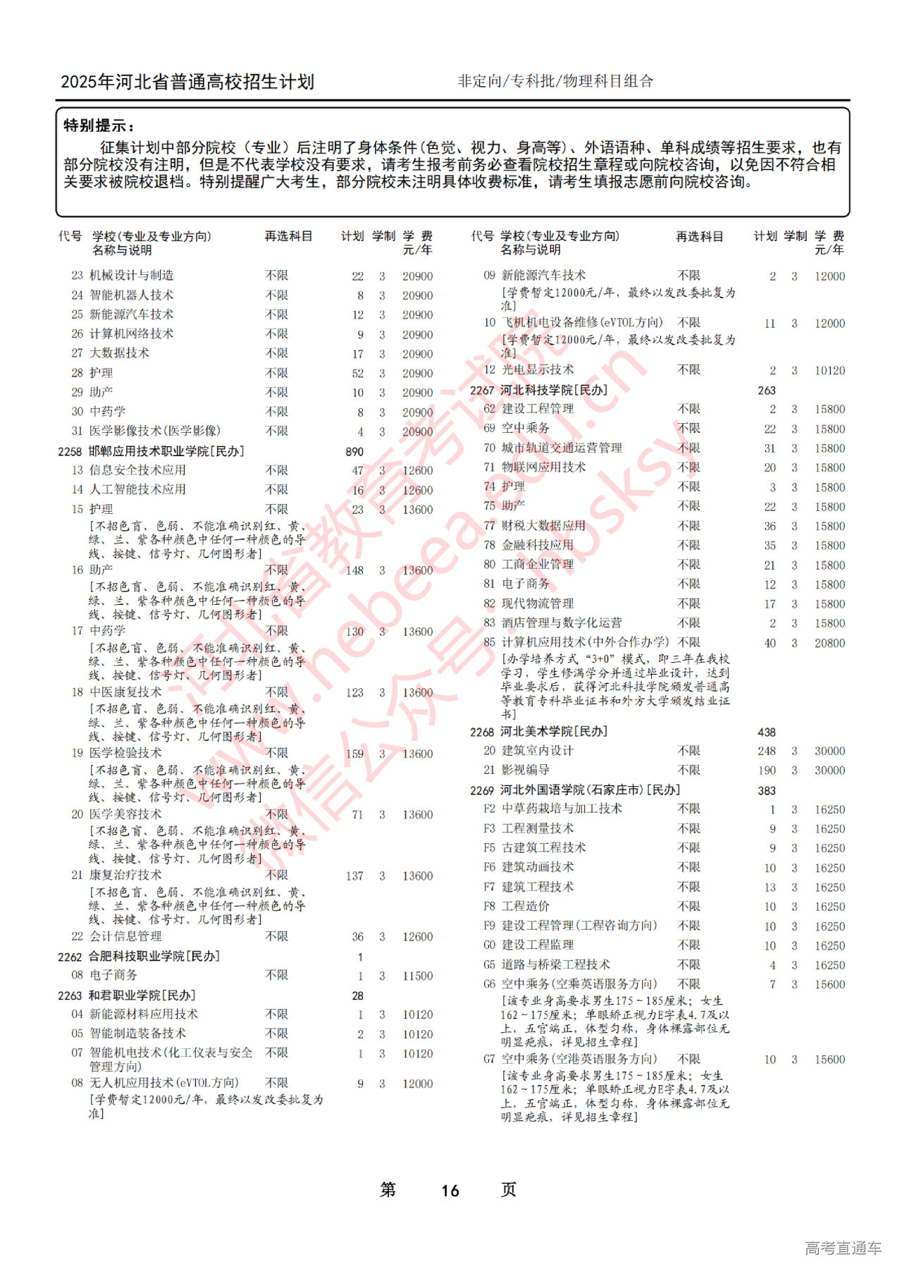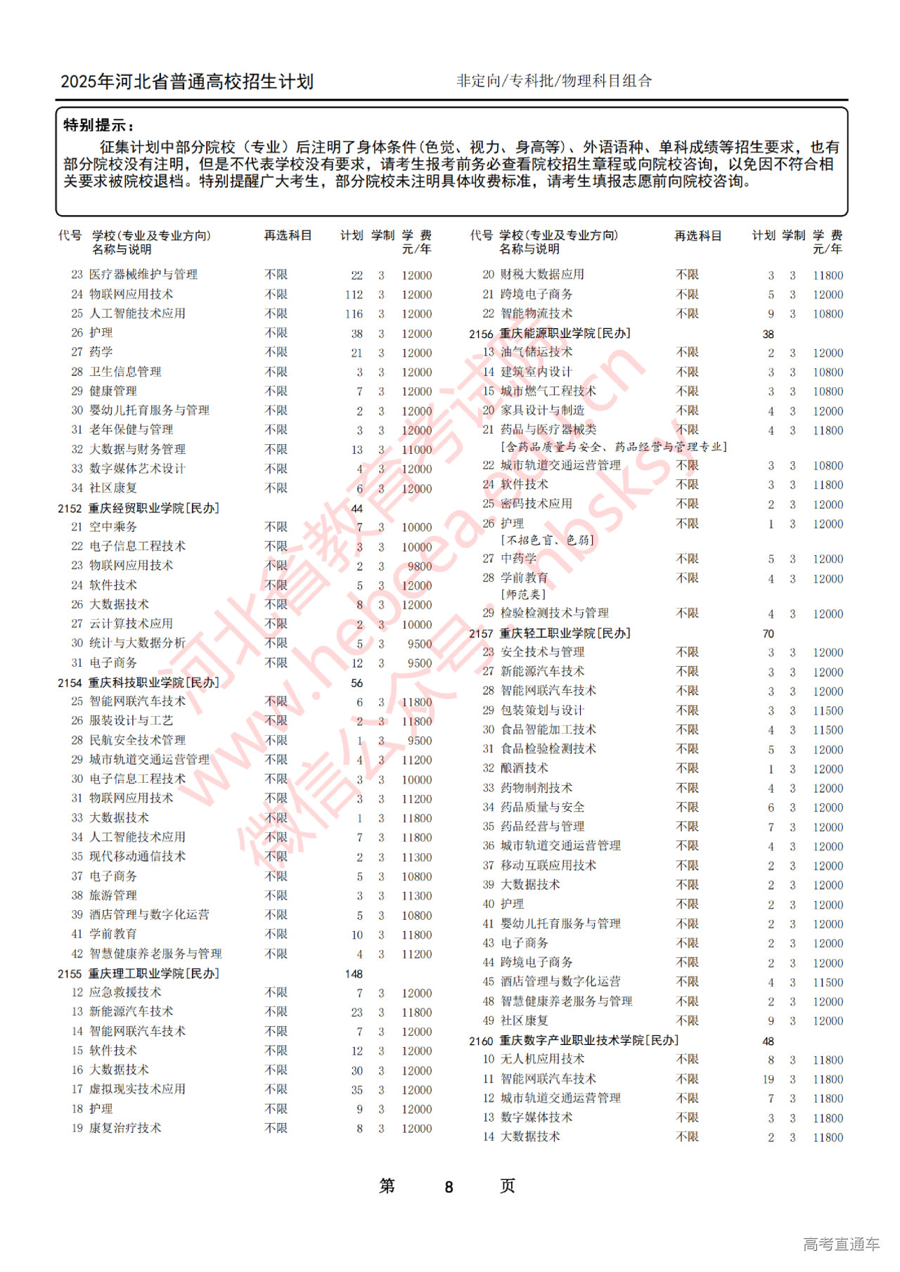 2025年河北省普通高校招生征集志愿计划说明 (专科批第三次征集) 一、本次征集是专科批最后一次征集志愿,公布的征集计划是专科批第二次征集志愿录取结束后院校缺额和新增计划,填报志愿的时间为8月25日12时至8月26日10时,未查到录取结果的考生可根据自身情况填报征集志愿。 二、本次征集录取时,如招生院校录取控制分数线上报考生源不足, 经招生院校申请,可降分录取,低于专科批文化控制分数线的考生可以填报。 三、本次填报志愿操作要求和集中填报志愿时要求一致,请考生登录我院网站,在规定时间内尽早完成志愿填报。在本次志愿填报截止时间前,考生可多次登录志愿填报系统进行志愿修改和保存并提交,最终以其网上最后一次修改并保存提交成功的志愿为准。 四、考生要切实增强安全意识,严格保管用户名及密码,密码设置不要过于简单,不要将密码告诉他人,不要让他人代为操作,以防志愿填报信息泄露或被他人篡改。遗忘密码的考生可在系统登录页面点击“密码重置”,进行重置密码操作。登录成功后,系统将向考生报名时预留的手机号码发送短信予以提示,如考生本人未登录而收到登录短信,请及时修改密码。 五、考生身体条件以高考体检表记载为准。部分院校专业对考生的身高、体重、视力、色觉、单科成绩等有要求,部分院校学费较高,请考生认真查阅拟填报院校招生章程或咨询院校。 六、本征集计划采用PDF格式公布,请考生使用PDF阅读器查看。部分浏览器自带的PDF阅读器浏览时存在缺字现象,遇到这种情况请考生下载正版PDF阅读器进行查看。 七、特别提醒:志愿是考生本人升学意愿的真实表达,是投档及录取的依据,如被高校录取,则不能退档。考生须慎重填报并对所填志愿负责。