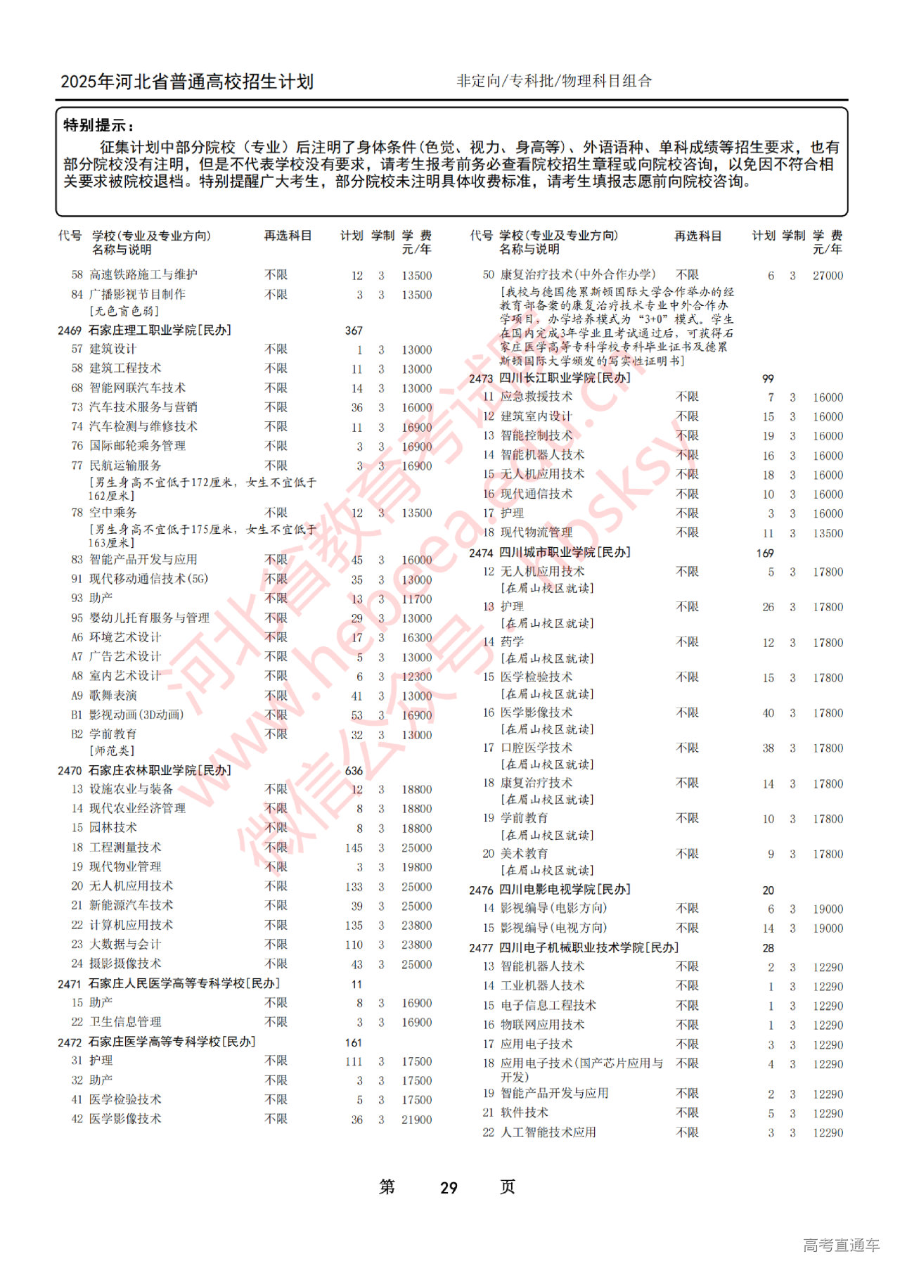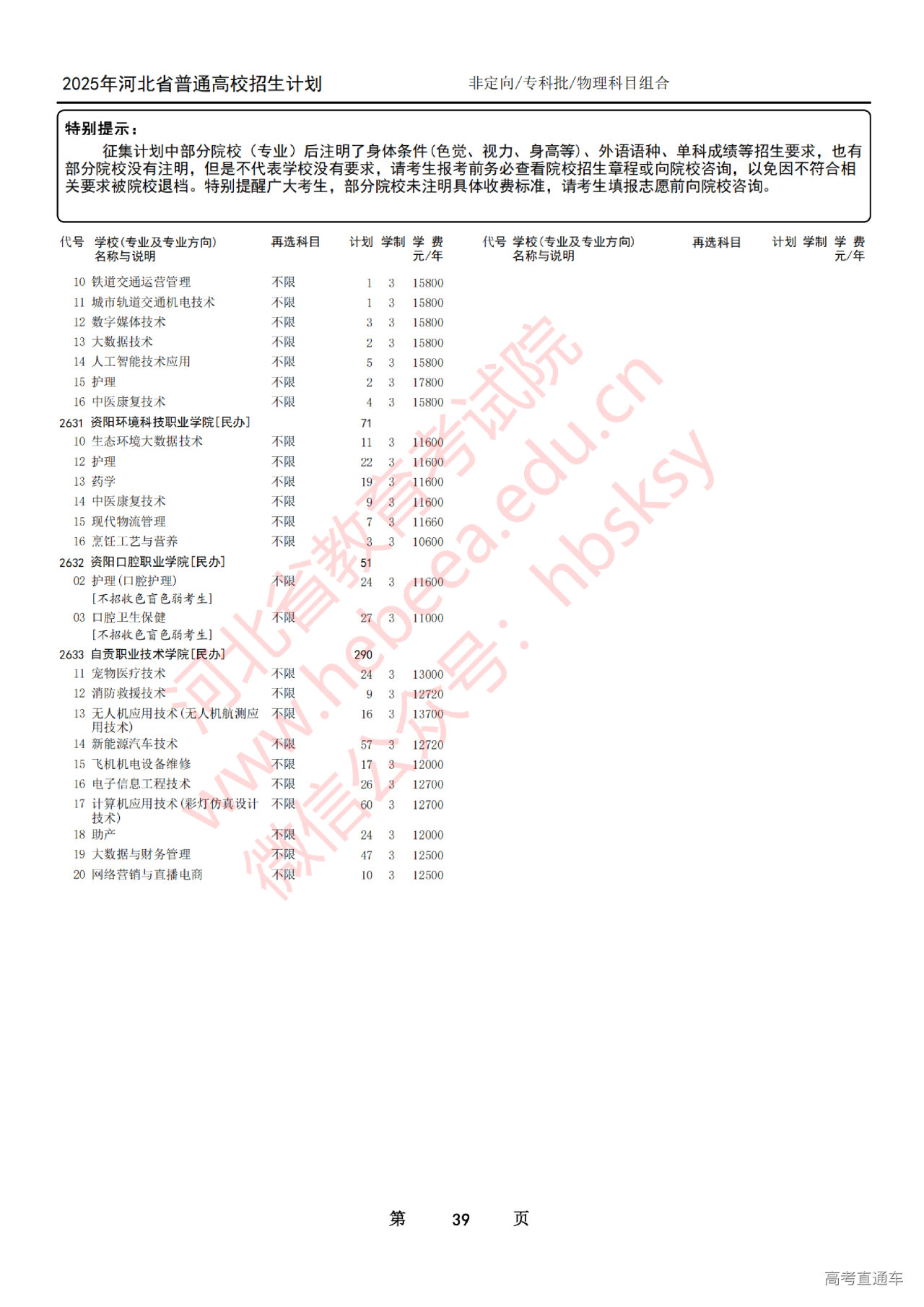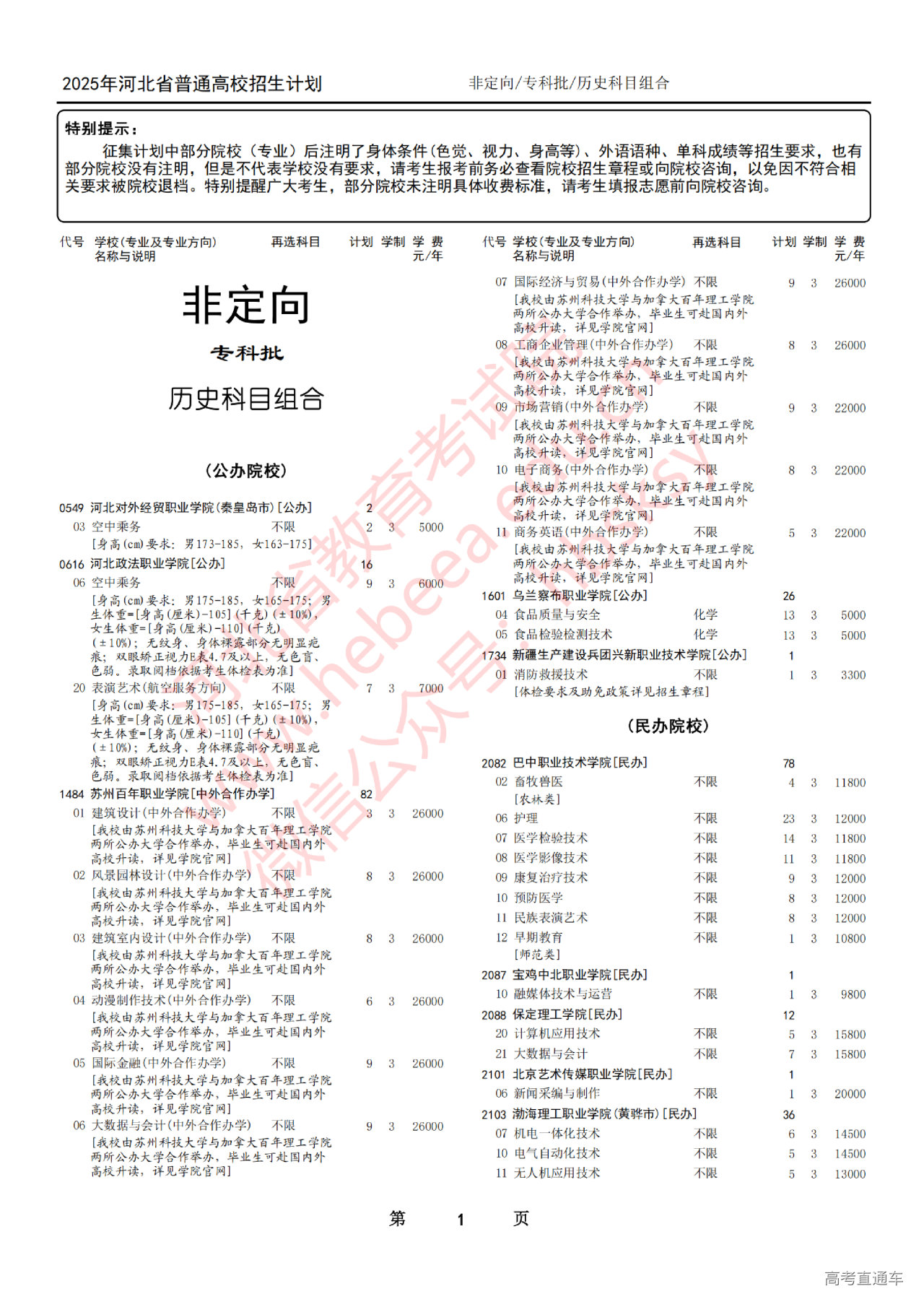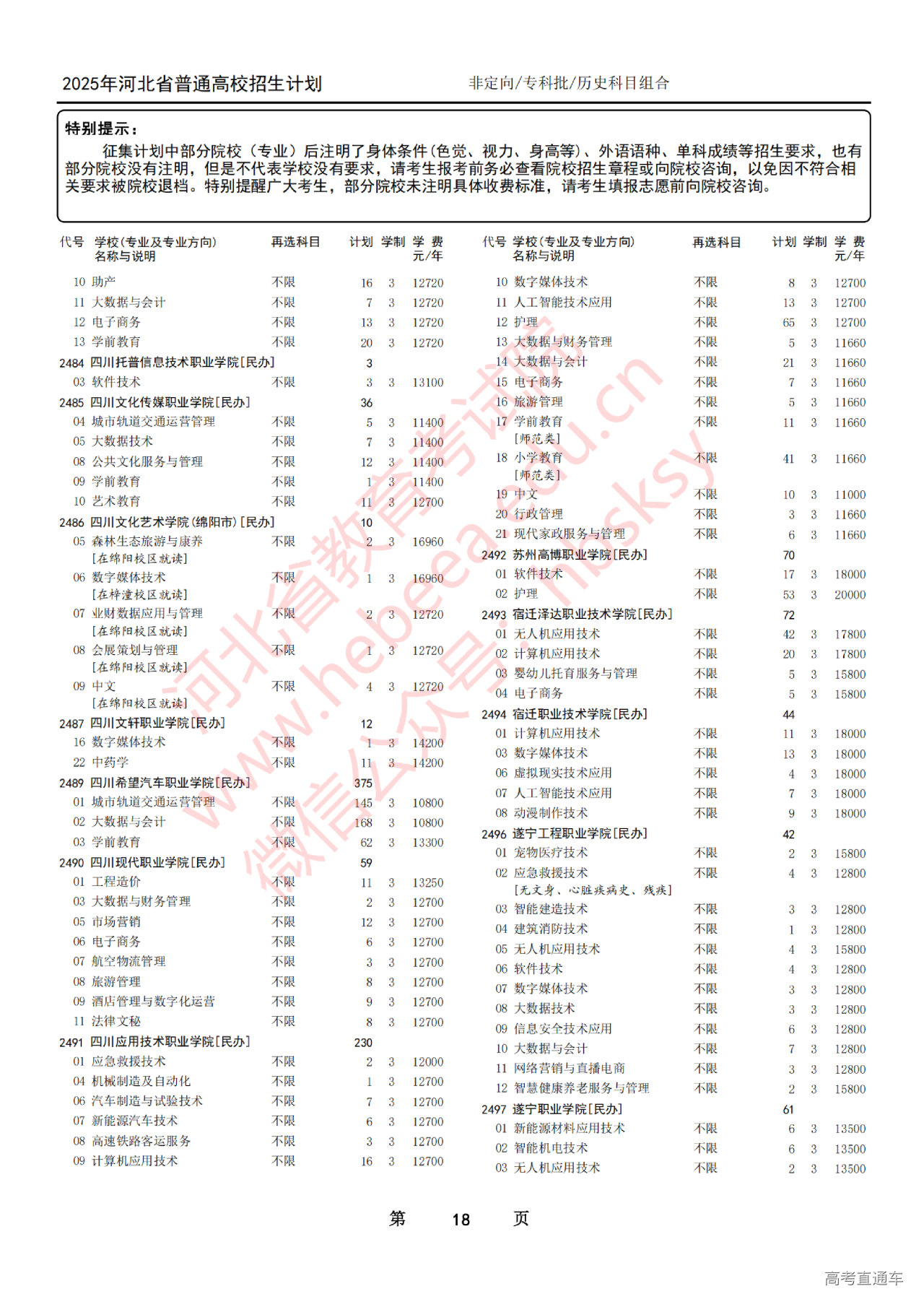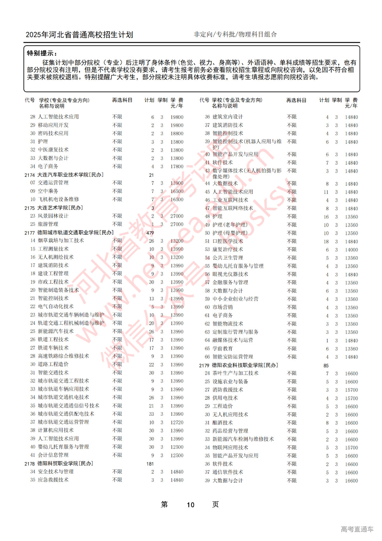 2025年河北省普通高校招生征集志愿计划说明 (专科批第三次征集) 一、本次征集是专科批最后一次征集志愿,公布的征集计划是专科批第二次征集志愿录取结束后院校缺额和新增计划,填报志愿的时间为8月25日12时至8月26日10时,未查到录取结果的考生可根据自身情况填报征集志愿。 二、本次征集录取时,如招生院校录取控制分数线上报考生源不足, 经招生院校申请,可降分录取,低于专科批文化控制分数线的考生可以填报。 三、本次填报志愿操作要求和集中填报志愿时要求一致,请考生登录我院网站,在规定时间内尽早完成志愿填报。在本次志愿填报截止时间前,考生可多次登录志愿填报系统进行志愿修改和保存并提交,最终以其网上最后一次修改并保存提交成功的志愿为准。 四、考生要切实增强安全意识,严格保管用户名及密码,密码设置不要过于简单,不要将密码告诉他人,不要让他人代为操作,以防志愿填报信息泄露或被他人篡改。遗忘密码的考生可在系统登录页面点击“密码重置”,进行重置密码操作。登录成功后,系统将向考生报名时预留的手机号码发送短信予以提示,如考生本人未登录而收到登录短信,请及时修改密码。 五、考生身体条件以高考体检表记载为准。部分院校专业对考生的身高、体重、视力、色觉、单科成绩等有要求,部分院校学费较高,请考生认真查阅拟填报院校招生章程或咨询院校。 六、本征集计划采用PDF格式公布,请考生使用PDF阅读器查看。部分浏览器自带的PDF阅读器浏览时存在缺字现象,遇到这种情况请考生下载正版PDF阅读器进行查看。 七、特别提醒:志愿是考生本人升学意愿的真实表达,是投档及录取的依据,如被高校录取,则不能退档。考生须慎重填报并对所填志愿负责。