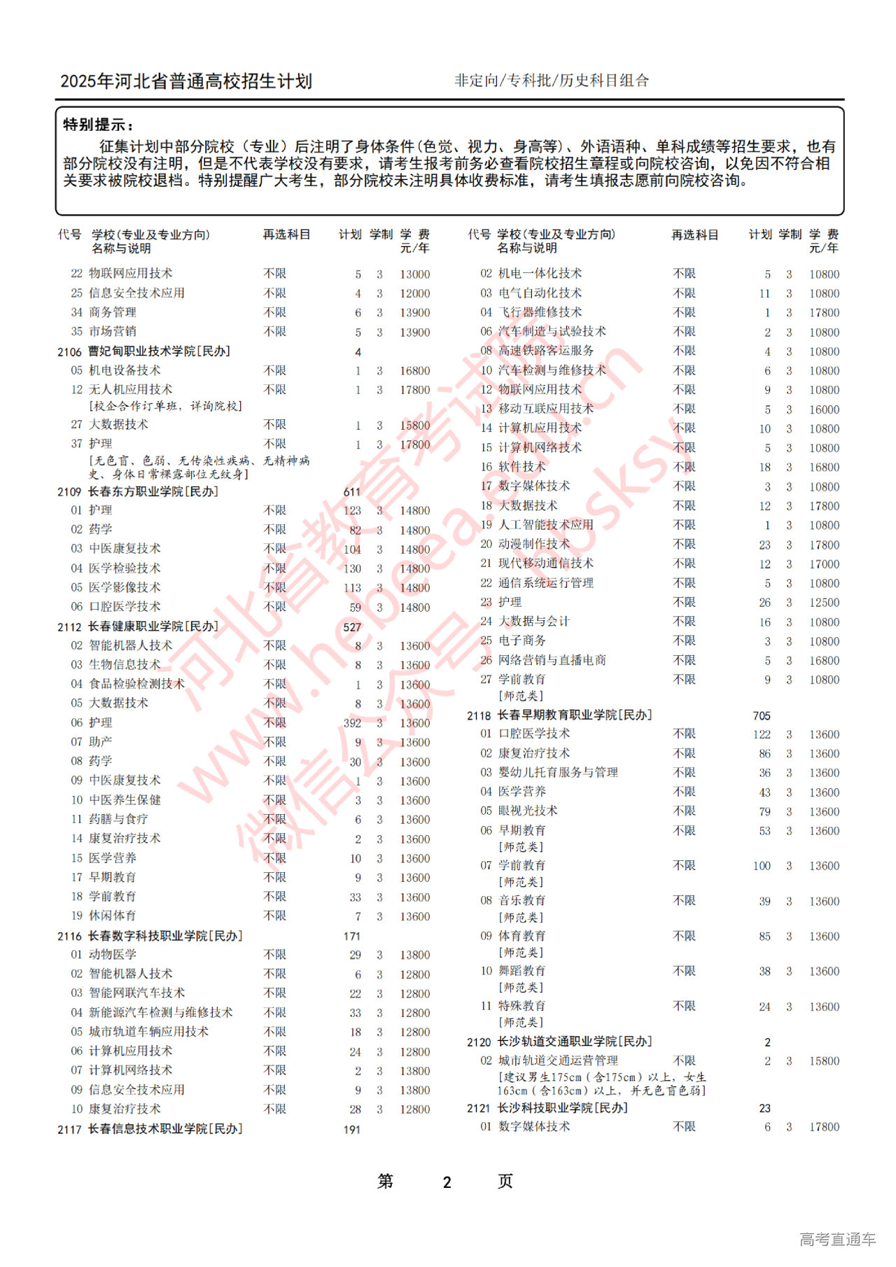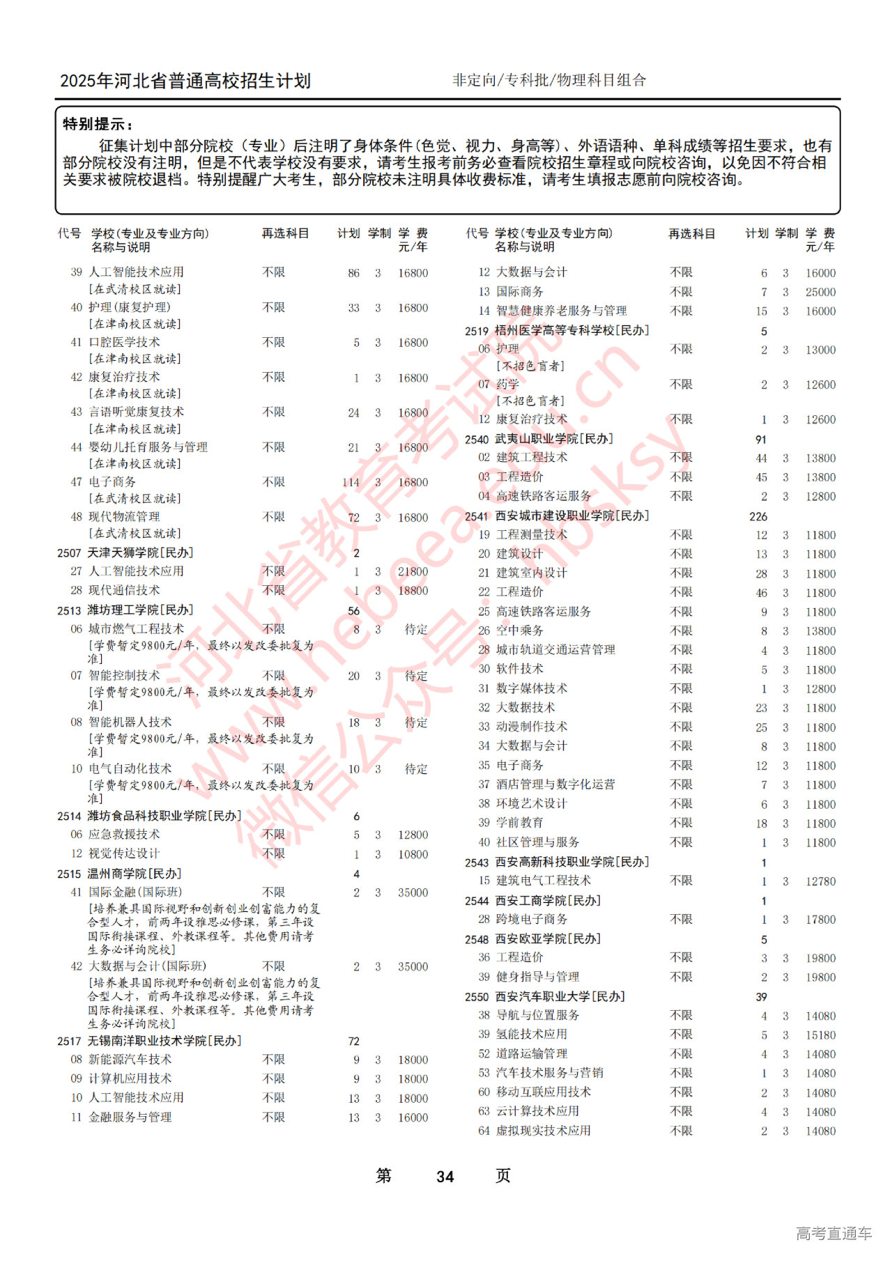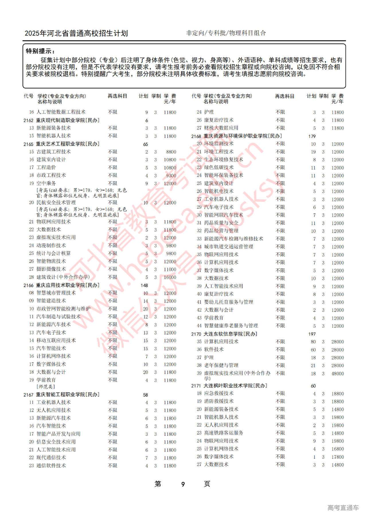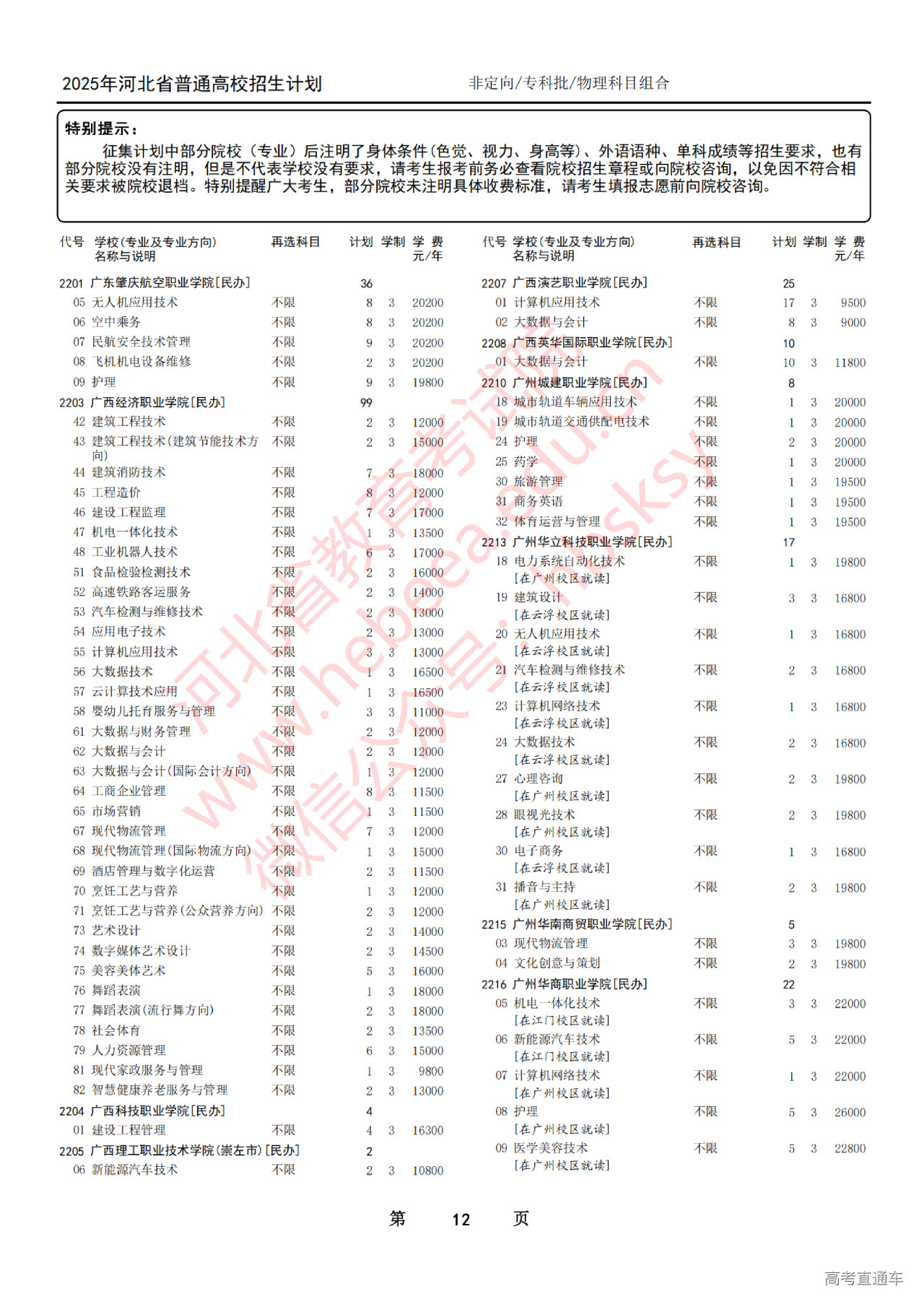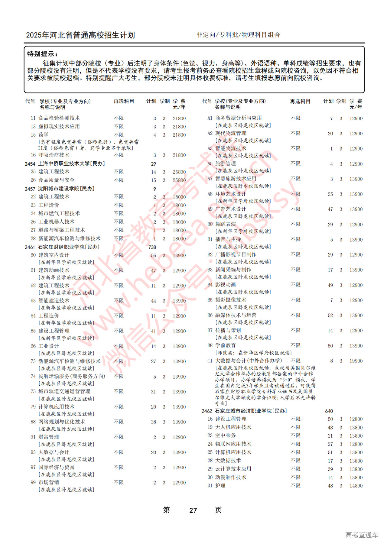 2025年河北省普通高校招生征集志愿计划说明 (专科批第三次征集) 一、本次征集是专科批最后一次征集志愿,公布的征集计划是专科批第二次征集志愿录取结束后院校缺额和新增计划,填报志愿的时间为8月25日12时至8月26日10时,未查到录取结果的考生可根据自身情况填报征集志愿。 二、本次征集录取时,如招生院校录取控制分数线上报考生源不足, 经招生院校申请,可降分录取,低于专科批文化控制分数线的考生可以填报。 三、本次填报志愿操作要求和集中填报志愿时要求一致,请考生登录我院网站,在规定时间内尽早完成志愿填报。在本次志愿填报截止时间前,考生可多次登录志愿填报系统进行志愿修改和保存并提交,最终以其网上最后一次修改并保存提交成功的志愿为准。 四、考生要切实增强安全意识,严格保管用户名及密码,密码设置不要过于简单,不要将密码告诉他人,不要让他人代为操作,以防志愿填报信息泄露或被他人篡改。遗忘密码的考生可在系统登录页面点击“密码重置”,进行重置密码操作。登录成功后,系统将向考生报名时预留的手机号码发送短信予以提示,如考生本人未登录而收到登录短信,请及时修改密码。 五、考生身体条件以高考体检表记载为准。部分院校专业对考生的身高、体重、视力、色觉、单科成绩等有要求,部分院校学费较高,请考生认真查阅拟填报院校招生章程或咨询院校。 六、本征集计划采用PDF格式公布,请考生使用PDF阅读器查看。部分浏览器自带的PDF阅读器浏览时存在缺字现象,遇到这种情况请考生下载正版PDF阅读器进行查看。 七、特别提醒:志愿是考生本人升学意愿的真实表达,是投档及录取的依据,如被高校录取,则不能退档。考生须慎重填报并对所填志愿负责。