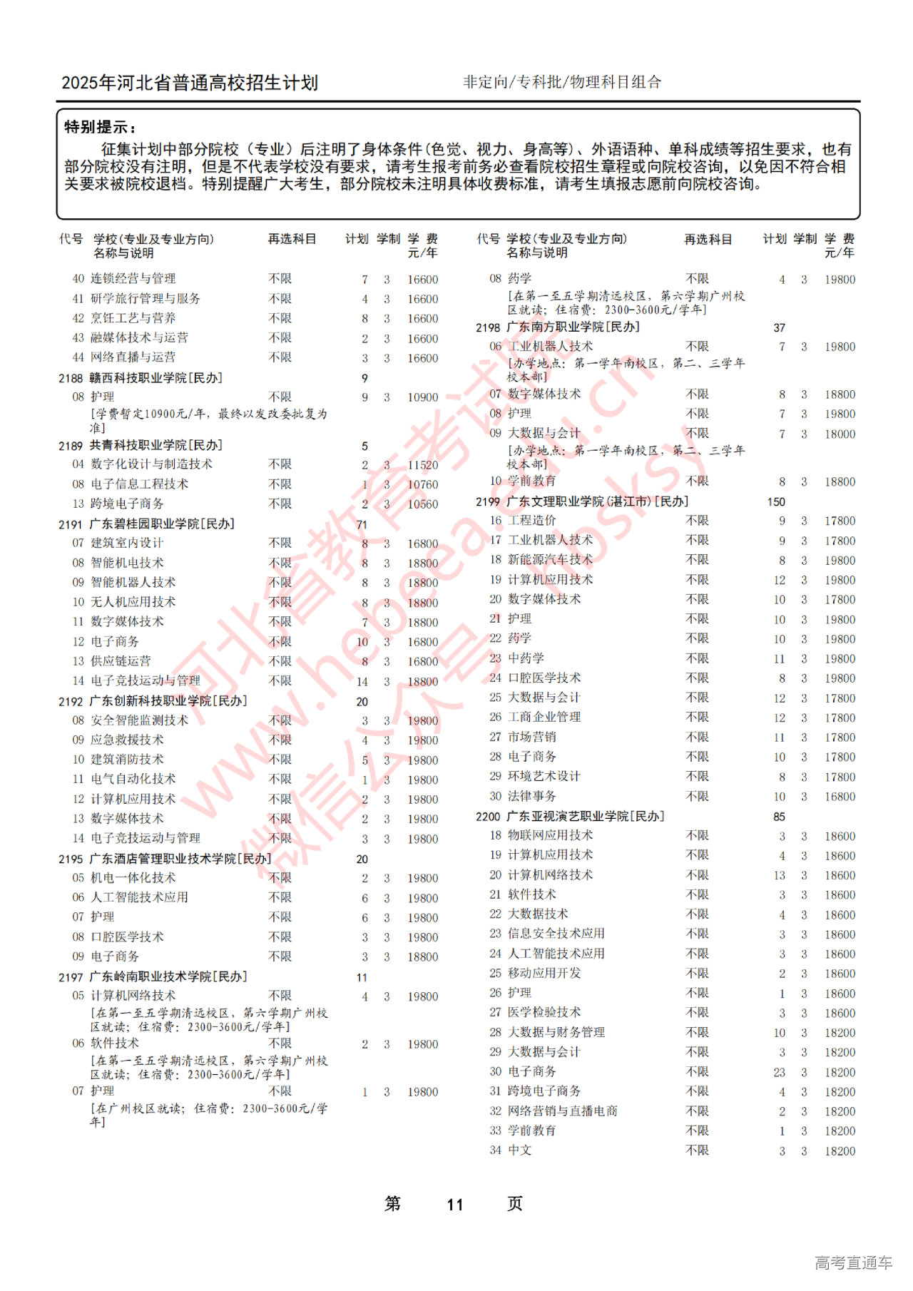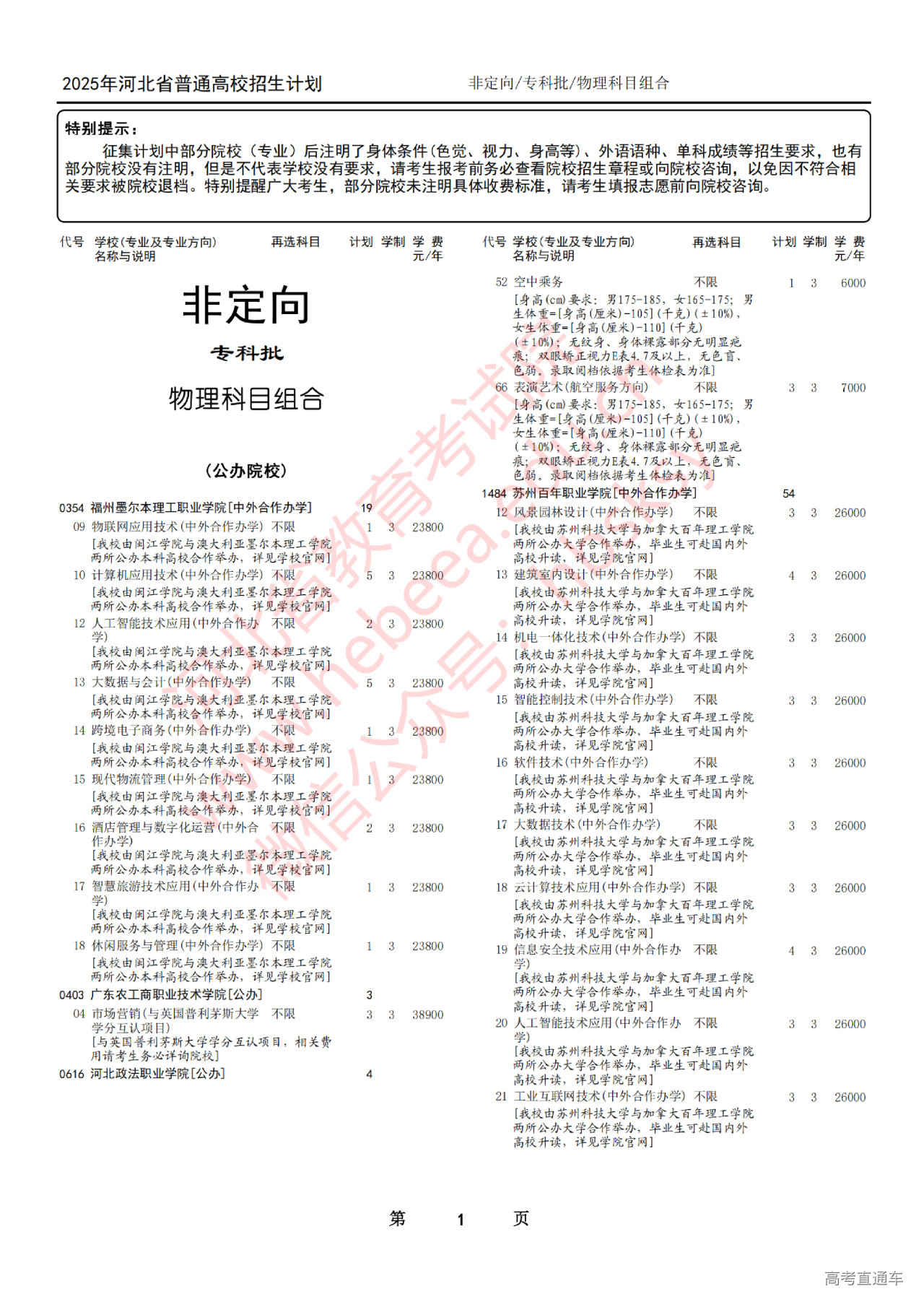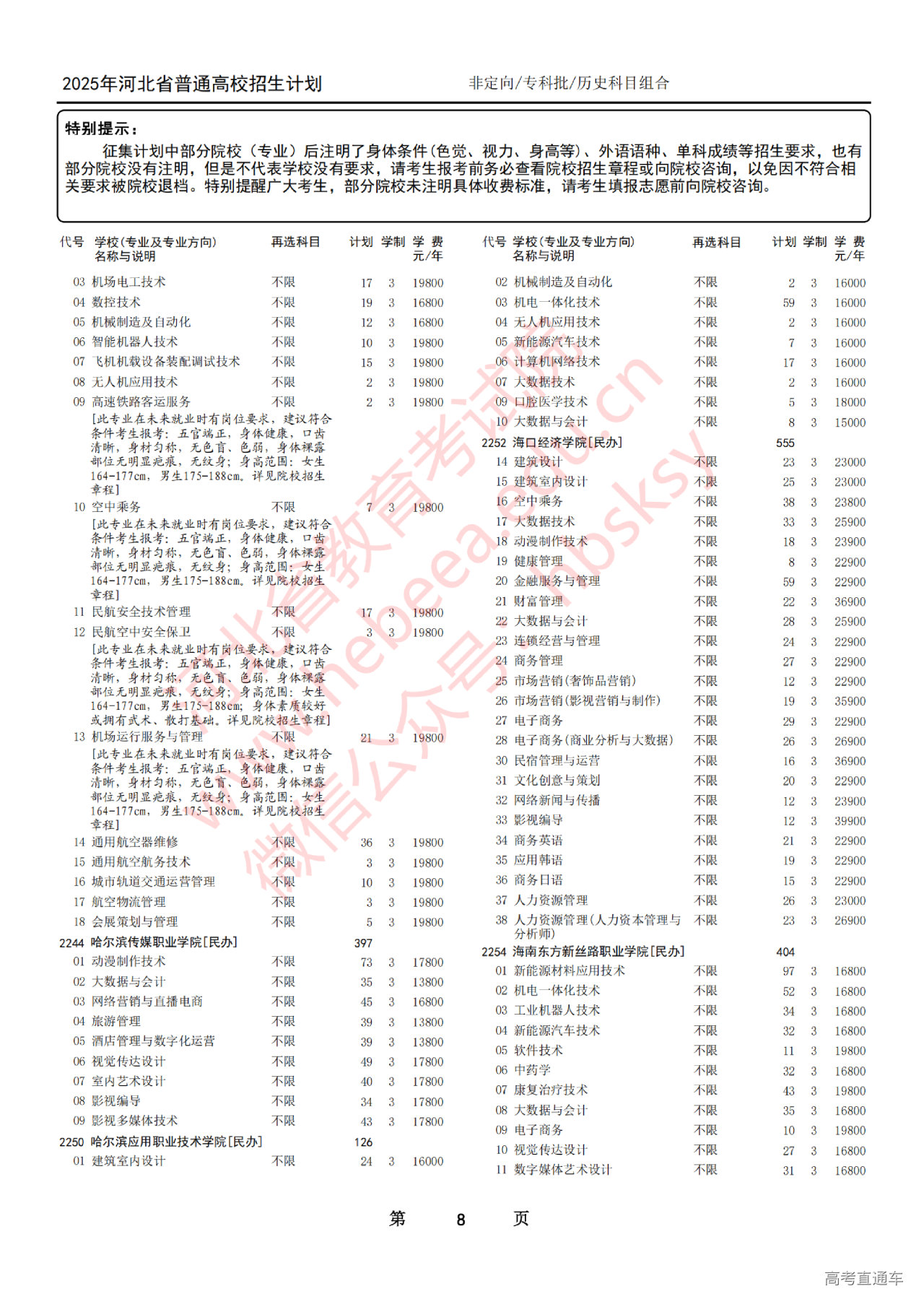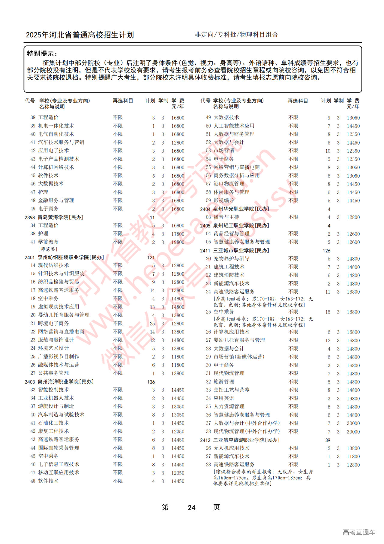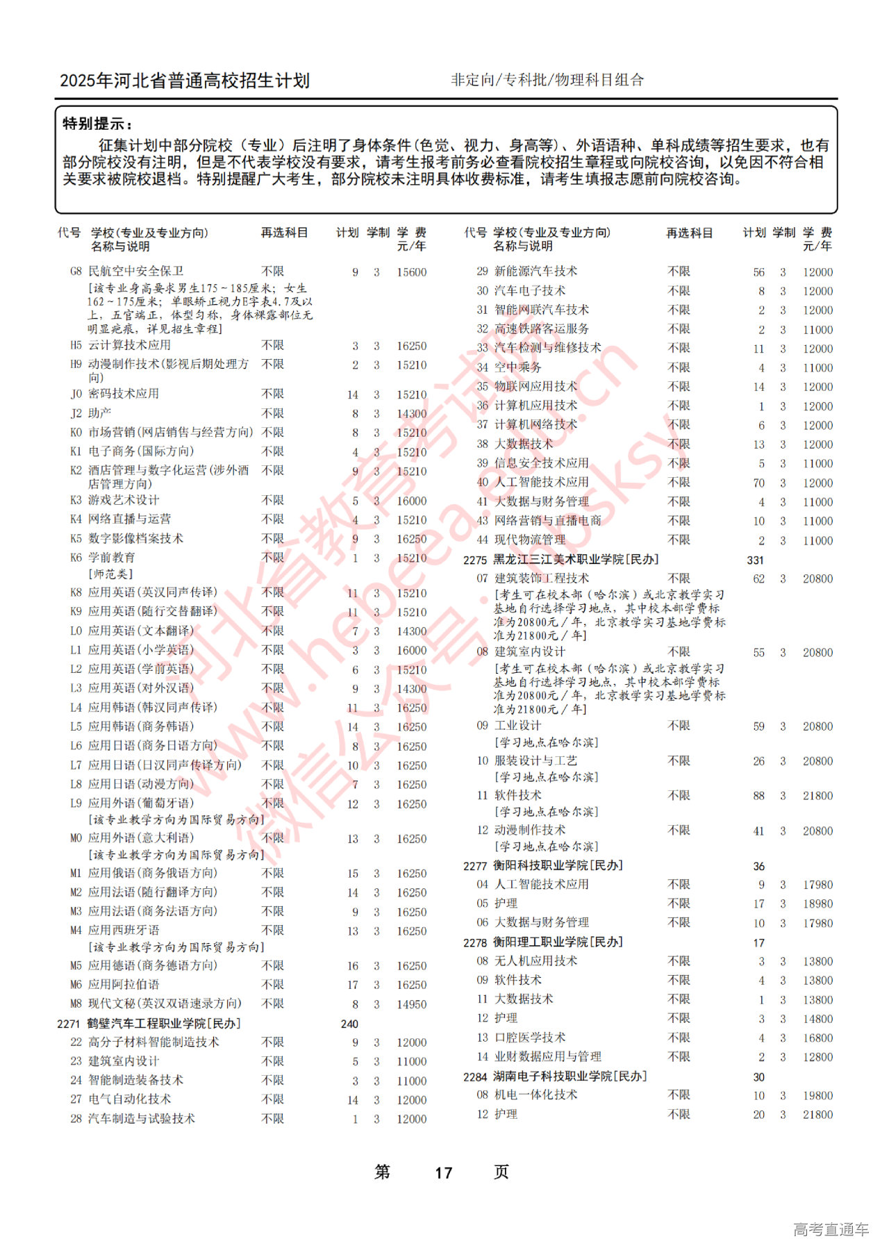 2025年河北省普通高校招生征集志愿计划说明 (专科批第三次征集) 一、本次征集是专科批最后一次征集志愿,公布的征集计划是专科批第二次征集志愿录取结束后院校缺额和新增计划,填报志愿的时间为8月25日12时至8月26日10时,未查到录取结果的考生可根据自身情况填报征集志愿。 二、本次征集录取时,如招生院校录取控制分数线上报考生源不足, 经招生院校申请,可降分录取,低于专科批文化控制分数线的考生可以填报。 三、本次填报志愿操作要求和集中填报志愿时要求一致,请考生登录我院网站,在规定时间内尽早完成志愿填报。在本次志愿填报截止时间前,考生可多次登录志愿填报系统进行志愿修改和保存并提交,最终以其网上最后一次修改并保存提交成功的志愿为准。 四、考生要切实增强安全意识,严格保管用户名及密码,密码设置不要过于简单,不要将密码告诉他人,不要让他人代为操作,以防志愿填报信息泄露或被他人篡改。遗忘密码的考生可在系统登录页面点击“密码重置”,进行重置密码操作。登录成功后,系统将向考生报名时预留的手机号码发送短信予以提示,如考生本人未登录而收到登录短信,请及时修改密码。 五、考生身体条件以高考体检表记载为准。部分院校专业对考生的身高、体重、视力、色觉、单科成绩等有要求,部分院校学费较高,请考生认真查阅拟填报院校招生章程或咨询院校。 六、本征集计划采用PDF格式公布,请考生使用PDF阅读器查看。部分浏览器自带的PDF阅读器浏览时存在缺字现象,遇到这种情况请考生下载正版PDF阅读器进行查看。 七、特别提醒:志愿是考生本人升学意愿的真实表达,是投档及录取的依据,如被高校录取,则不能退档。考生须慎重填报并对所填志愿负责。