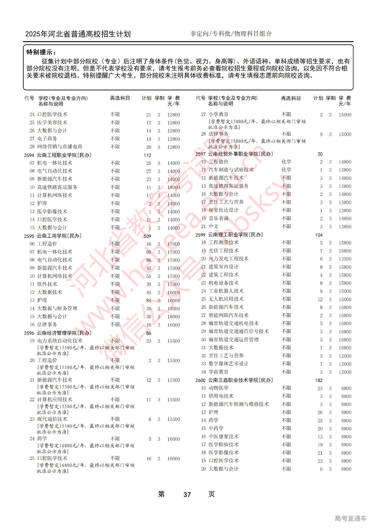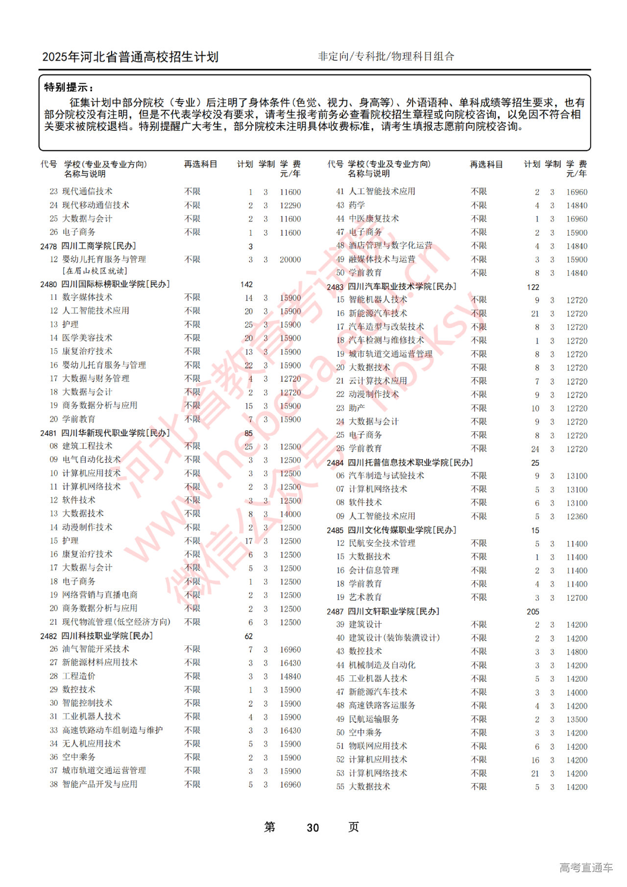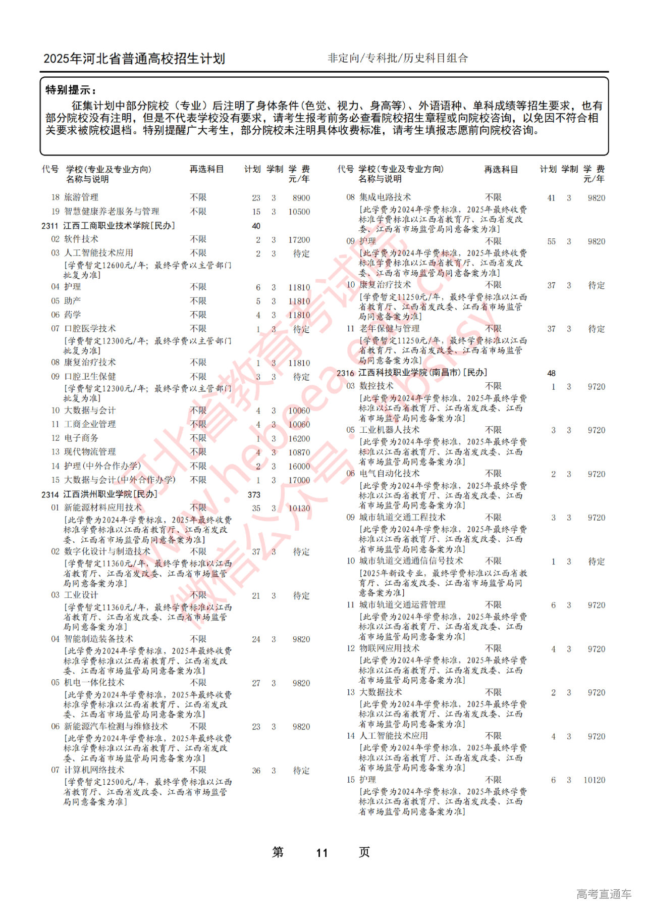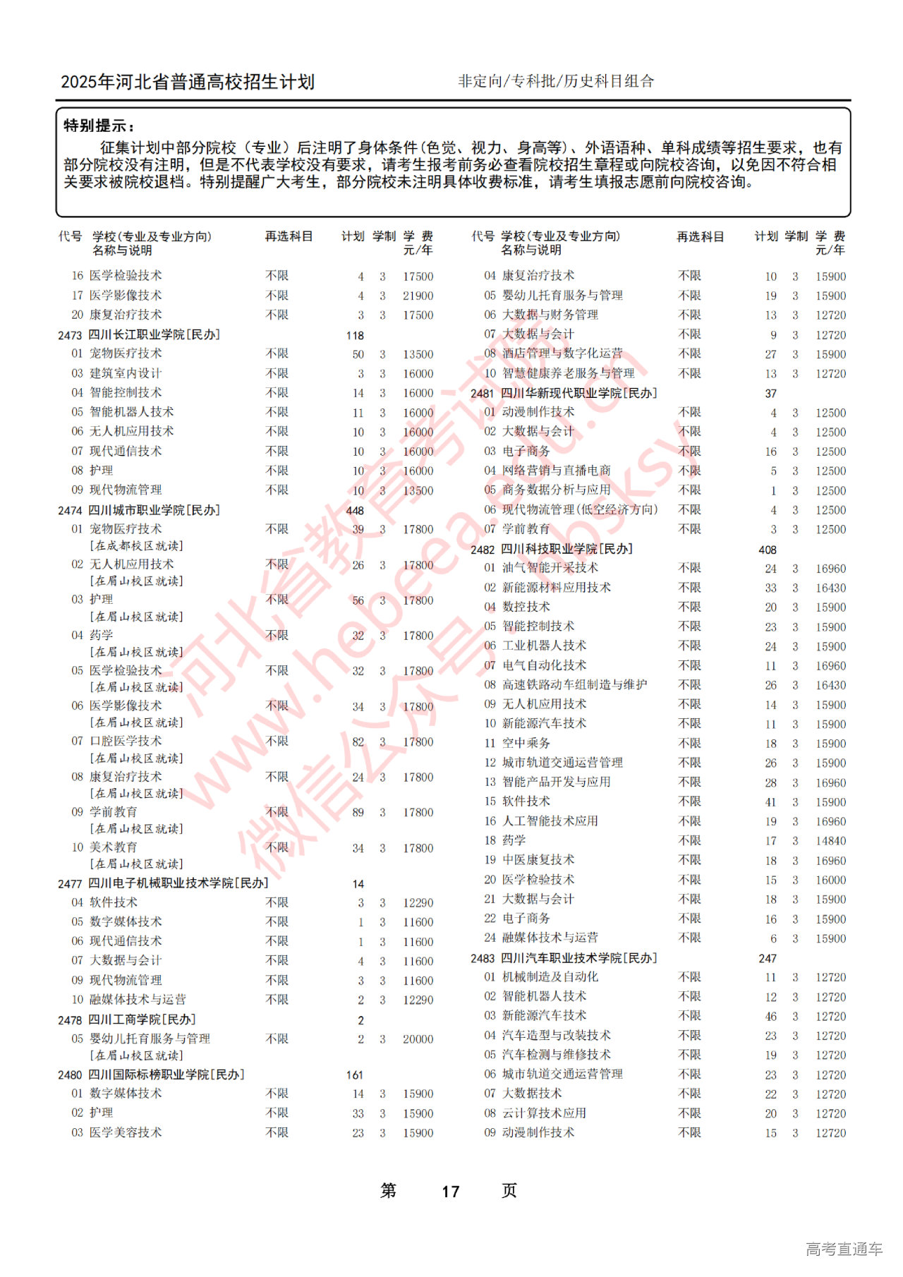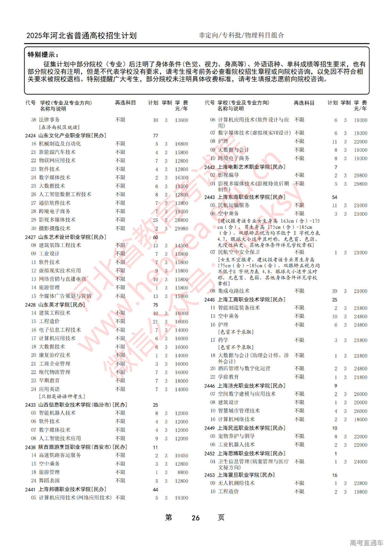 2025年河北省普通高校招生征集志愿计划说明 (专科批第三次征集) 一、本次征集是专科批最后一次征集志愿,公布的征集计划是专科批第二次征集志愿录取结束后院校缺额和新增计划,填报志愿的时间为8月25日12时至8月26日10时,未查到录取结果的考生可根据自身情况填报征集志愿。 二、本次征集录取时,如招生院校录取控制分数线上报考生源不足, 经招生院校申请,可降分录取,低于专科批文化控制分数线的考生可以填报。 三、本次填报志愿操作要求和集中填报志愿时要求一致,请考生登录我院网站,在规定时间内尽早完成志愿填报。在本次志愿填报截止时间前,考生可多次登录志愿填报系统进行志愿修改和保存并提交,最终以其网上最后一次修改并保存提交成功的志愿为准。 四、考生要切实增强安全意识,严格保管用户名及密码,密码设置不要过于简单,不要将密码告诉他人,不要让他人代为操作,以防志愿填报信息泄露或被他人篡改。遗忘密码的考生可在系统登录页面点击“密码重置”,进行重置密码操作。登录成功后,系统将向考生报名时预留的手机号码发送短信予以提示,如考生本人未登录而收到登录短信,请及时修改密码。 五、考生身体条件以高考体检表记载为准。部分院校专业对考生的身高、体重、视力、色觉、单科成绩等有要求,部分院校学费较高,请考生认真查阅拟填报院校招生章程或咨询院校。 六、本征集计划采用PDF格式公布,请考生使用PDF阅读器查看。部分浏览器自带的PDF阅读器浏览时存在缺字现象,遇到这种情况请考生下载正版PDF阅读器进行查看。 七、特别提醒:志愿是考生本人升学意愿的真实表达,是投档及录取的依据,如被高校录取,则不能退档。考生须慎重填报并对所填志愿负责。