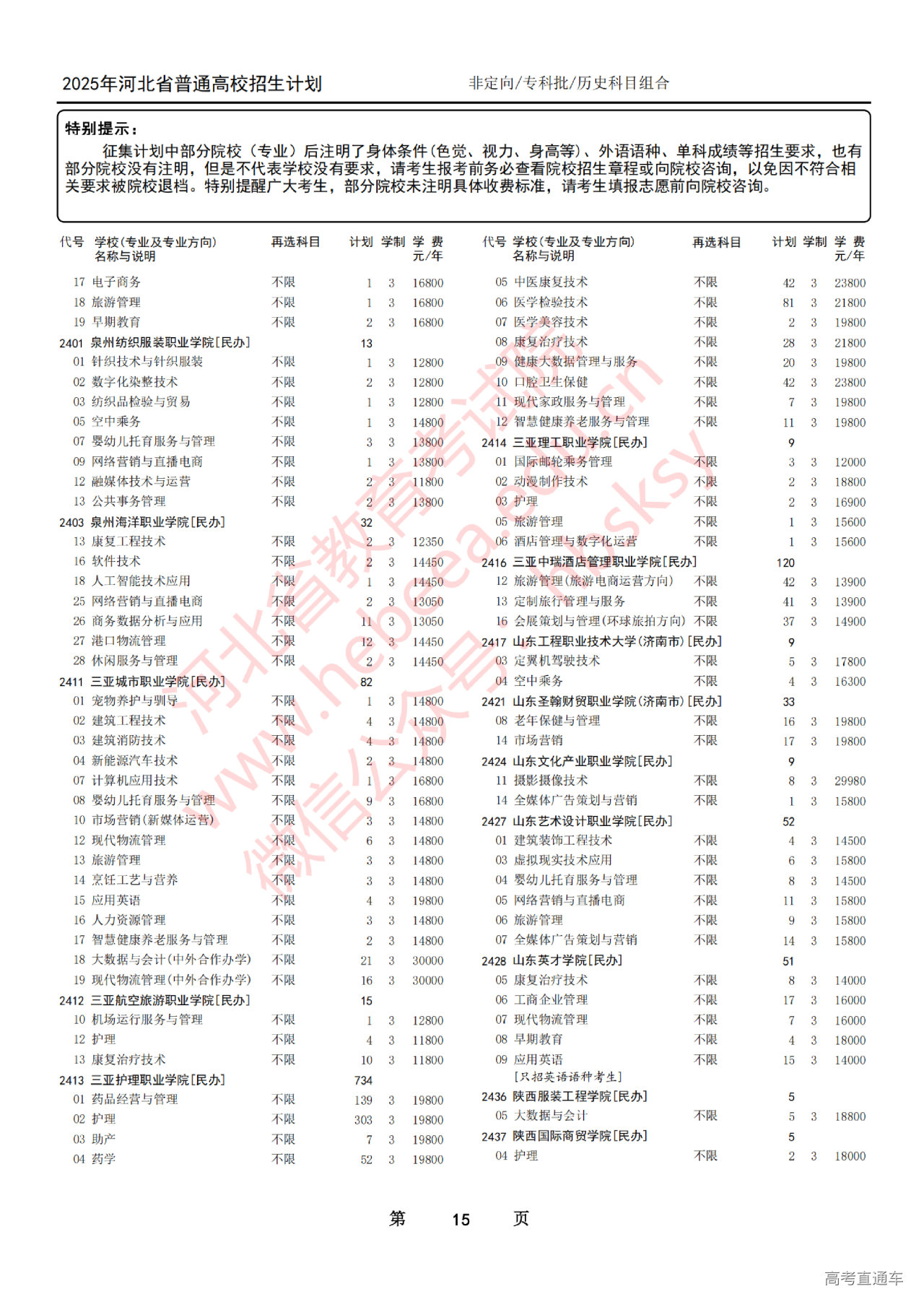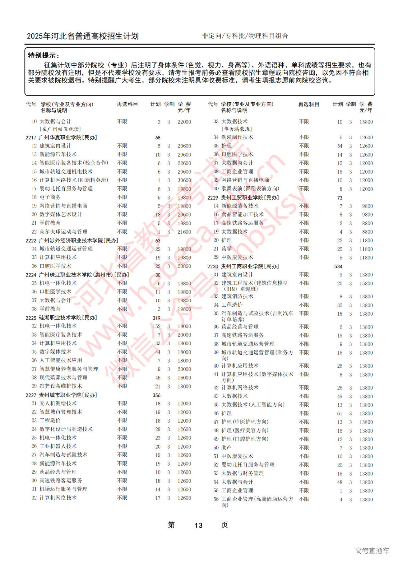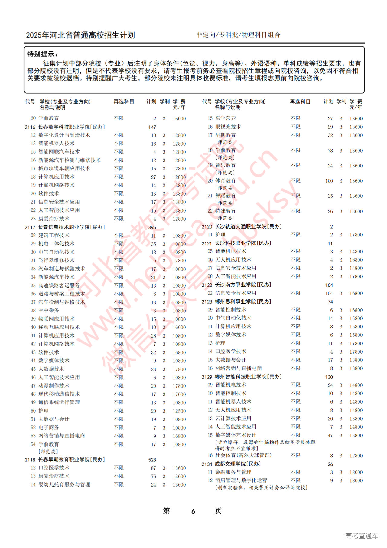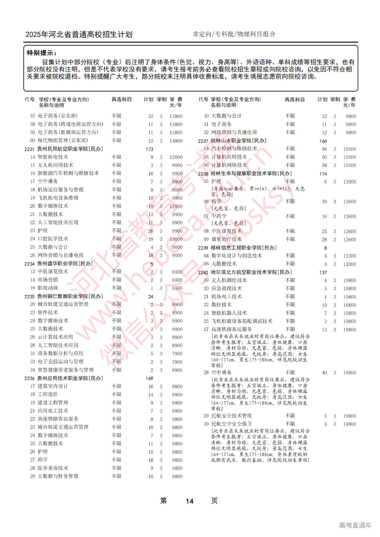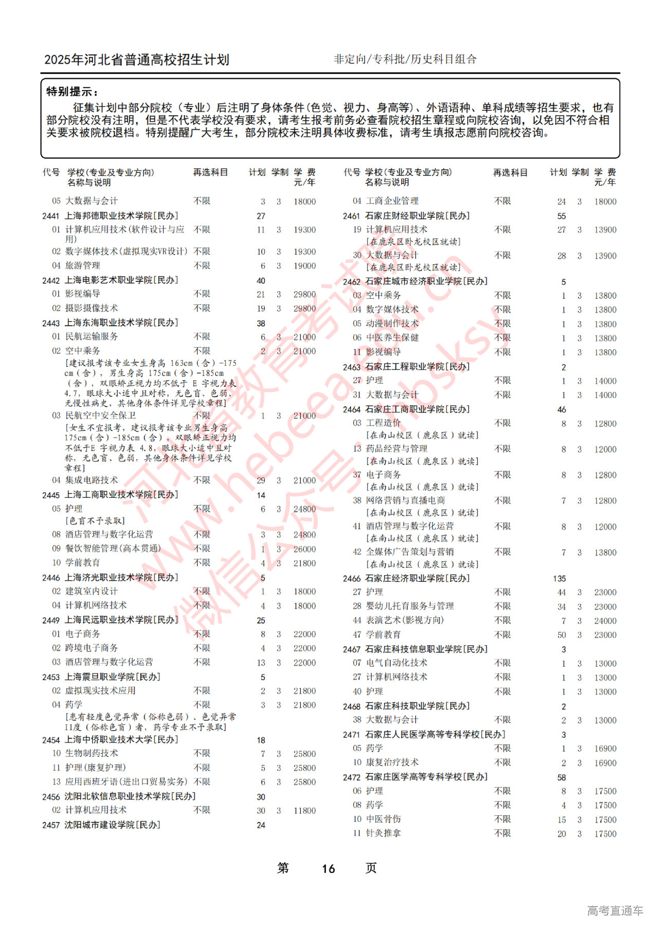 2025年河北省普通高校招生征集志愿计划说明 (专科批第三次征集) 一、本次征集是专科批最后一次征集志愿,公布的征集计划是专科批第二次征集志愿录取结束后院校缺额和新增计划,填报志愿的时间为8月25日12时至8月26日10时,未查到录取结果的考生可根据自身情况填报征集志愿。 二、本次征集录取时,如招生院校录取控制分数线上报考生源不足, 经招生院校申请,可降分录取,低于专科批文化控制分数线的考生可以填报。 三、本次填报志愿操作要求和集中填报志愿时要求一致,请考生登录我院网站,在规定时间内尽早完成志愿填报。在本次志愿填报截止时间前,考生可多次登录志愿填报系统进行志愿修改和保存并提交,最终以其网上最后一次修改并保存提交成功的志愿为准。 四、考生要切实增强安全意识,严格保管用户名及密码,密码设置不要过于简单,不要将密码告诉他人,不要让他人代为操作,以防志愿填报信息泄露或被他人篡改。遗忘密码的考生可在系统登录页面点击“密码重置”,进行重置密码操作。登录成功后,系统将向考生报名时预留的手机号码发送短信予以提示,如考生本人未登录而收到登录短信,请及时修改密码。 五、考生身体条件以高考体检表记载为准。部分院校专业对考生的身高、体重、视力、色觉、单科成绩等有要求,部分院校学费较高,请考生认真查阅拟填报院校招生章程或咨询院校。 六、本征集计划采用PDF格式公布,请考生使用PDF阅读器查看。部分浏览器自带的PDF阅读器浏览时存在缺字现象,遇到这种情况请考生下载正版PDF阅读器进行查看。 七、特别提醒:志愿是考生本人升学意愿的真实表达,是投档及录取的依据,如被高校录取,则不能退档。考生须慎重填报并对所填志愿负责。