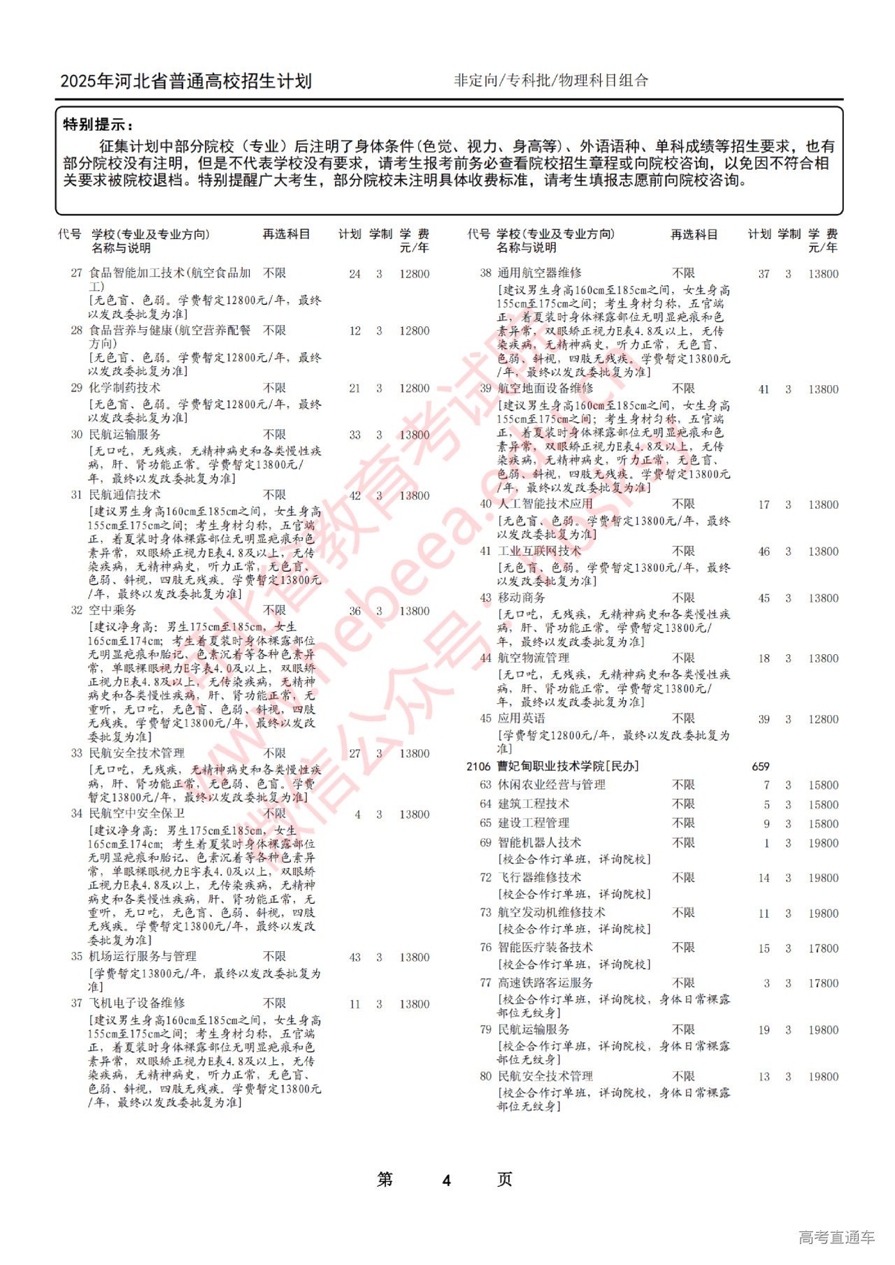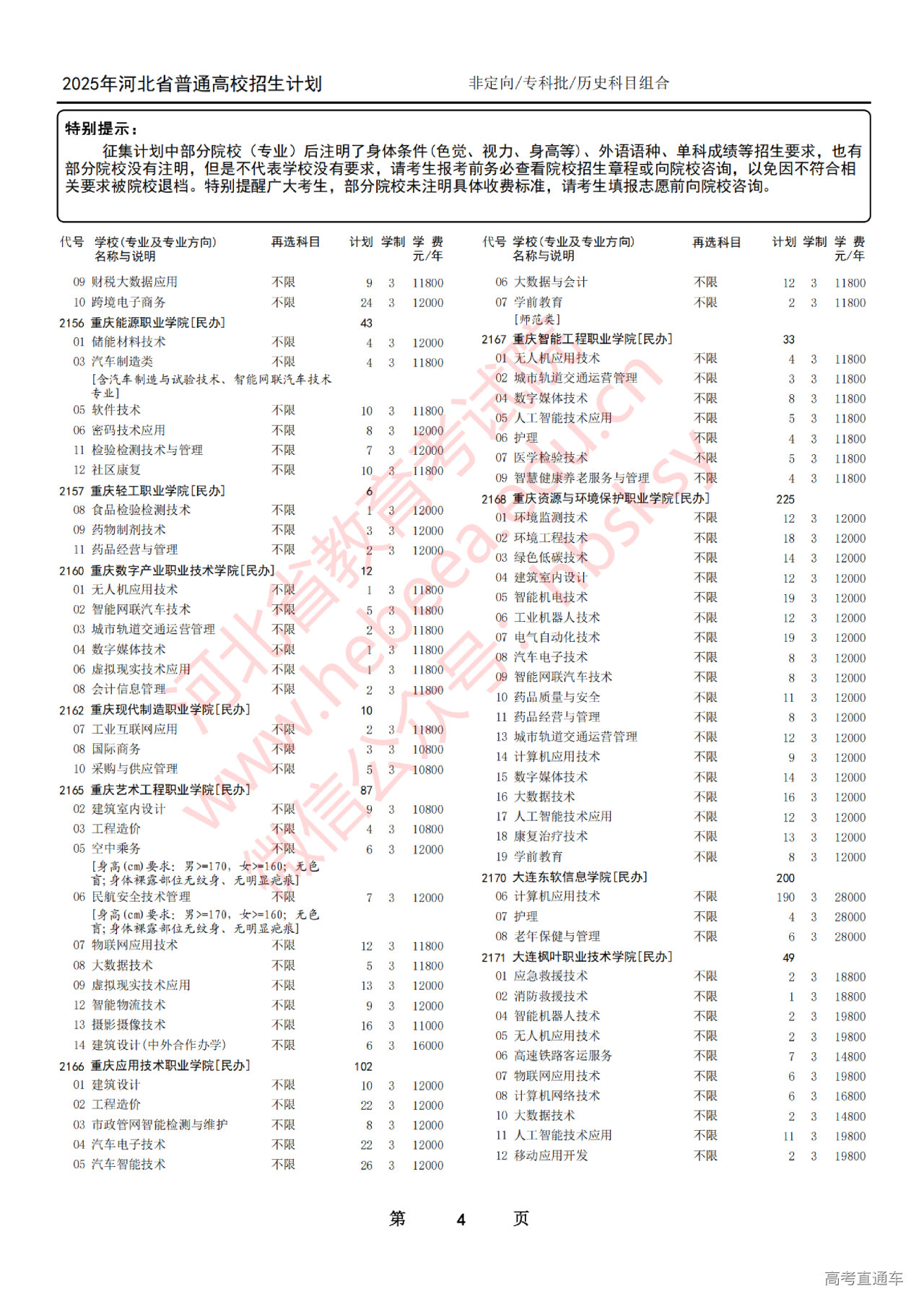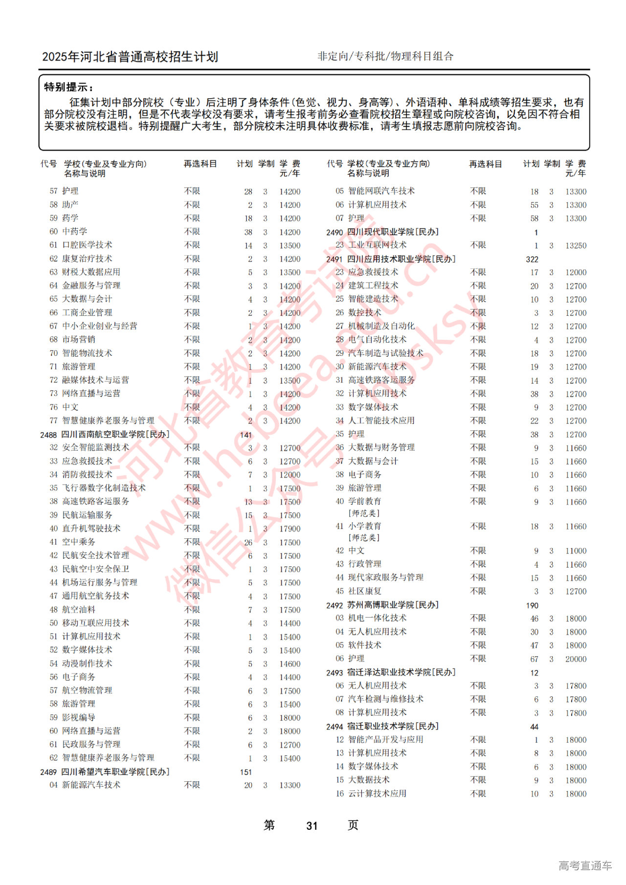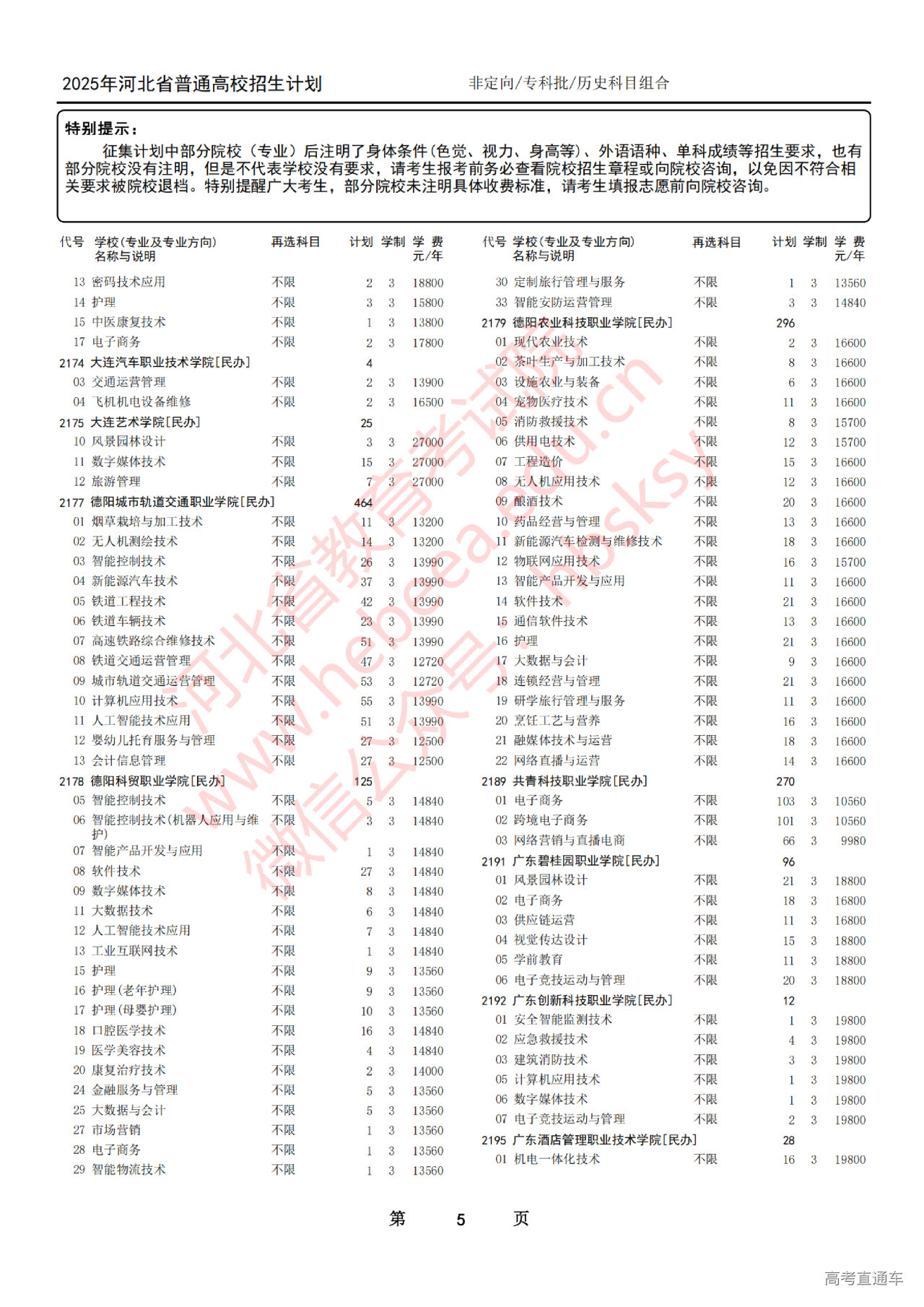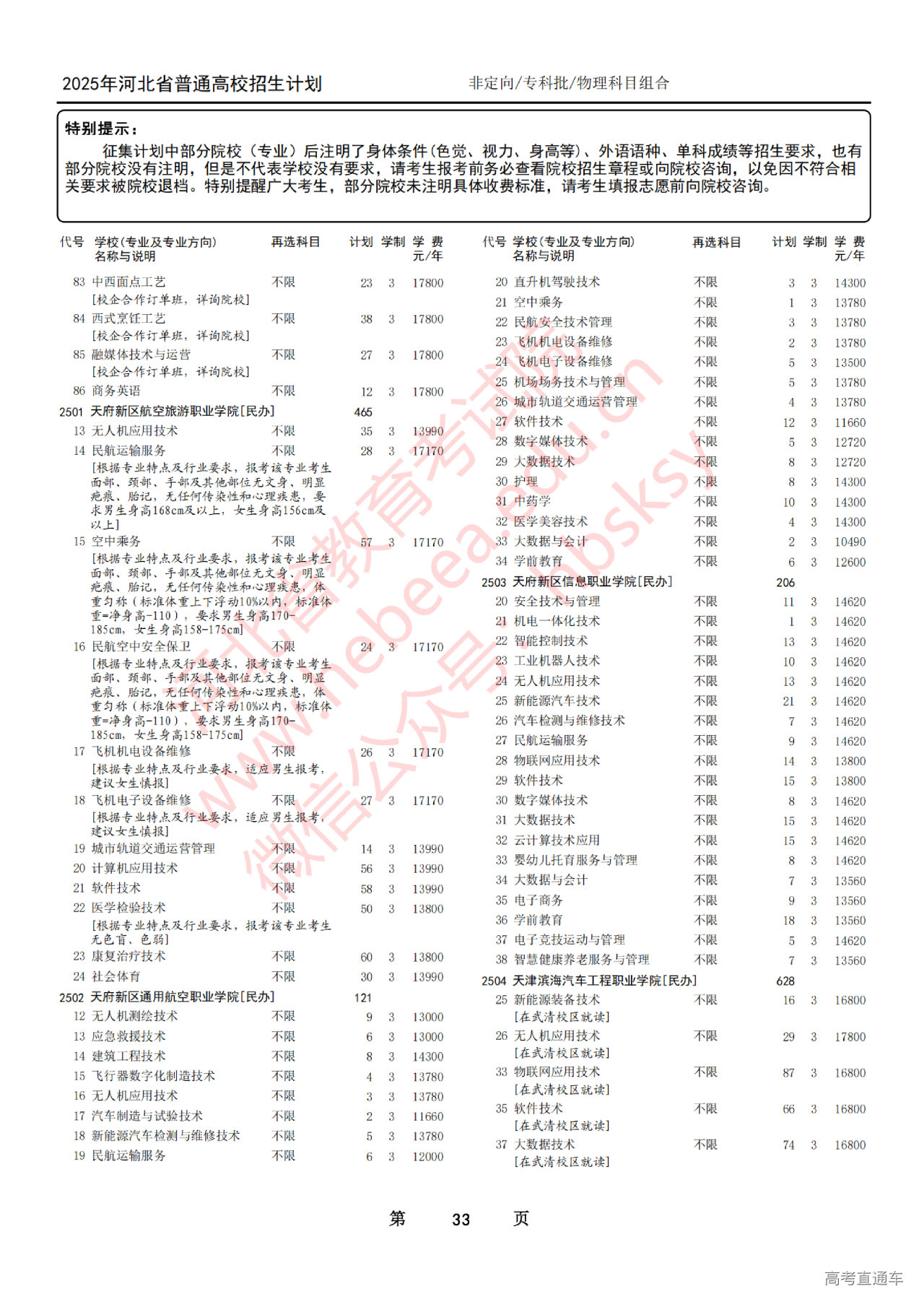 2025年河北省普通高校招生征集志愿计划说明 (专科批第三次征集) 一、本次征集是专科批最后一次征集志愿,公布的征集计划是专科批第二次征集志愿录取结束后院校缺额和新增计划,填报志愿的时间为8月25日12时至8月26日10时,未查到录取结果的考生可根据自身情况填报征集志愿。 二、本次征集录取时,如招生院校录取控制分数线上报考生源不足, 经招生院校申请,可降分录取,低于专科批文化控制分数线的考生可以填报。 三、本次填报志愿操作要求和集中填报志愿时要求一致,请考生登录我院网站,在规定时间内尽早完成志愿填报。在本次志愿填报截止时间前,考生可多次登录志愿填报系统进行志愿修改和保存并提交,最终以其网上最后一次修改并保存提交成功的志愿为准。 四、考生要切实增强安全意识,严格保管用户名及密码,密码设置不要过于简单,不要将密码告诉他人,不要让他人代为操作,以防志愿填报信息泄露或被他人篡改。遗忘密码的考生可在系统登录页面点击“密码重置”,进行重置密码操作。登录成功后,系统将向考生报名时预留的手机号码发送短信予以提示,如考生本人未登录而收到登录短信,请及时修改密码。 五、考生身体条件以高考体检表记载为准。部分院校专业对考生的身高、体重、视力、色觉、单科成绩等有要求,部分院校学费较高,请考生认真查阅拟填报院校招生章程或咨询院校。 六、本征集计划采用PDF格式公布,请考生使用PDF阅读器查看。部分浏览器自带的PDF阅读器浏览时存在缺字现象,遇到这种情况请考生下载正版PDF阅读器进行查看。 七、特别提醒:志愿是考生本人升学意愿的真实表达,是投档及录取的依据,如被高校录取,则不能退档。考生须慎重填报并对所填志愿负责。