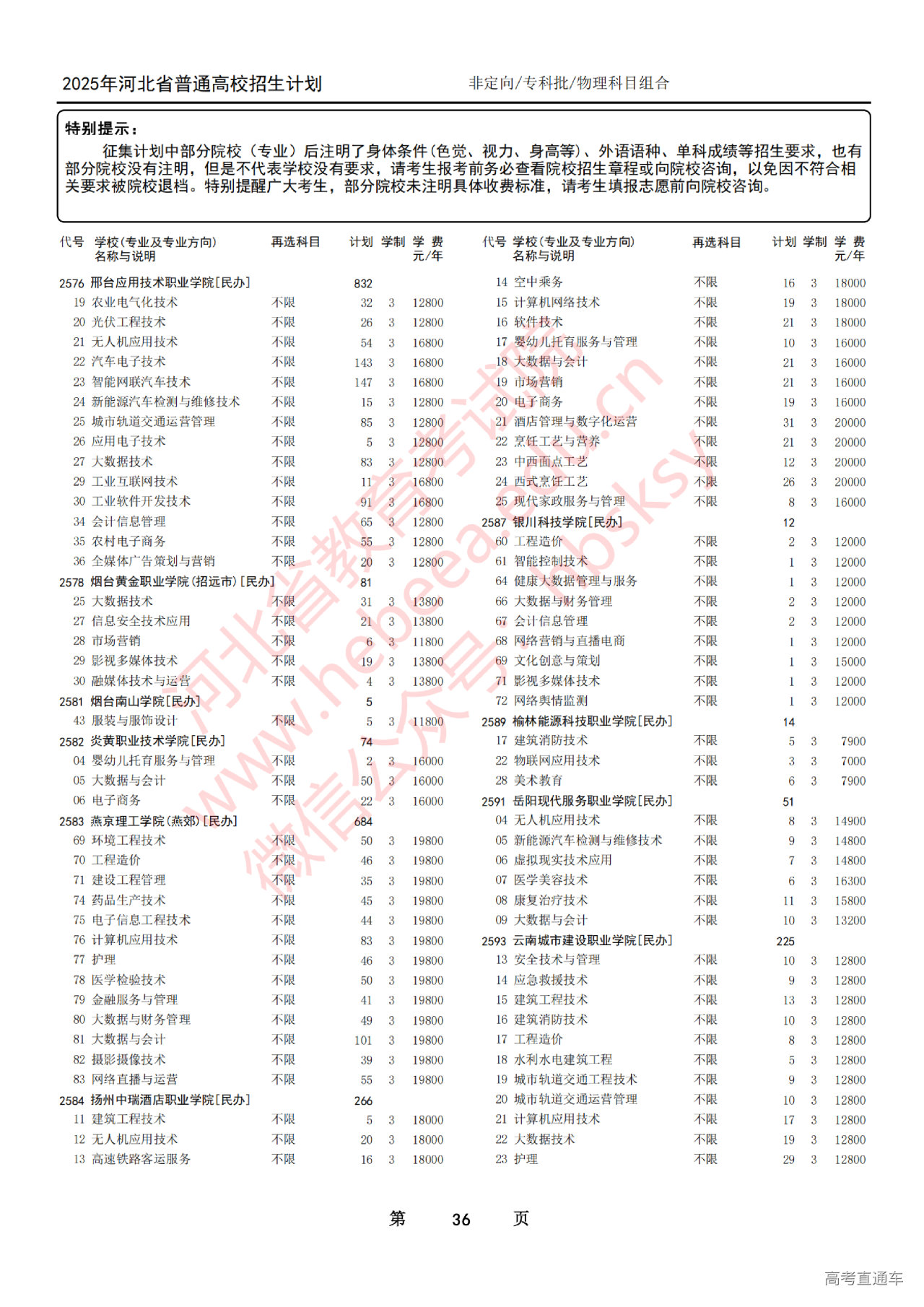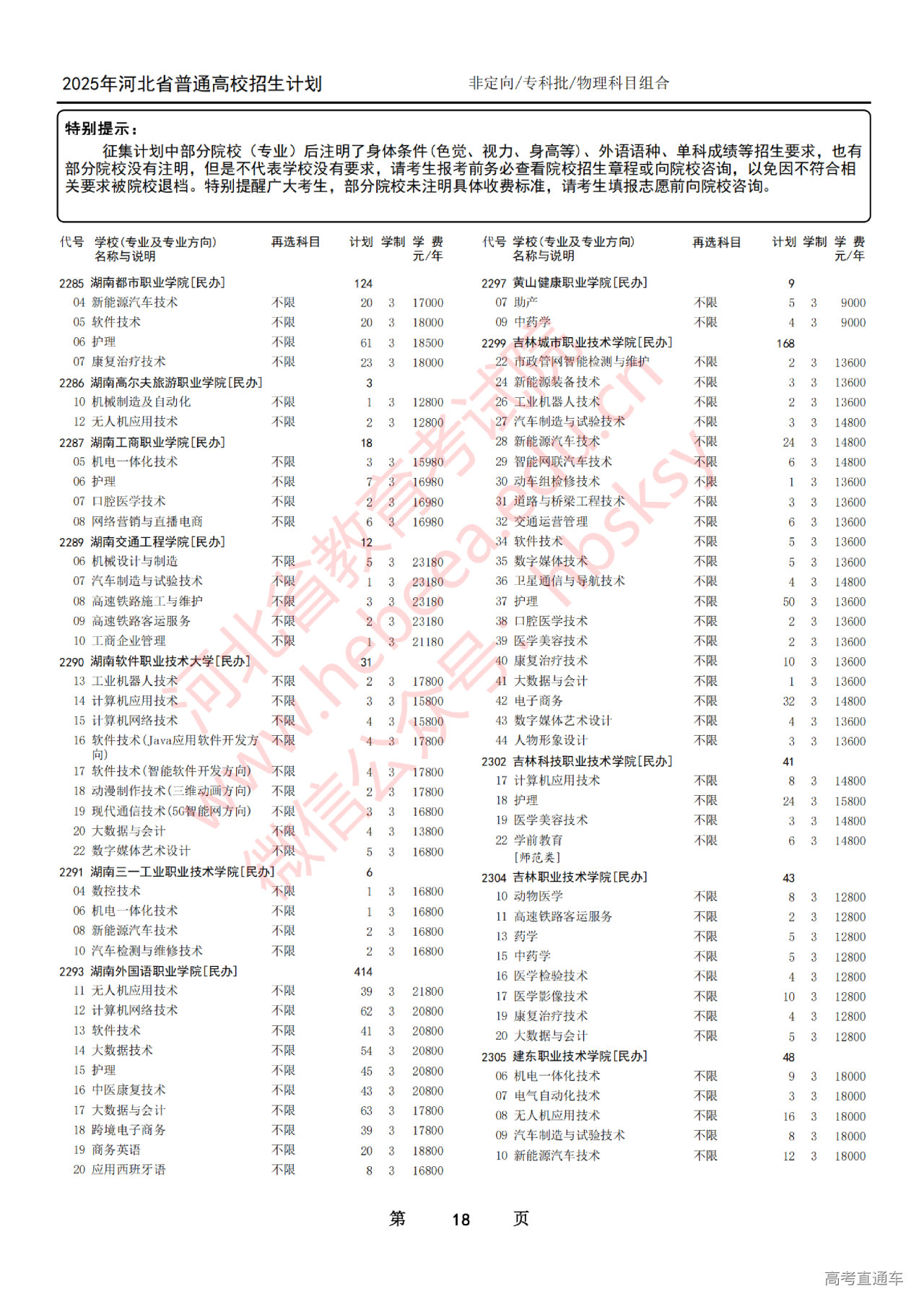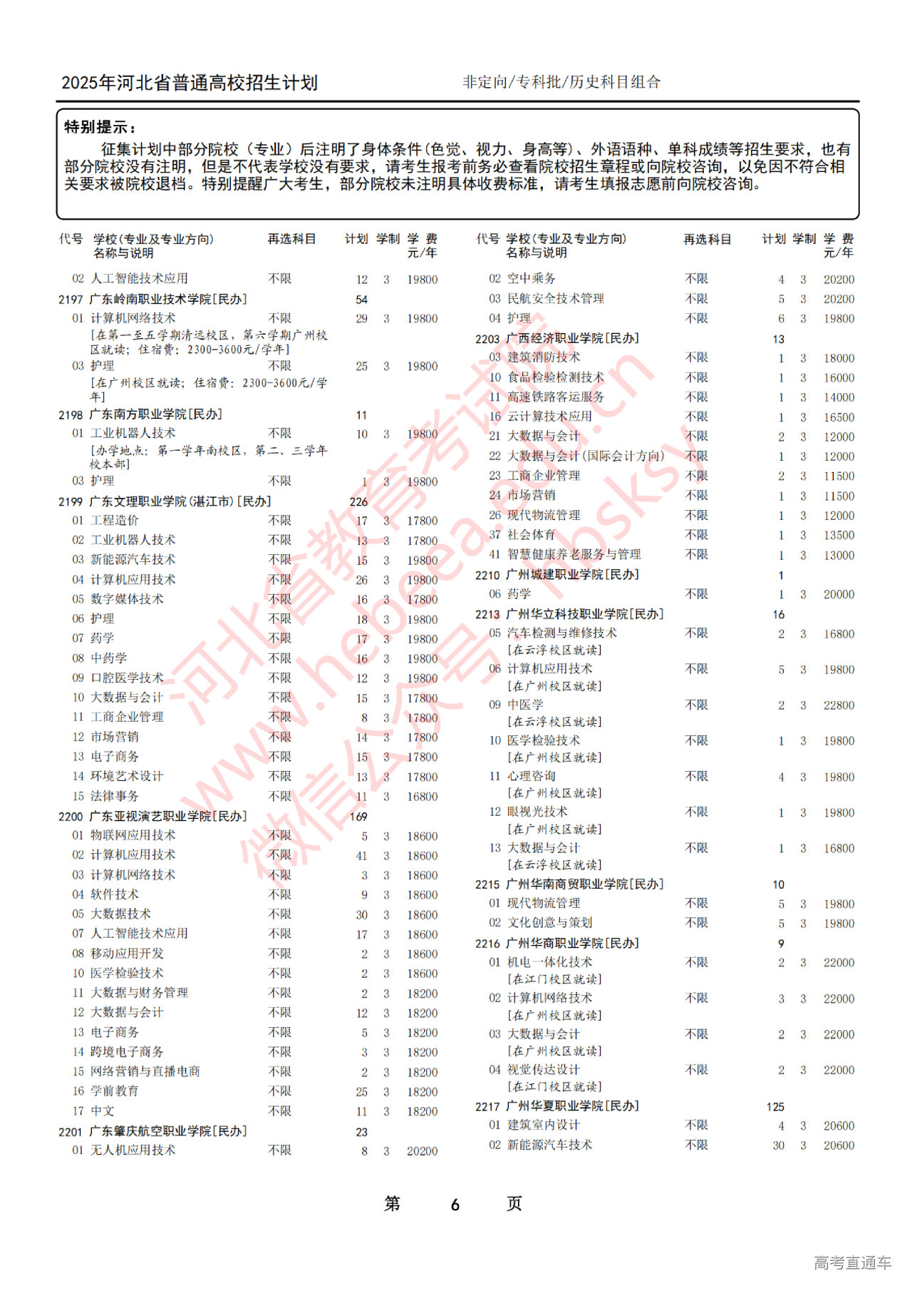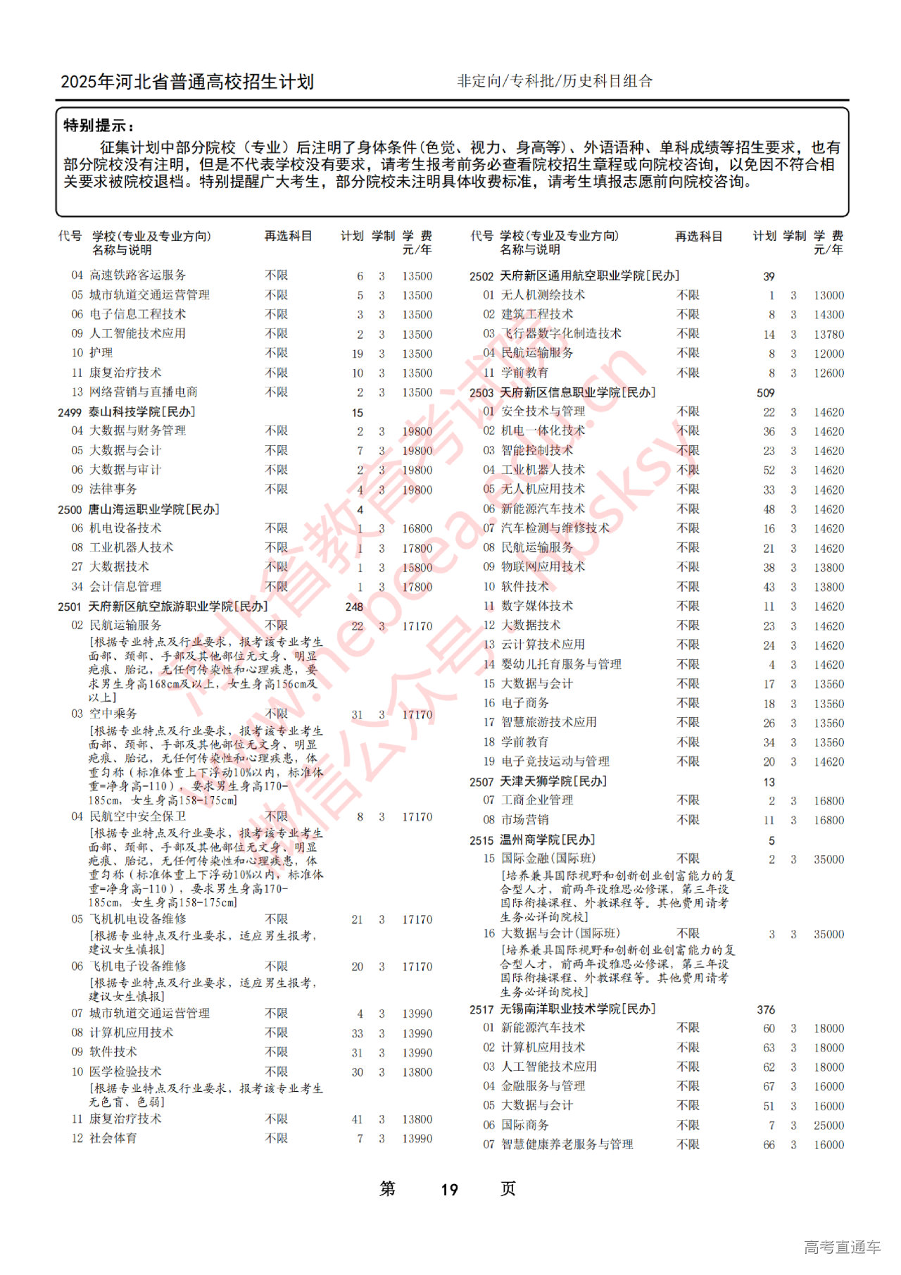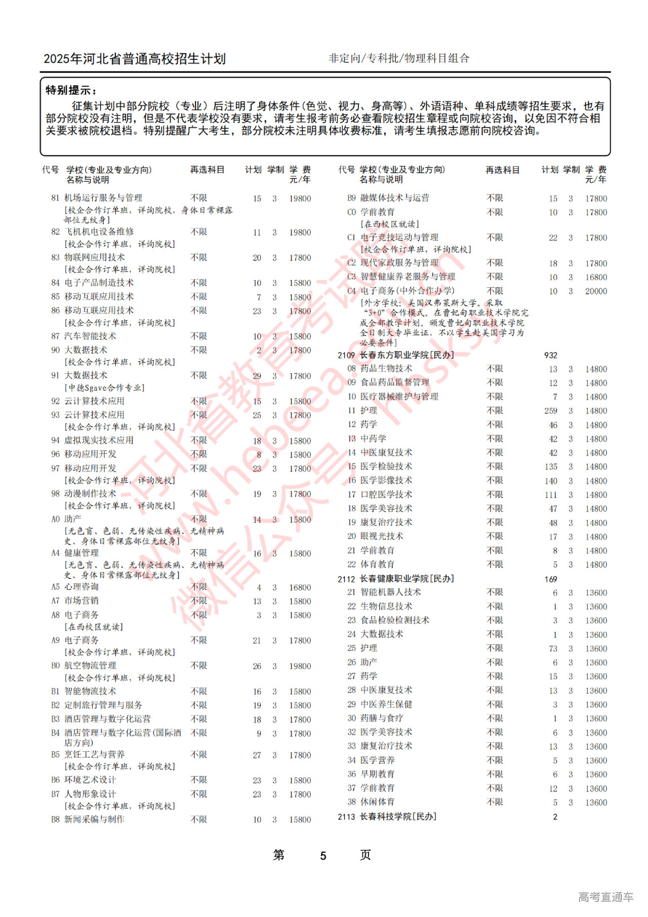 2025年河北省普通高校招生征集志愿计划说明 (专科批第三次征集) 一、本次征集是专科批最后一次征集志愿,公布的征集计划是专科批第二次征集志愿录取结束后院校缺额和新增计划,填报志愿的时间为8月25日12时至8月26日10时,未查到录取结果的考生可根据自身情况填报征集志愿。 二、本次征集录取时,如招生院校录取控制分数线上报考生源不足, 经招生院校申请,可降分录取,低于专科批文化控制分数线的考生可以填报。 三、本次填报志愿操作要求和集中填报志愿时要求一致,请考生登录我院网站,在规定时间内尽早完成志愿填报。在本次志愿填报截止时间前,考生可多次登录志愿填报系统进行志愿修改和保存并提交,最终以其网上最后一次修改并保存提交成功的志愿为准。 四、考生要切实增强安全意识,严格保管用户名及密码,密码设置不要过于简单,不要将密码告诉他人,不要让他人代为操作,以防志愿填报信息泄露或被他人篡改。遗忘密码的考生可在系统登录页面点击“密码重置”,进行重置密码操作。登录成功后,系统将向考生报名时预留的手机号码发送短信予以提示,如考生本人未登录而收到登录短信,请及时修改密码。 五、考生身体条件以高考体检表记载为准。部分院校专业对考生的身高、体重、视力、色觉、单科成绩等有要求,部分院校学费较高,请考生认真查阅拟填报院校招生章程或咨询院校。 六、本征集计划采用PDF格式公布,请考生使用PDF阅读器查看。部分浏览器自带的PDF阅读器浏览时存在缺字现象,遇到这种情况请考生下载正版PDF阅读器进行查看。 七、特别提醒:志愿是考生本人升学意愿的真实表达,是投档及录取的依据,如被高校录取,则不能退档。考生须慎重填报并对所填志愿负责。