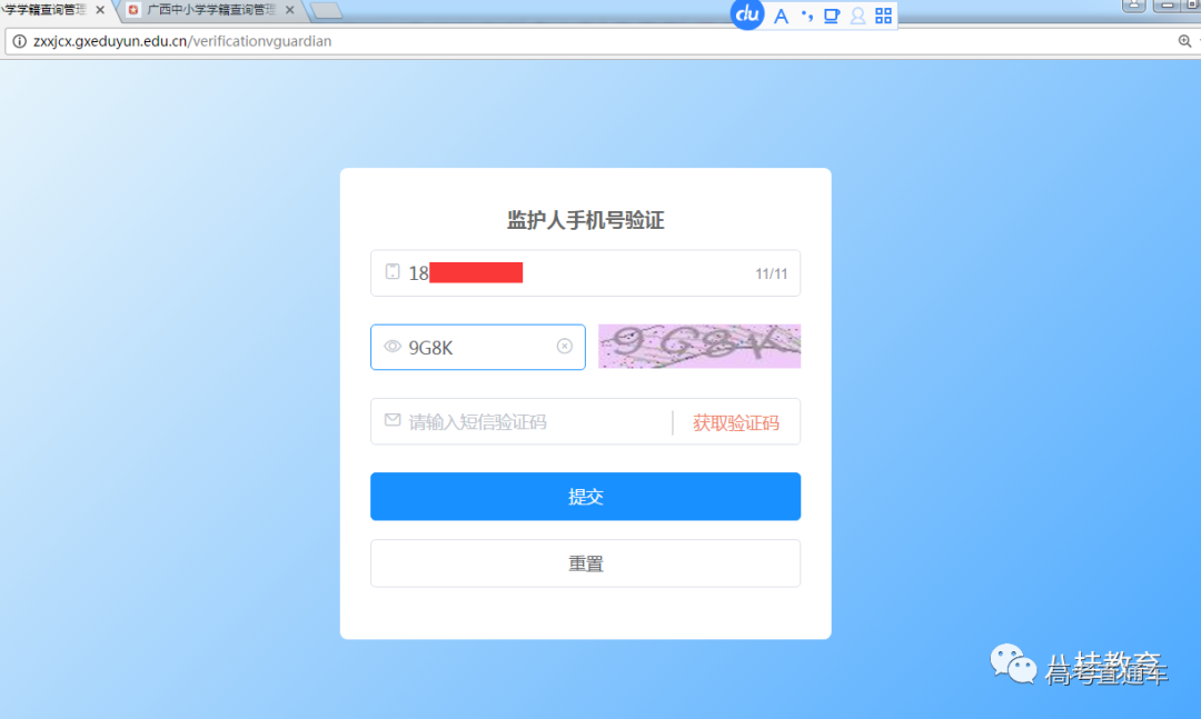 4. 点击“提交”按钮即可进入到监护人手机验证界面;