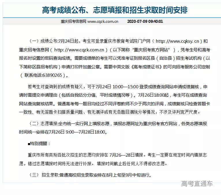 (二)志愿填报:全市统一实行网上填报志愿,填报志愿网址为重庆招考官方网站,各类志愿填报时间统一安排在7月26日9:00—7月28日18:00。