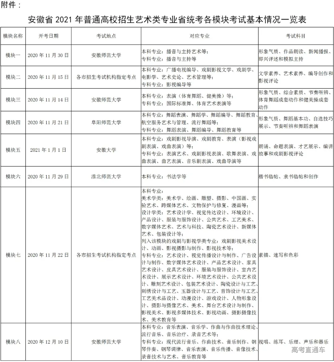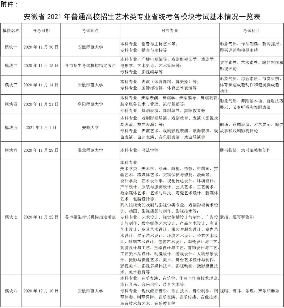 3.考试时间:各招生院校的专业考试时间、招生专业、考试科目、招生计划和要求详见各校的《招生简章》。省考试院也将适时发布《2021年省外院校在皖设点艺术专业考试日程》。