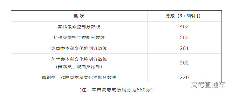 本科录取控制分数线为402分(上海市高考成绩满分为660分);特殊类型招生控制分数线为505分;艺术类本科文化控制分数线为302分,其中舞蹈类、戏曲类本科文化控制分数线220分;体育类本科文化控制分数线为281分。