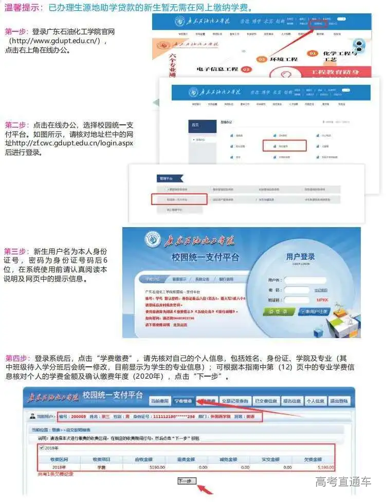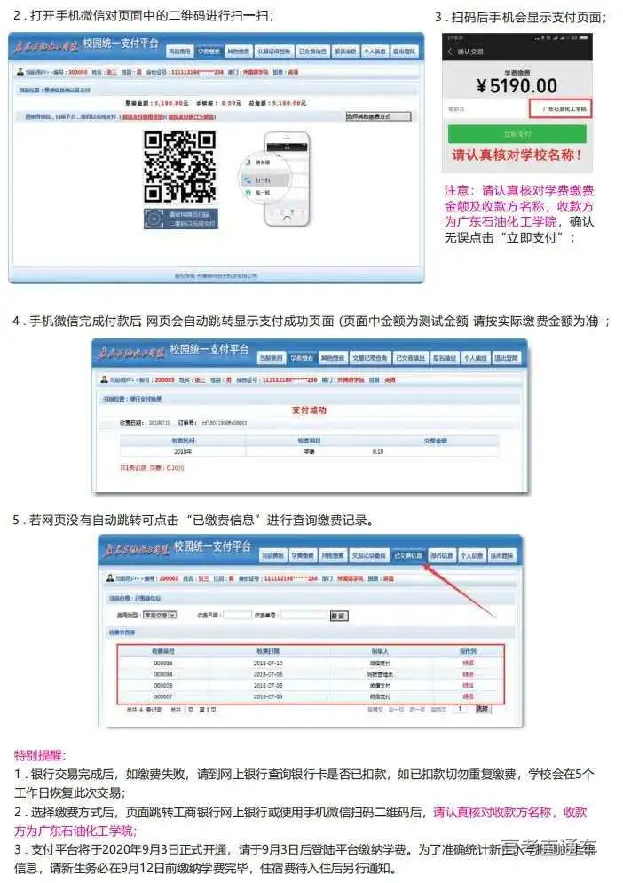 问答· 2 Q 网上预报到截止时间? 截止时间为9月9日,请同学们抓紧时间预报到。 问答· 3 Q 新生开学需要带哪些材料? 新生入学报到须准备材料 1.身份证原件、身份证复印件2份(身份证正反面复印在同一张A4张上,学生本人签名) 2.高考准考证(若准考证丢失需到原学校开证明) 3.根据广东省相关文件要求,2020年12月31日以前年满十八周岁的男性公民。须到县、自治县、市、直的兵役机关(县级武装部)进行兵役登记,男性新生须持《兵役证》报到,咨询电话:0668-2923110 4.本人近期免冠正面一寸彩色照片十张,以备办理各种证件 5.党(团)组织关系 6.中学纸质档案(除部分中学统一邮寄学校外。其余由学生本人携带至学校。入学后由各班班干部收齐交到所在学院 ) 7.网上报到单 问答· 4 Q 新生报到流程是怎样的? ①出示身份证、录取通知书、预报到手续单等资料办理报到(预报到手续单通过网上预报到流程打印); ②登记资料,核对并签字确认; ③领取校园卡一卡通(含膳食卡、热水卡等功能),领取后可自行按照相关流程进行线上充值; ④安排住宿。 因故不能如期报到者,须及时以书面形式并附有关证明向新生所在二级学院请假。如未在规定报到时间内报到且无正当理由者,视为自动放弃入学资格,将注销学籍,责任自负。 问答· 5 Q 新生学费怎么交? 实行网上缴费,具体缴费方式如下: 问答· 6 Q 住宿费多少钱? 根据学生公寓不同规格,收费标准在750-1350元/人之间,入学报到时,学校按班级统一安排住宿;入住后,届时按实际住宿标准缴费。 问答· 7 Q 各个校区的床的规格? 0.9m*2.0m。 问答· 8 Q 如何办理学费缓缴手续(绿色通道)? 申请办理助学金、助学贷款的新生, 认真阅读《致2020级家庭经济困难新生的一封信》,自行拆下《广东省家庭经济困难学生申请表》进行填写,并按规定办理好相关手续。已办理生源地助学贷款的新生暂无需在网上缴纳学费。 问答· 9 Q 家长能否申请进入校园,陪同新生缴费和购买生活用品? 目前根据防疫要求,也为了保证师生的健康,不开放新生家长进入校园,学校会在火车站、汽车站和校门口安排志愿者服务,生活用品可在校内超市采购。 问答· 10 Q 学生可以乘学校交通车往返三个校区吗? 疫情防控期间,未经批准不允许学生乘交通车往返各个校区。 问答· 11 Q 广东省外新生的录取通知书什么时候 能收到? 学校将尽快寄出,请保持通话畅通,耐心等待! 问答· 12 Q 怎样加入新生群? 扫描下方二维码,打开文章,即可找到相应学院新生群二维码。 问答· 13 Q 如何转专业? 办理流程: 1、每学期期末,教务处根据学校文件精神,发布转专业通知,规定流程各环节的时间、要求等 2、各学院将各专业可转入人数报教务处,经学校审批后在校内公布 3、受理转专业学生申请,转入学院组织考核 4、各学院根据学生志愿、考核的成绩排序进行录取 5、教务处复审、汇总拟录取名单,经学校教学指导委员会审批后公示 6、教务处正式发文,各学院教务员在教务系统进行异动、课程处理 7、学生到新学院报到、上课 办理地点:综合办公楼401学籍管理科 办理时间:周一至周五:8:00~11:30 14:00~17:30 联系电话:0668-2923287 问答· 14 Q 如何查询课程安排? 查询方式: 1、用学号和密码登录教务系统查询课表 2、关注微信广油教务处公众号,点击教务-我的课表查询 查询链接:教务系统http://210.38.250.43/ 问答· 15 Q 团员如何接转组织关系? (1) 省内关系转移通过广东“智慧团建”系统转接,团员档案可随学籍档案寄来学校或自带; (2) 省外转来的团组织关系介绍信由原就读院校或工作单位共青团组织部门开出,介绍信抬头写“共青团广东石油化工学院委员会”。或通过广东“智慧团建”系统转接,团员档案可随学籍档案寄来学校或自带; 详情咨询: 0668-2923085。 问答· 16 Q 学校快递取件处在哪? 一、官渡校区 快递服务中心:学生宿舍4区北侧场地。 二、西城校区 快递服务中心:综合教学楼南侧国旗台下方架空层 三、光华校区 快递服务中心:3号楼103室。