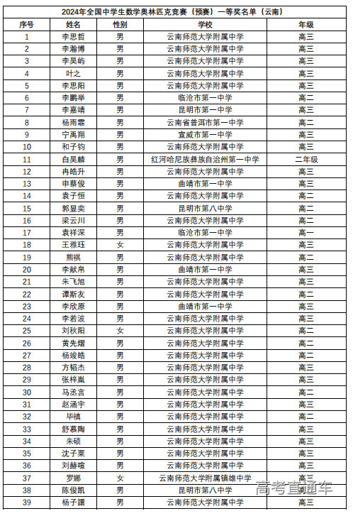 2024年第40届全国中学生数学联赛省一名单(云南)