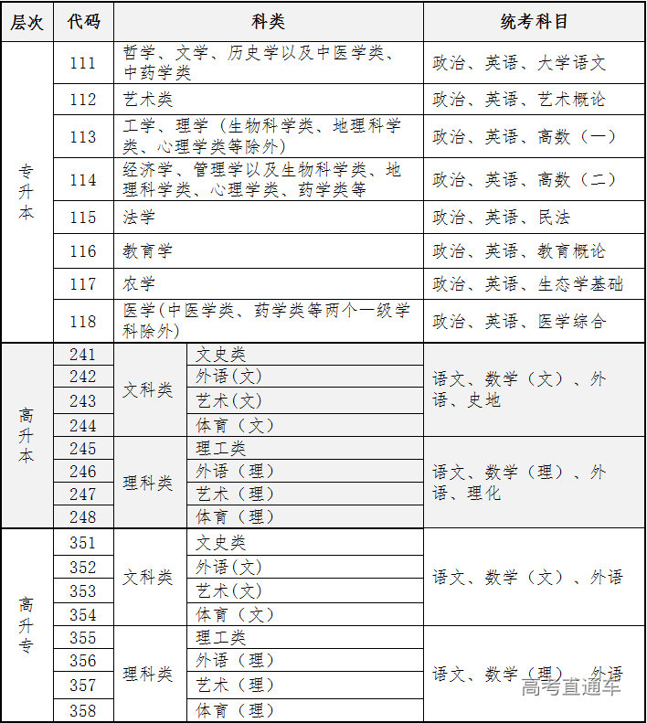 (一)专升本、高起本、高起专三种层次对应的报考代码、科类及统考科目如下: