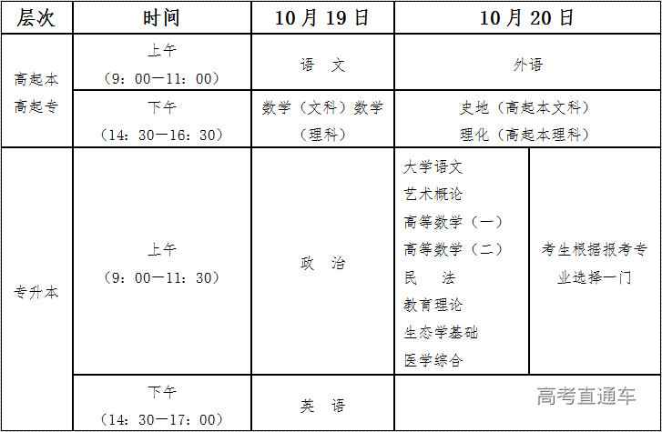 (三)专升本统考科目为政治、英语和专业基础课。专业基础课为考生报考专业所属的科类对应的考试科目,考生必须按本人所报学校和专业志愿选考对应的基础课科目。