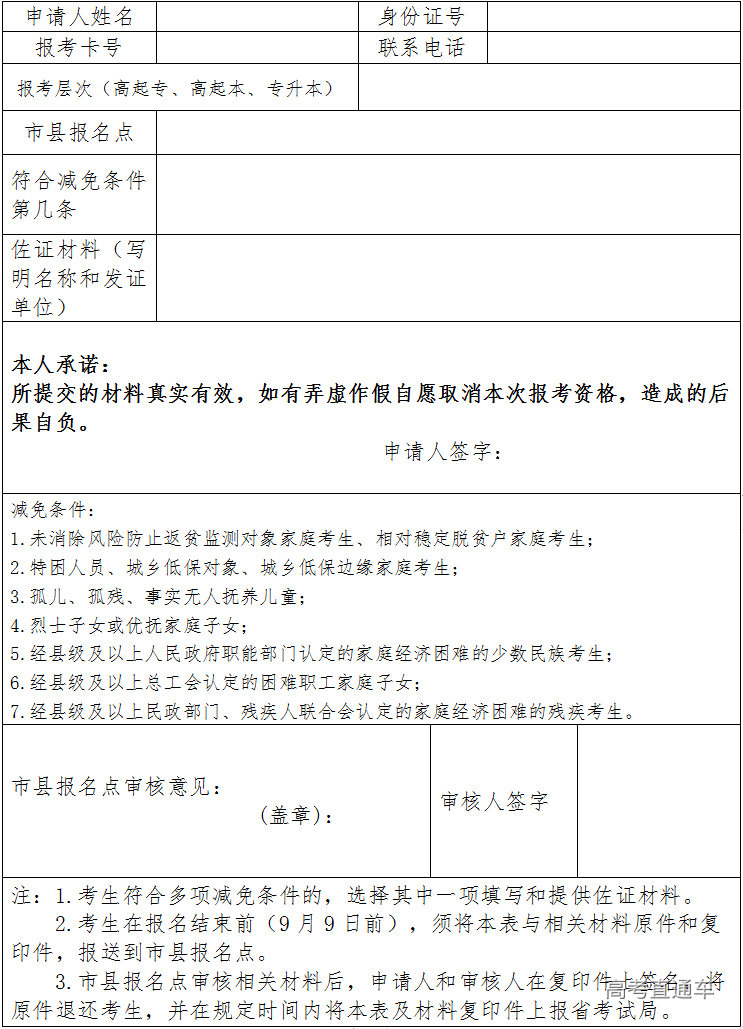 附件:1.2024年海南省成人高考减免考试费申请表
