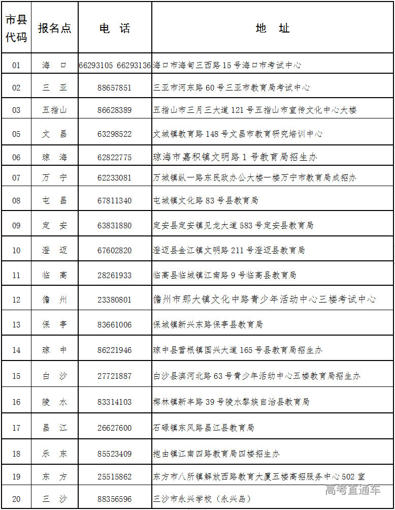 海南省成人高考报名点地址和联系电话