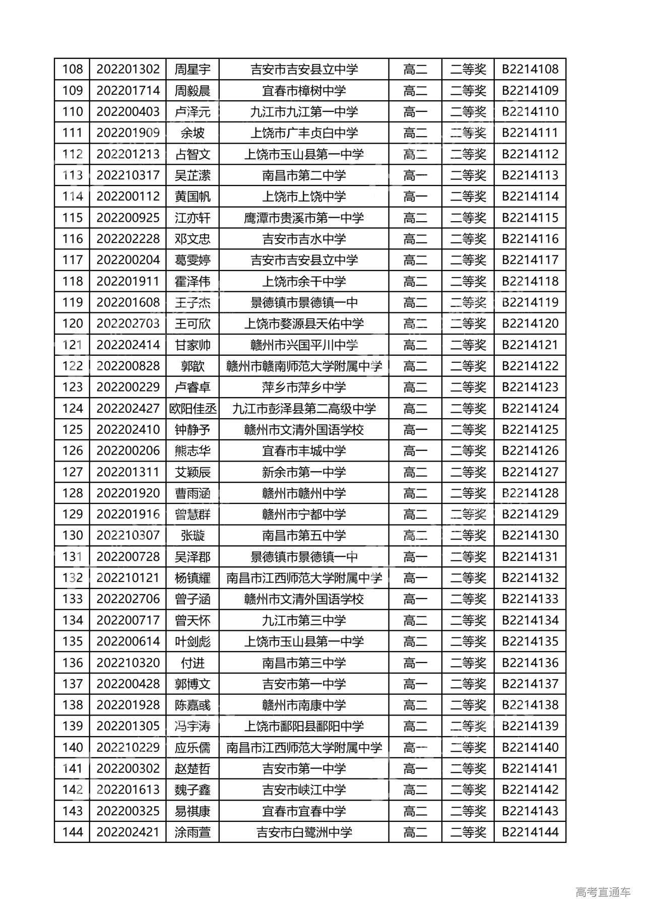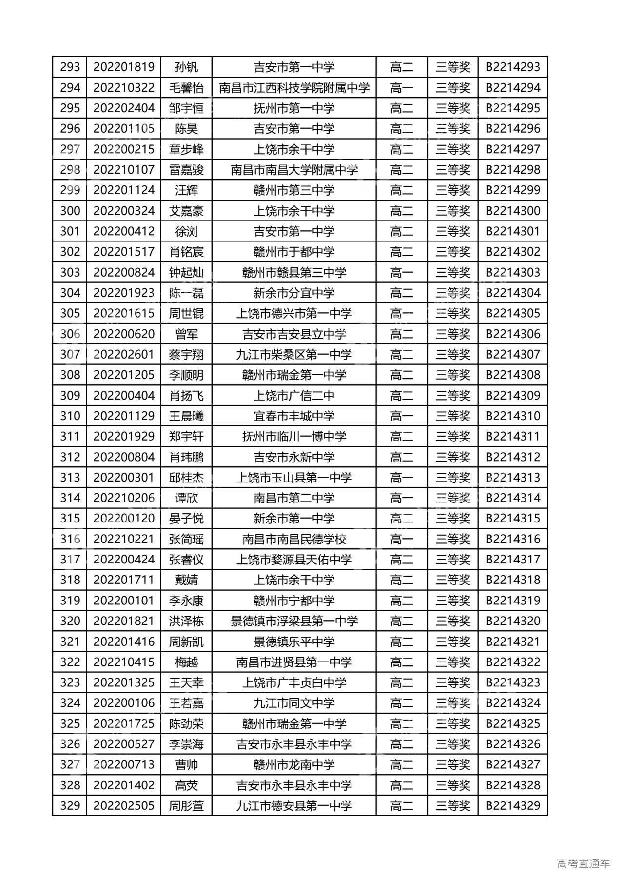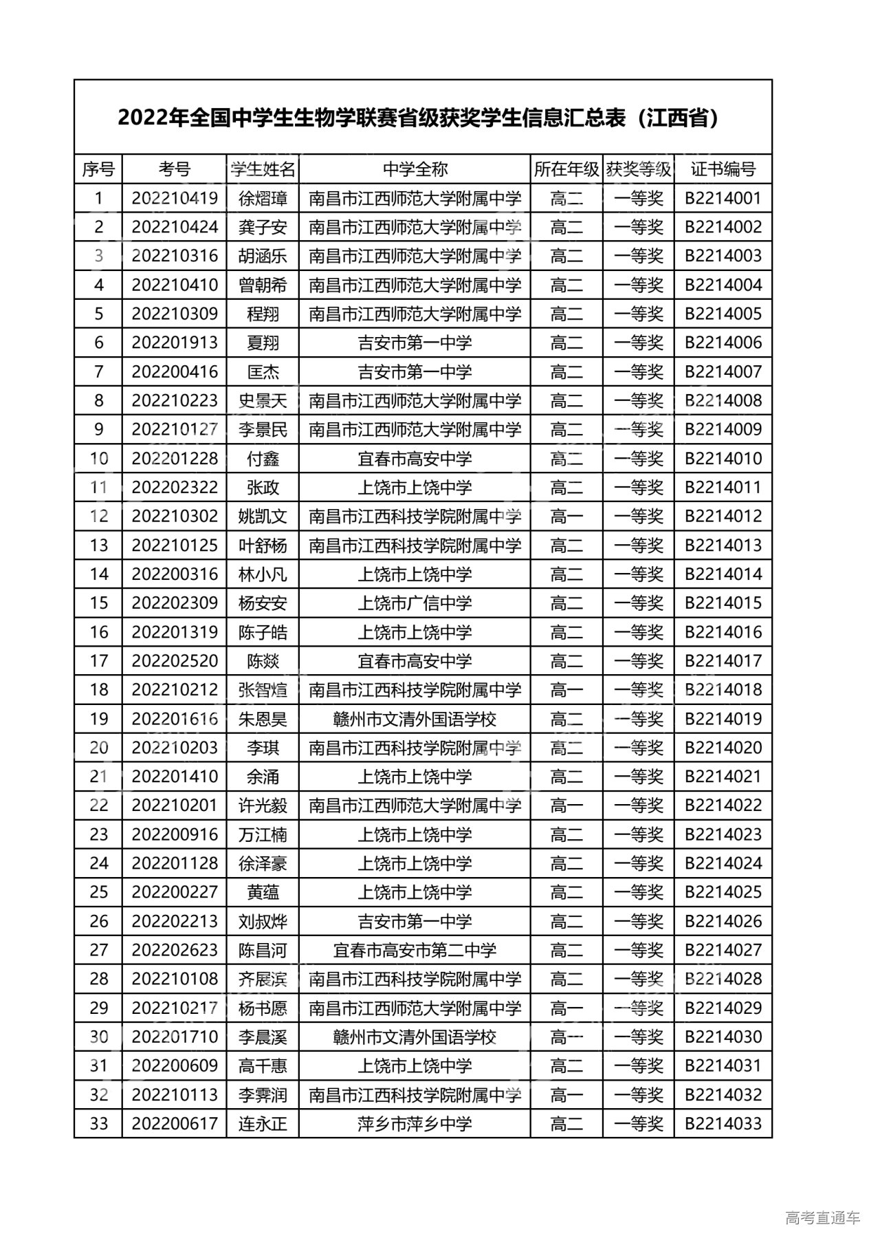 江西省2022年全国中学生生物联赛获奖名单