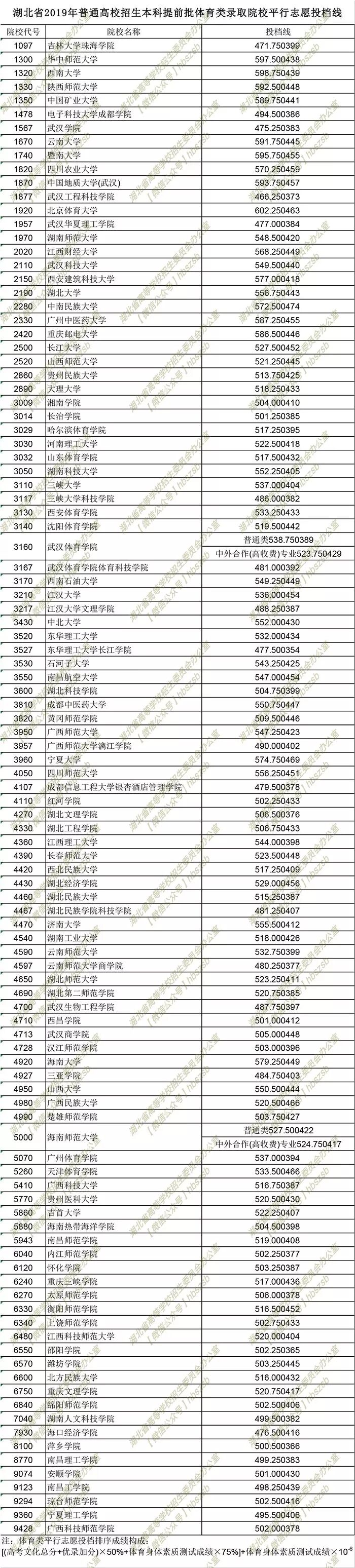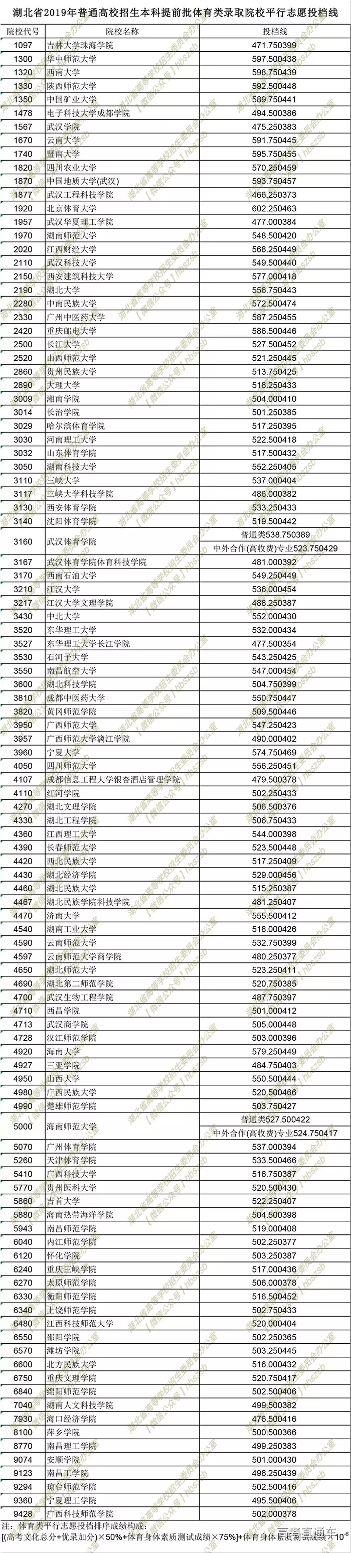 湖北省2019年普通高校招生本科提前批体育类录取院校平行志愿投档线