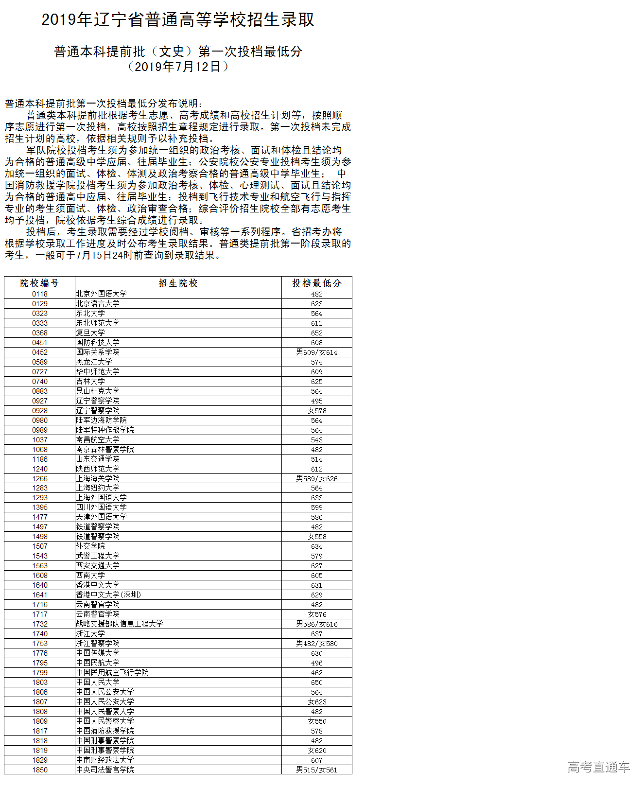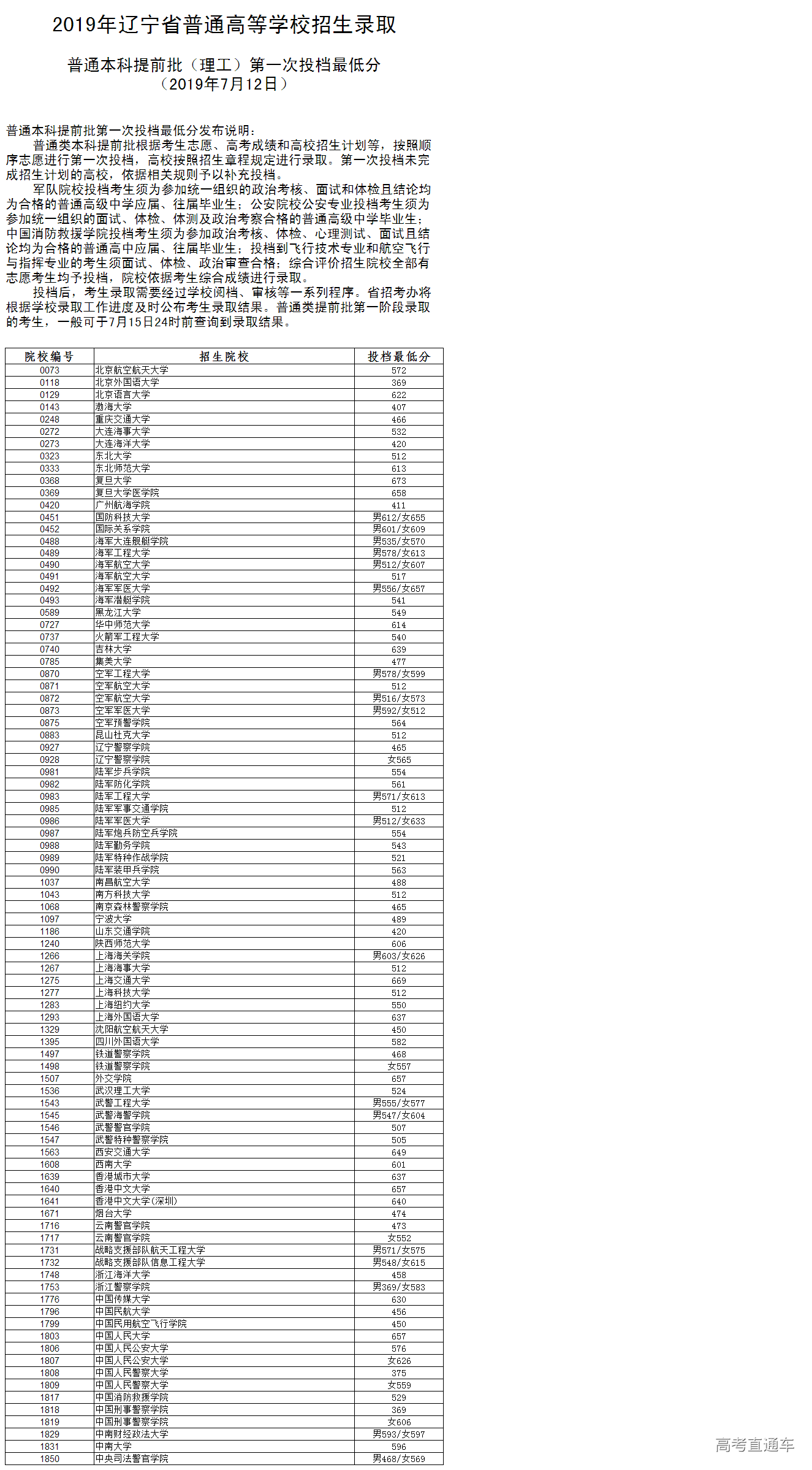 2019年辽宁省普通高等学校招生录取普通本科提前批第一次投档最低分