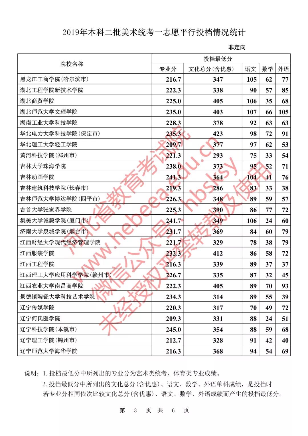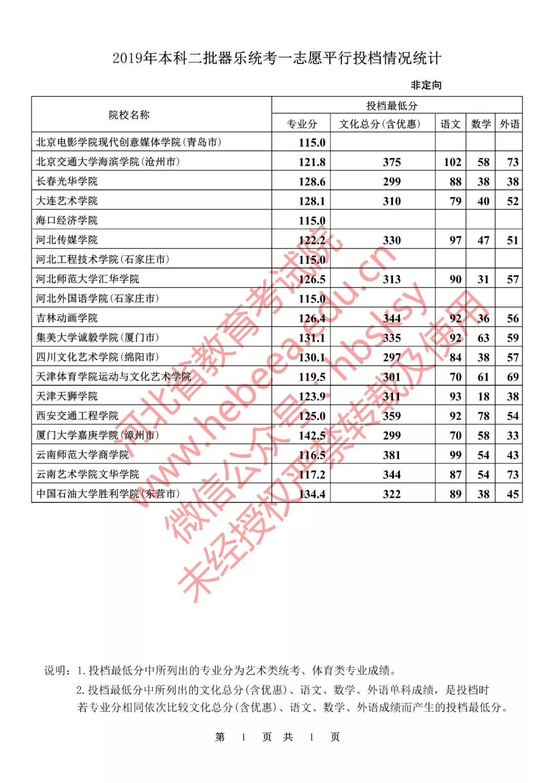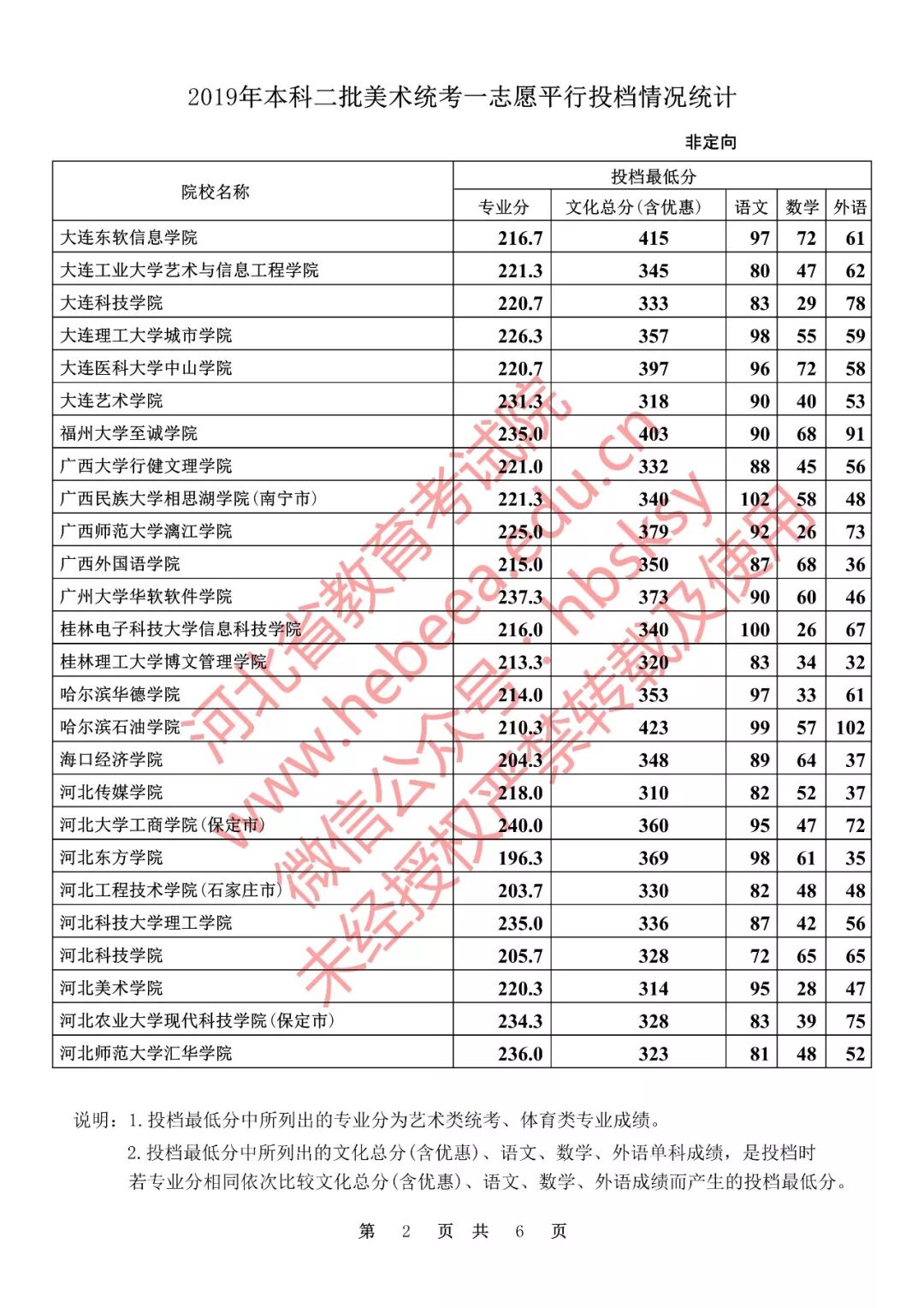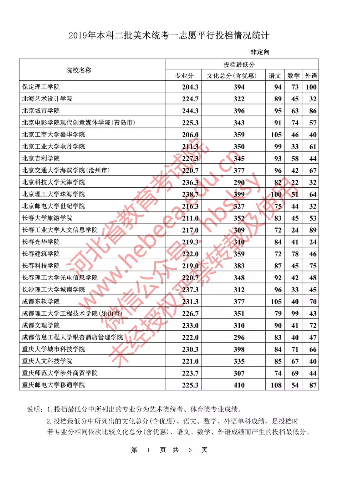 2.投档最低分中所列出的文化总分(含优惠)、语文、数学、外语单科成绩,是投档时若专业分相同依次比较文化总分(含优惠)、语文、数学、外语成绩而产生的投档最低分。