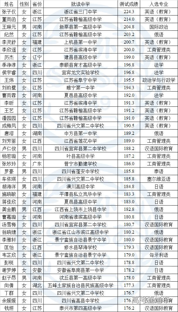 按照教育部有关文件要求,根据《2019年上海外国语大学高校专项计划招生简章》,我校于2019年6月16日举行了高校专项计划选拔测试,学校依据考生测试成绩(不分文理科类或选考科目),进行择优选拔,经学校招生工作领导小组审议,确定了2019年高校专项计划入选资格考生名单,现予公示: