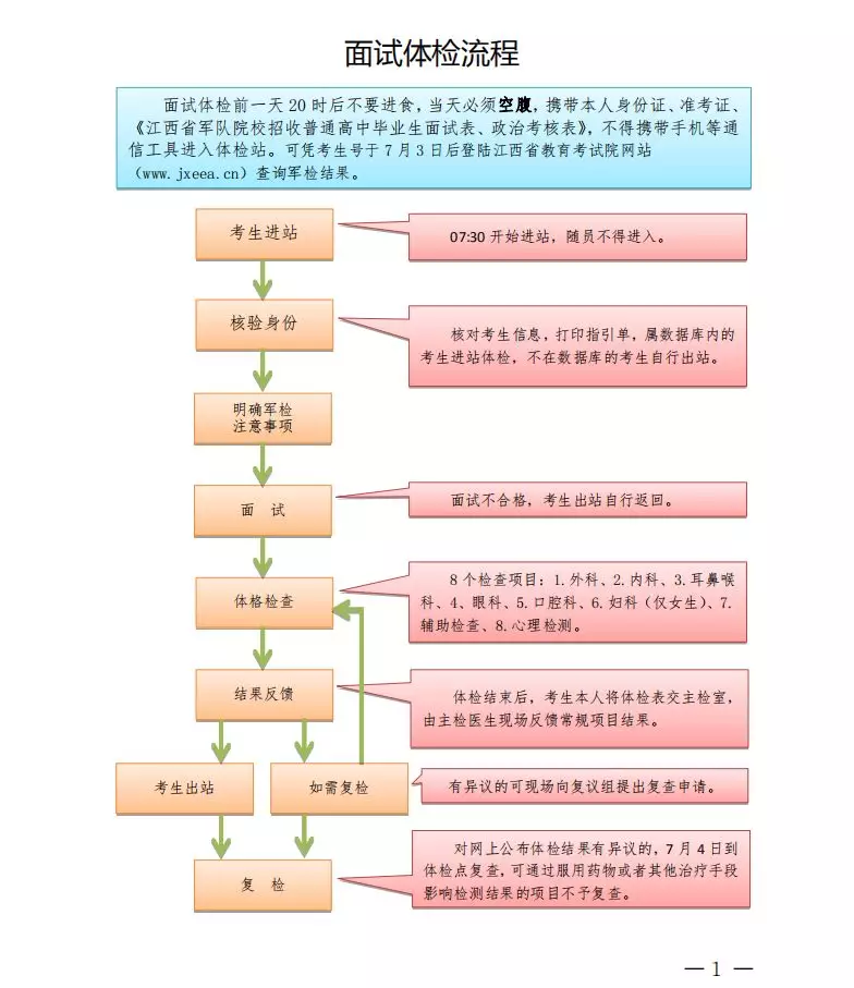 考生参加军检前一天20时后不要进食,当天必须空腹,7时30分进站,携带本人身份证、准考证和《江西省军队院校招收普通高中毕业生面试表、政治考核表》,到解放军第908医院。军检现场实行全封闭式管理,考生家长、非工作人员不得进入现场。请考生在军检前三日内,保持正常饮食和卫生,做好充分准备。