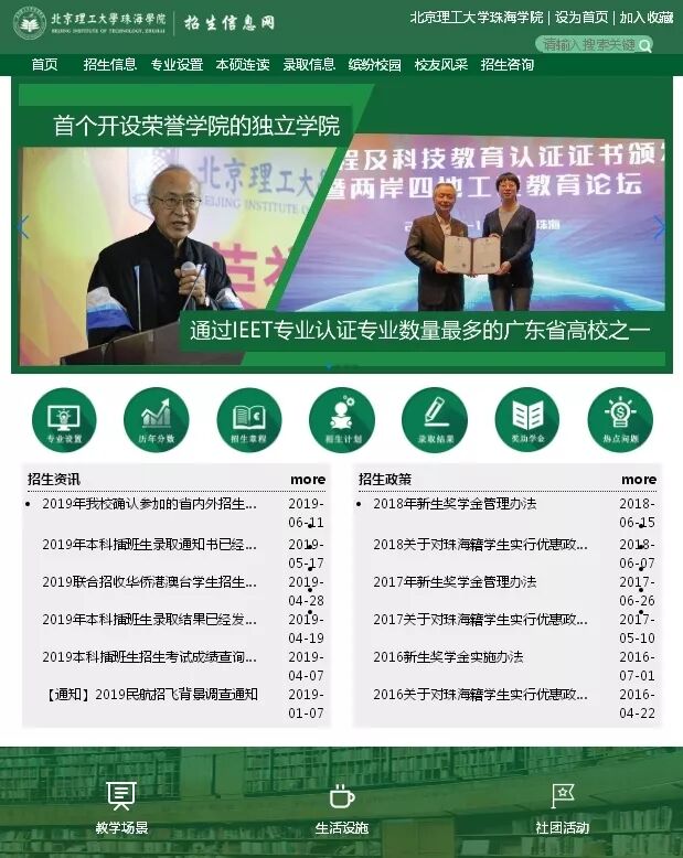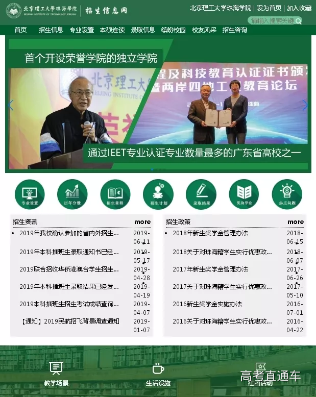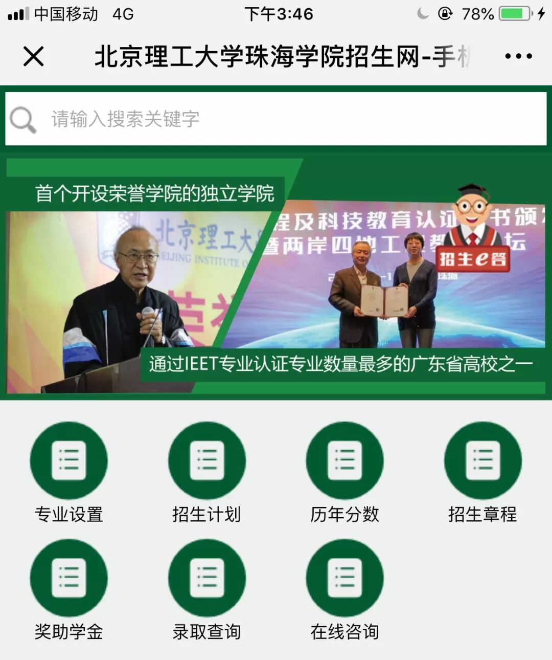 北京理工大学珠海学院官方微信平台▼ 四、招生信息网和校官网 为方便考生和家长浏览,2019年我校全面更新了招生信息网,页面简洁直观,内容涵盖专业设置、招生计划、历年分数、招生章程、奖助学金、录取查询、在线咨询、缤纷校园、校友风采等内容。 招生信息网、招生处公众号还利用新媒体技术的便利性开设了“在线问答“功能,全方位接收考生和家长咨询。 招生信息网手机版 手机扫一扫轻松浏览招生信息网内容▼ 招生信息网电脑版 招生信息网电脑版,点击文末“阅读原文”浏览 线下咨询会 一、省内省外高招咨询会 ★最终当地招生咨询会时间请以当地举办单位公布为准 如有疑问 投诉电话:0756-3622966 二、开放校园,现场咨询 为让社会各界、广大考生和家长深入了解我校软硬件办学实力、最新招生政策,将在2019年6月22日(星期六)-6月30日(星期日)开放校园。届时,图书馆、部分实验室、部分实习实训场、体育馆等场所开放,考生和家长可以入校参观和现场咨询。来访考生和家长将直接与招生工作人员面对面交流,咨询2019年招生事宜。