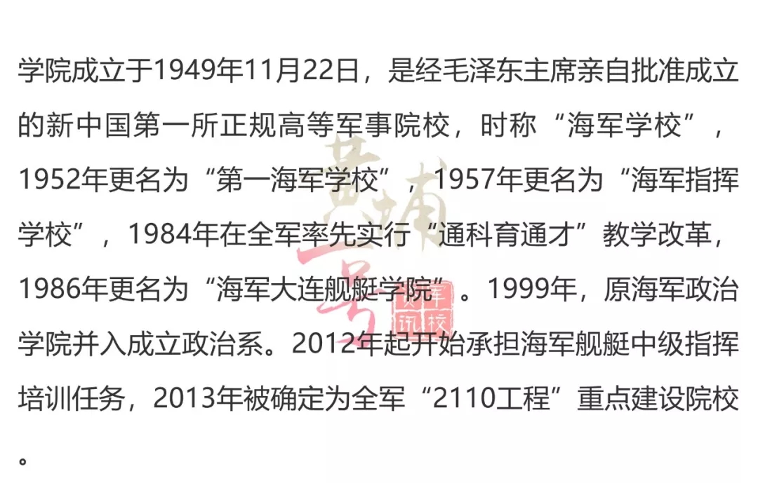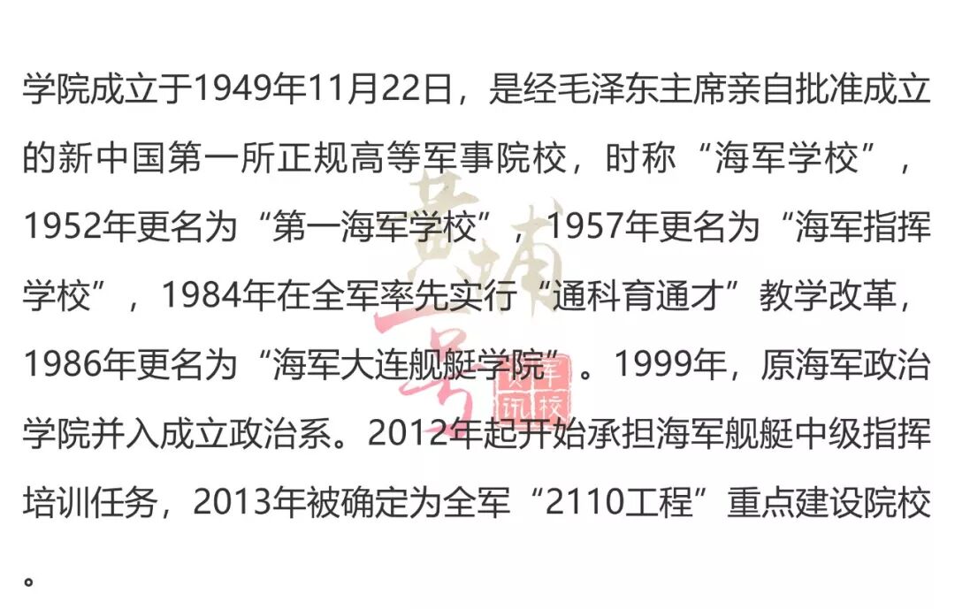 在美丽的黄海之滨,坐落着一所享誉中外的全军重点院校——海军大连舰艇学院。建校69年来,为人民海军培养了5万余名军政指挥军官、80%以上的舰艇长、近200名共和国将军,被誉为“海军军官摇篮”。