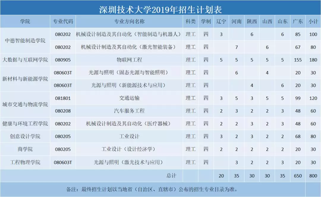 深圳技术大学2019年计划面向广东、辽宁、河南、陕西、山西、山东等六省招生,共计计划招生800人。在广东省,学校录取批次为本科批次,其他省(区、市)理科类列第一批(重点批或本科批)录取。具体的专业方向和招生人数见下表。