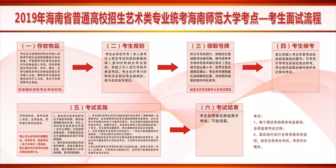 考生务必认真阅读《海南省考试局关于做好2019年海南省普通高等学校招生艺术类专业考试工作的通知》及《考生须知》,按应考类别考试的相关要求依时有序参加考试,要认真学习《中华人民共和国刑法》第二百八十四条有关考试作弊违法的规定、《国家教育考试违规处理办法》和《国家教育考试违规处理办法》,自觉遵守考试纪律,诚信应考。
