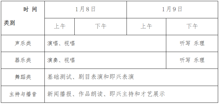 考试时间:2019年1月8日至9日,上午8:30-12:00,下午14:30-17:30,其中听写、乐理考试时间为1月9日下午3:00-4:40。