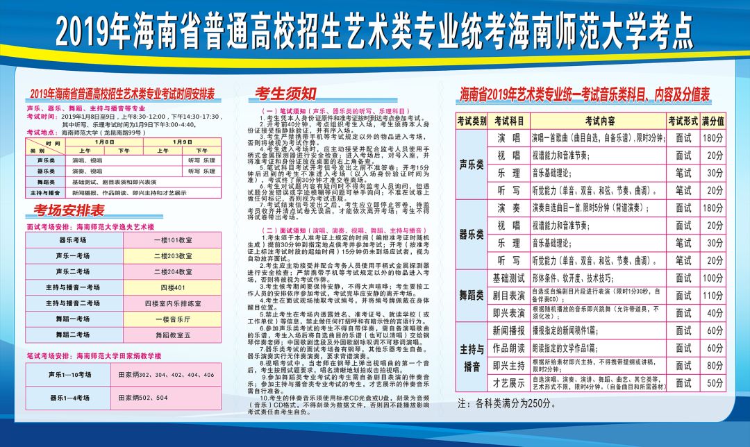 近日,海南省考试局发布《2019年海南省普通高校招生艺术类专业省级统考的公告 》。2019年我省普通高等学校招生艺术类专业考试定于2019年1月8至9日和1月12日进行。考试有关事项小编带你看!
