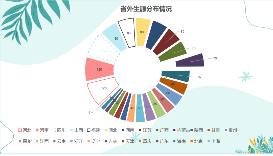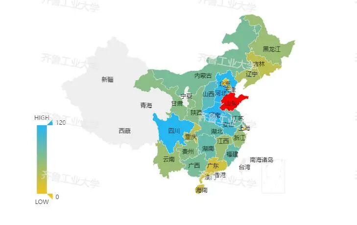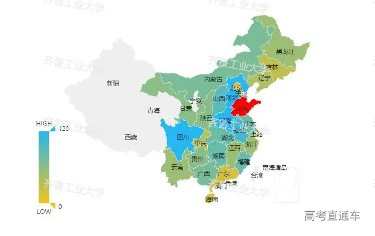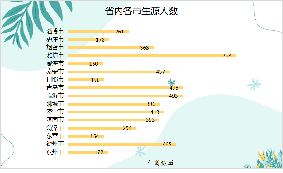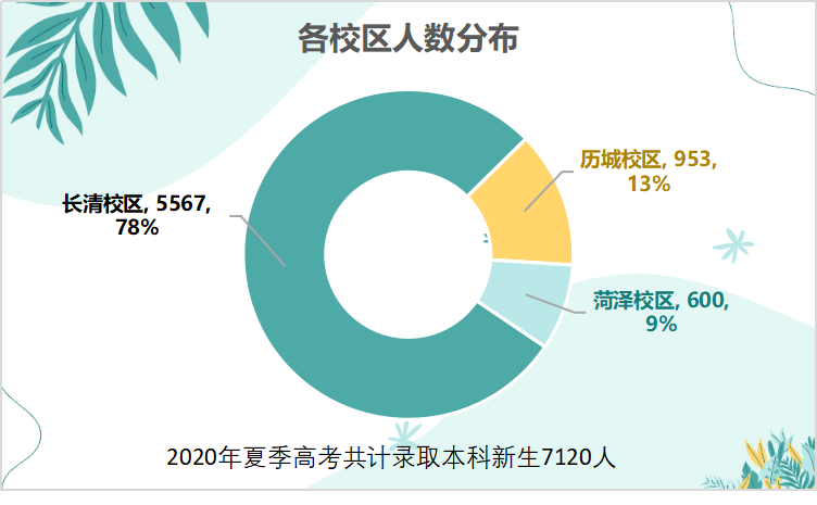 2020年夏季高考共计录取本科新生7120人,其中长清校区5567人,历城校区953人,菏泽校区600人,男生3793人,女生3327人。 其中省内生源占比最大,人数达到5548人,省外生源分布较为广泛,涉及到26个省、市、自治区:北至寒冷的黑龙江省,南抵四季如春的海南省,大家来自天南海北,四海八荒,将于9月16日跨越南北距离,一同相聚于工大。 山东省外新生数量排名前十的省份为:河北、河南、四川、山西、福建、湖北、湖南、江苏、广西、内蒙古。 山东省内生源人数占新生总数的77.9%,让我们一起了解一下省内各市生源的分布情况吧。 山东省内生源人数分布情况 奔赴我校的5548名山东新生分别来自我省470个高中学校。其中乐陵一中生源人数达到77人,位居高中生源排行第一名,其次便是生源人数分别达到62人、54人的泰安英雄山中学和莱州一中。