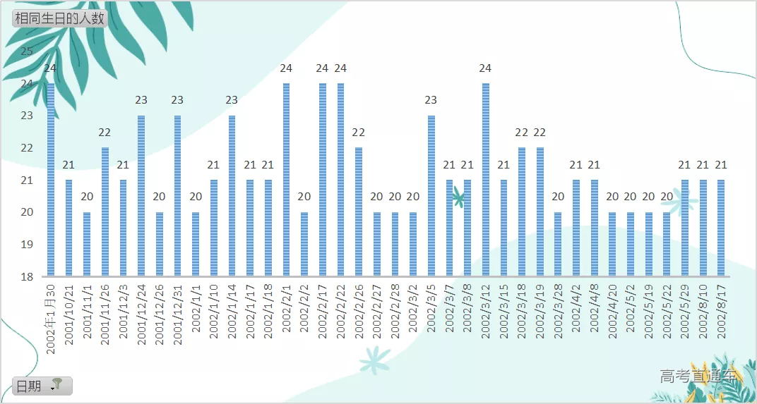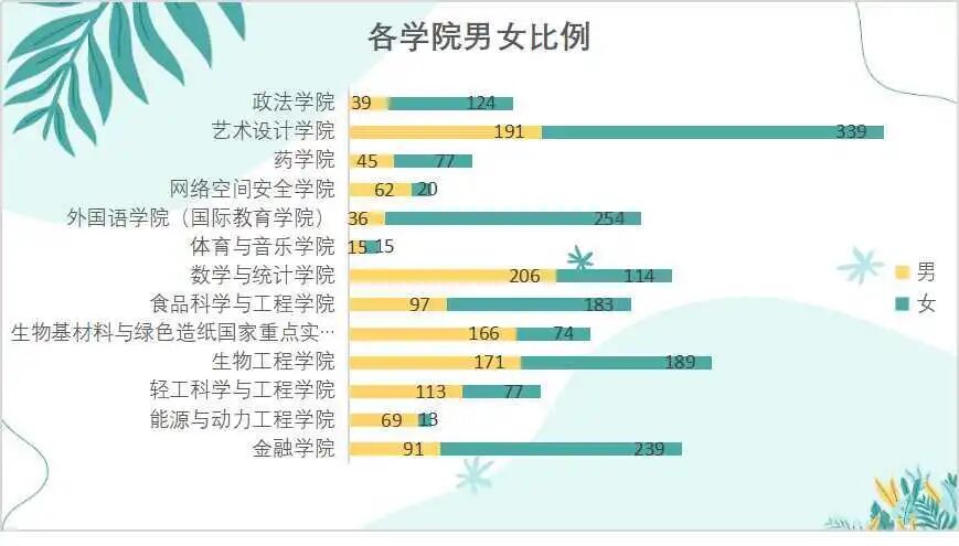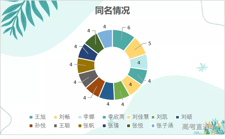 图片展示的仅是生源数超过30以上生源人数的高中学校,仔细看一下有没有你的高中母校呢? 2020级新生中,男生3793人,女生3327人,男女比例近1.12:1,男女比例明显缩小,接下来给大家看一下各个学院的男女比例情况,找一找自己学院的男女比例是否和你预想的一样呢? 2020级新生来自20个不同的民族,其中少数民族生源数前十名分别是:回族、壮族、满族、蒙古族、土家族、苗族、布依族、侗族、瑶族、朝鲜族。 其中有8个民族非常独特,新生数只有一名,他们分别是:藏族、穿青人、傣族、哈尼族、拉祜族、黎族、仫佬族、彝族。这么多少数民族的同胞汇聚在工大校园里,相信大家定会拥有一个无比丰富的大学生活。 2020年,来自“老王家”的孩子们,成为我校新生的“第一大家族”,姓氏榜单前三名仍旧是不动如山的“王”、“张”、“李”。紧随其后的是“刘”、“陈”、“赵”、“孙“。 . 01 姓氏 多者 此外,数据分析我校新生有近80个姓氏是独一无二的,这些学生开学军训时有可能很快就被教官、老师和同学们记住的哟! 02 . 姓氏 唯一 相遇一场既是缘分,有一些小萌新们还未相识便有了千丝万缕的联系,这便是更大的缘分。 通过数据分析我们得出我校新生同一天生日的人数分布情况,大家快看一下你的生日有没有包含其中呢,再看一下有多少可爱的小伙伴和你一同在工大过生日呢? 对于02年出生的小萌新来说,今年的生日应该也是你们的“成人礼”了,相信18岁的你们邂逅魅力十足的工大定能碰撞出不一样的“火花”。 成为一名工大人,走在工大的校园里,耳边听到自己的名字,然而视线所及处却是一个完全陌生的面孔,此时你是否会怀疑自己听错了呢,不要急着怀疑自己,因为可能是你遇到了“另一个自己”——一个和你名字一模一样的人,此时的你是不是会突然的感叹世界好小,你和另一个“自己”就这样相聚在工大的校园里。快让我们看一下有哪些萌新有机会遇到“另一个自己”吧。 此外图表中出现名字的小萌新不仅要做好与另一个自己“相遇”的心理准备,在报到以及核对相关信息时一定也要多加留意,仔细核对一下是不是自己。