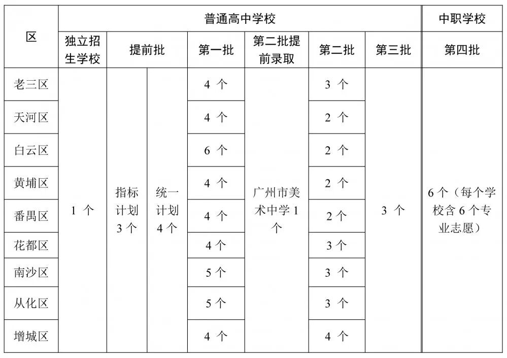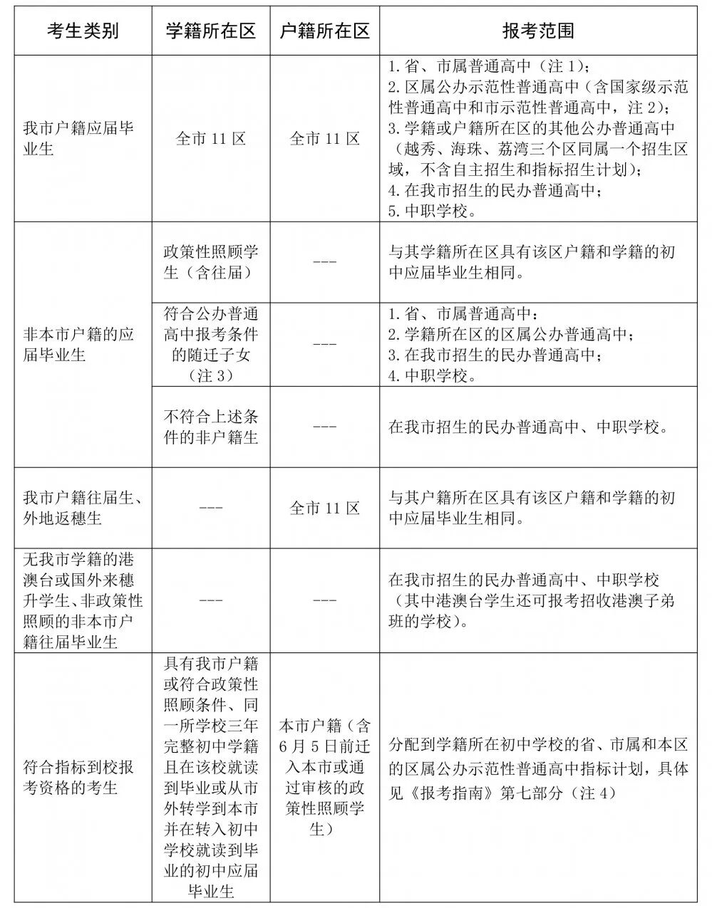 01 Q:我市高中阶段教育有哪些学校? A:我市高中阶段教育的学校有:普通高中(含公办和民办高中)、高职(高等学校五年制专科,下同)、中职学校(含教育系统的职业高中、普通中专,人力资源和社会保障系统的技工学校)。除高职院校招生工作由省教育考试院统一组织管理外,其他学校由广州市招生考试委员会办公室统一组织招生考试和录取工作。 02 Q:各类考生的报考范围是什么? A:各类考生的报考范围如下表 03 Q:跨区生的升学范围有何规定? A:学籍与户籍不在同一个区的我市户籍应届生,选择按户籍所在区升学的,称为“跨区生”,须在中考报名时提出跨区申请,报考范围与其户籍所在区具有该区学籍和户籍的应届初中毕业生相同。其中符合指标生报考资格的考生,无论是否跨区,都只能报考学籍所在学校分得的指标计划。 04 Q:越秀、海珠、荔湾三区的考生升学范围要注意什么? A:普通高中统招计划(不含自主招生和指标到校计划)招生时,三个区同属一个招生区域,即三个区的考生等同于一个区的考生,均可报考三区内的区属普通高中,不视作外区考生。 但三区的初中应届毕业生报考指标到校计划和参加自主招生时,只能报考分配到学籍所在初中学校的区属示范性普通高中指标计划和学籍所在区(外地返穗生为户籍所在区)区属示范性高中的自主招生计划,以及省市属示范性普通高中指标计划和自主招生计划,不能报考其他区属的示范性普通高中指标计划和自主招生计划。 05 Q:如何理解区属示范性普通高中学校可在提前批面向全市招生,但招收学校所在区以外的学生人数不能超过本校当年招生总计划的15%? A:区属公办示范性(含国家级示范性和广州市示范性)普通高中学校可在提前批面向全市招收我市户籍生和政策性照顾学生,但招收学校所在区以外的学生人数不能超过本校当年招生总计划的15%。具体招生计划数详见《报考指南》第七部分普通高中提前批统一计划招生各校“外区招生最大计划数”。 例如:某校今年招生总计划为500人,在提前批安排招生计划200人,其中最多安排75人(占总计划15%)招收学校所在区以外的学生,余下125人面向本区招生;其余计划安排在第一批面向本区招收300人。 区属示范性高中在提前批面向全市招生,考生选择更多,建议考生结合自身学业水平,参照招生学校往年录取分数,可适当考虑报考外区示范性高中。 06 Q:我市高中阶段学校招生批次有哪些,录取顺序如何? 第四批:各级各类中职学校(含职业高中、普通中专、技工学校)。 录取顺序依次按照:独立招生学校、提前批指标计划、提前批统一计划,第一批、第二批提前录取、第二批、第三批、普通高中补录、第四批(中职学校录取)、中职学校补录(注册入学方式)进行。 07 Q:各批次志愿个数是多少? A:各批次志愿个数如下表 注:1.上述为各区各批次可填报志愿个数上限,即最多可填报公办高中和民办高中数之和,有的批次只有公办高中或民办高中,例如提前批指标计划只可填报公办高中,第二批提前录取只可填报广州市美术中学,第三批只有民办高中,各批次填报数量不超过志愿数上限即可。 2.第二批提前录取仅限报考广州市美术中学,所有报考该校的考生需参加学校组织的美术专业评选。 08 Q:如何填报志愿? A:我市高中阶段学校招生实行网上填报志愿,考生凭考生号、密码或粤省事登录“广州市高中阶段学校招考服务平台”(https://zhongkao.gzzk.cn/,以下简称“中考服务平台”)填报志愿。 (一)填报志愿时间:2020年7月6日8:30至7月10日15:00。考生须在2020年7月10日(星期五)15:00前对网上填报的志愿信息予以确认,逾时未确认的志愿信息无效。 (二)填报志愿流程:选择“志愿填报”功能→修改新密码(仅首次进入需要)→填报各批次学校志愿→修改、核对志愿→确认志愿信息。 志愿填报期间内,如考生要对已确认的信息再作修改,可向毕业学校提出申请,由学校(报名点)将考生的志愿状态恢复为“未确认”,考生再登录系统进行修改并确认,逾期不能修改和确认。 09 Q:填报志愿要注意什么? A:(一)妥善保管密码。考生登录中考服务平台进入志愿填报后,一定要修改初始密码,密码的设置要有一定的难度,注意不要使用过于简单、短小和易破解的字符(如本人生日),修改密码后要妥善保管。对于考生因密码丢失导致的填报志愿与考生本人或家长意愿不符的问题,由考生自行负责。对于考生填报意愿与家长要求相冲突发生的争议,由考生与家长自行协商后确定志愿填报。 (二)填报志愿须及时网上确认。为保证志愿信息准确无误和提高志愿录入的效率,考生可先填写志愿拟稿表(只作拟稿用),再在网上录入志愿信息,认真校对后再作确认。若录入的志愿信息与志愿表不符,市招考办只以考生网上确认的志愿信息为准。考生须在7月10日(星期五)15:00前对网上填报的志愿信息予以确认,逾时未确认的志愿信息无效。 (三)了解投档录取规则合理填报志愿。我市对各类招生学校,均实行在录取控制分数线上按志愿优先的投档方式。填报志愿与投档、录取的方式有密切的联系。考生须了解清楚投档录取规则及有关规定再合理填报志愿。具体投档规则和相关规定详见《报考指南》第二、三部分。 (四)填报志愿要承担责任和风险。志愿填报情况与录取直接相关,考生因填报志愿不合理造成落选的,由考生本人承担责任。尤其须提