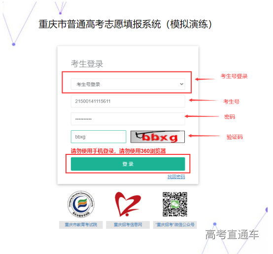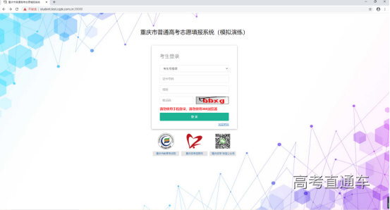 请访问重庆招考信息网(http://www.cqzk.com.cn/)或教育考试院门户网站(http://www.cqksy.cn/)进入重庆市普通高考志愿填报系统(模拟演练)志愿填报系统首页。