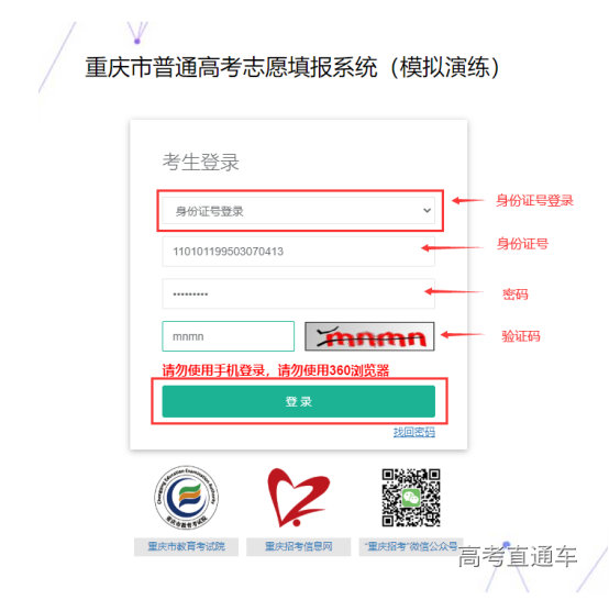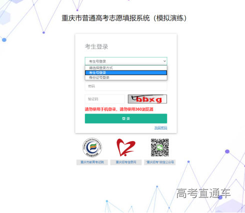 两种登录方式:点击下拉框可分别选择用考生号登录或身份证号登录。