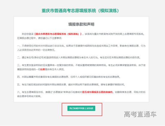 首次登录的考生需要知晓填报条款和声明,确认无误后点击【我已知晓并同意上述条款】按扭进入考生信息确认