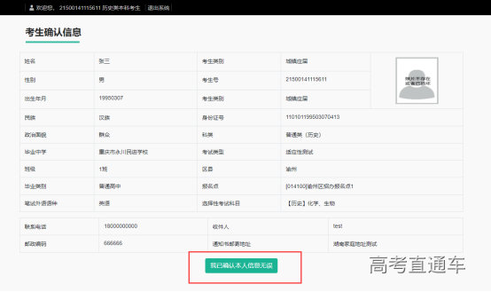首次登录的考生需要确认个人基本信息,若确认无误点击【我已确认本人信息无误】按扭进入下一步。若有误请联系区县招办核实更正。