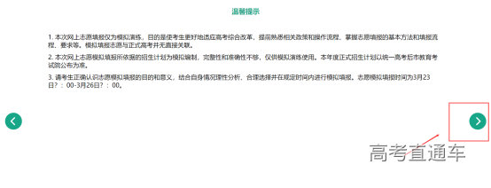 登录成功的考生请浏览温馨提示,浏览完毕点击右则箭头按扭,进入下一页,直至进入志愿填报主页面。