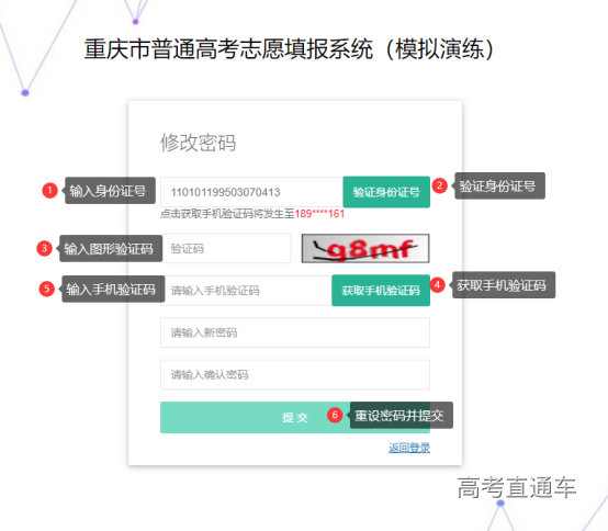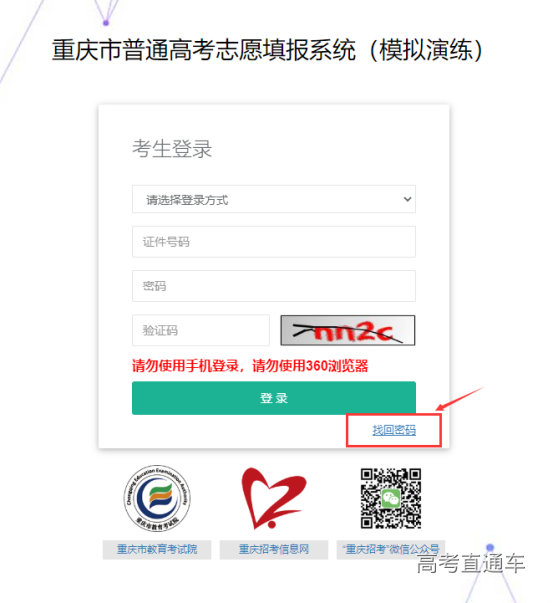 之前在登录时提到了需要输入高考报名时设置的密码,如果这个密码忘记了也不要着急,本系统提供找回密码方式:手机找回密码。密码找回需用报名时填报的手机号,若有变动请回本校报名处修改。
