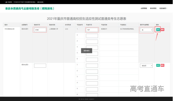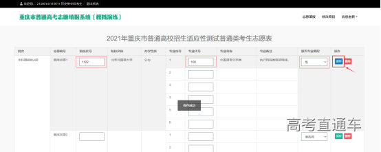 若要修改一条志愿,则在原来的志愿上重新依次填写“院校代号”、“专业代码”和“专业调配”,点击保存,此时系统提示志愿保存成功,即表示一条志愿修改完毕。