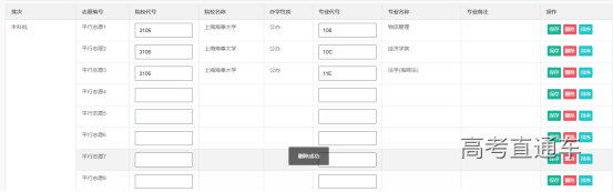 若要删除一条志愿,则点击需要删除的该条志愿后面的【删除】按钮,此时系统提示志愿删除成功,即表示一条志愿删除完毕。
