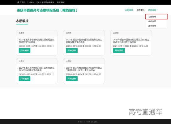 第二步,点击“志愿信息”进行查看,在完成志愿填报并保存之后,将显示出考生所填的志愿信息。
