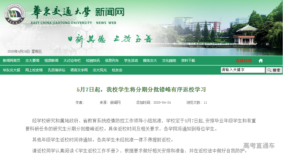 关于2020年春季学期学生返校时间的通知 经学校研究和属地政府、省教育系统疫情防控工作领导小组批准,学校定于5月7日起,安排毕业年级学生和有重要科研任务的研究生分期分批错峰返校。具体返校时间及相关要求,由各学院通知到每位学生。其他年级学生返校时间待通知。各类学生未经批准一律不得提前返校。 请返校同学认真阅读《学生返校工作手册》,根据要求做好相关安排和准备,并在返校途中做好自我防护。 华东交通大学 2020年4月24日 东华理工大学