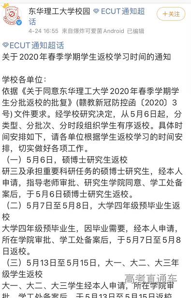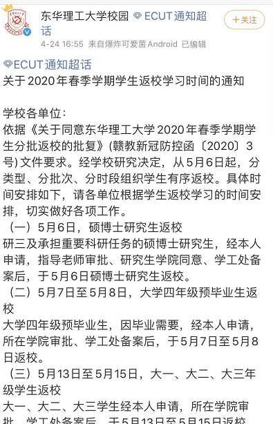 依据《关于同意东华理工大学2020年春季学期学生分批返校的批复》(赣教新冠防控函〔2020〕3号)文件要求。经学校研究决定,从5月6日起,分类型、分批次、分时段组织学生有序返校。具体时间安排如下,请各单位根据学生返校学习的时间安排,切实做好各项工作。 (一)5月6日,硕博士研究生返校 研三及承担重要科研任务的硕博士研究生,经本人申请,指导老师审批、研究生学院同意、学工处备案后,于5月6日硕博士研究生返校。 (二)5月7日至5月8日,大学四年级预毕业生返校 大学四年级预毕业生,因毕业需要,经本人申请,所在学院审批、学工处备案后,于5月7日至5月8日返校。 (三)5月13日至5月15日,大一、大二、大三年级学生返校 大一、大二、大三学生经本人申请,所在学院审批、学工处备案后,于5月13日至5月15日返校。其中5月13日大三学生返校,5月14日大二学生返校,5月15日大一学生返校。 (四)5月14日至5月15日,研一、研二年级研究生返校 研一、研二年级学生经本人申请,所在学院审批、学工处备案后,于5月14日至5月15日返校。其中5月14日研二学生返校,5月15日研一学生返校。 (五)5月16日开始,其他批次学生返校 因各种原因,不能按时返校的学生,经本人申请,相关二级学院审批、学工处审核同意后,可以自5月16日开始,分期分批错峰返校。