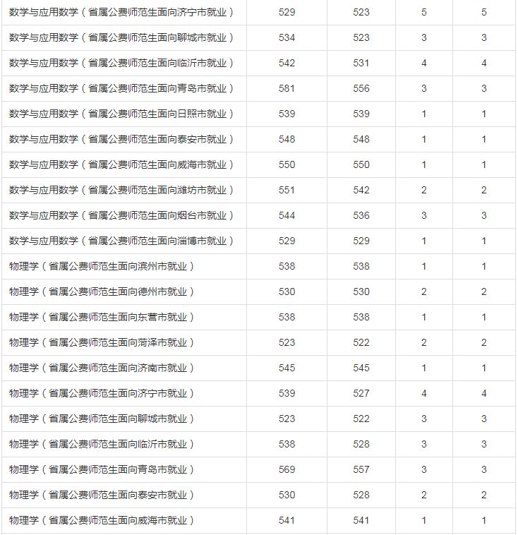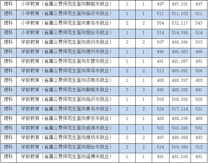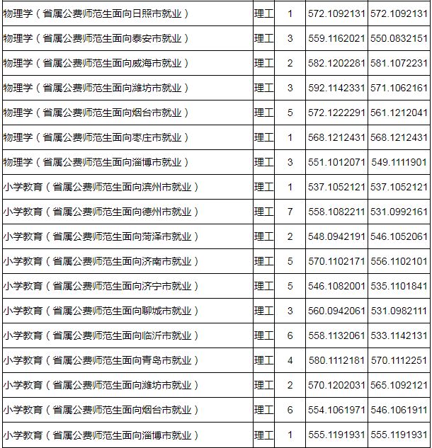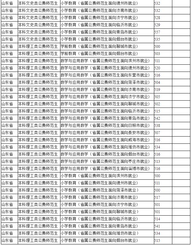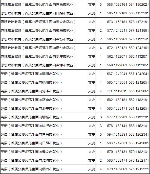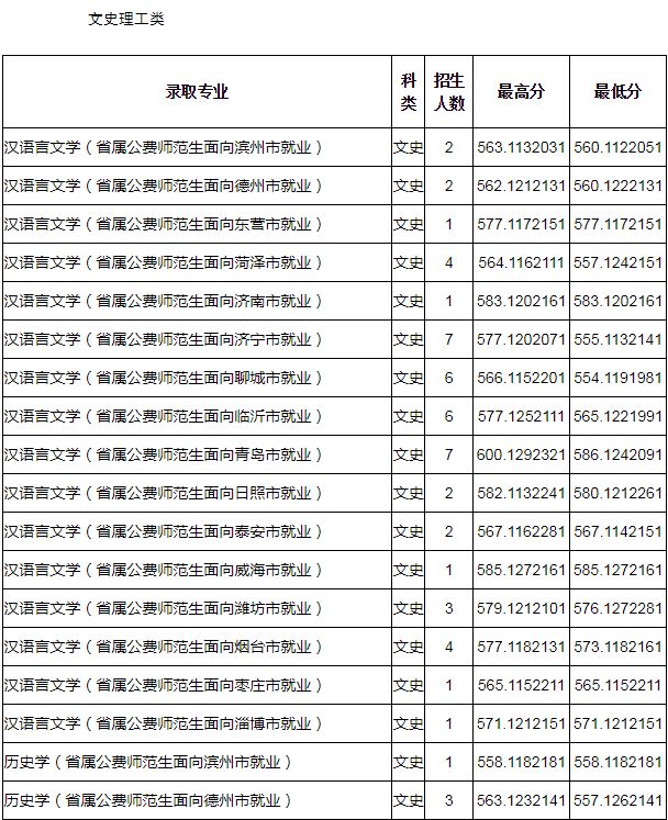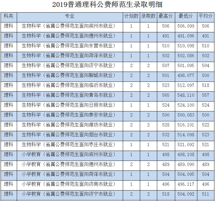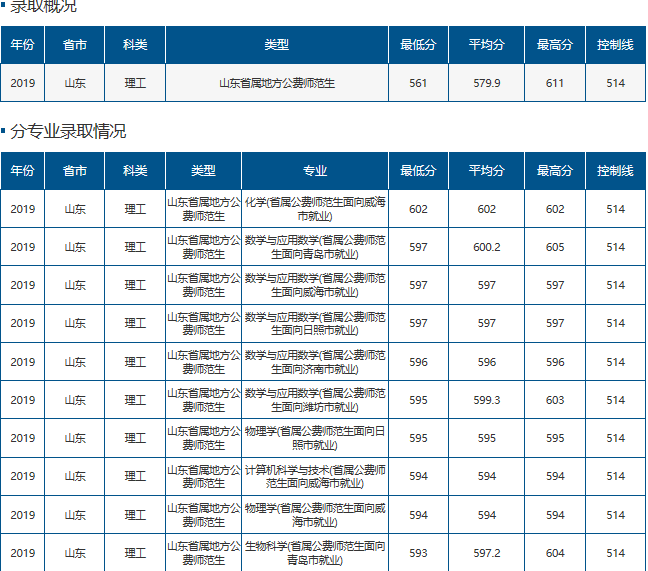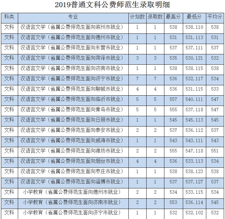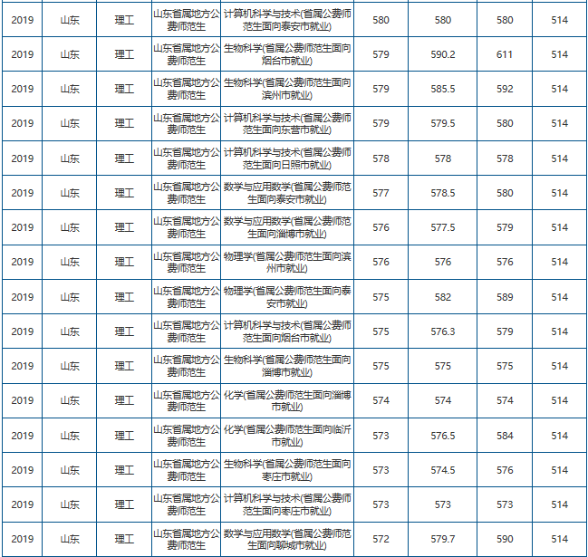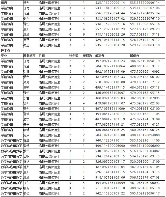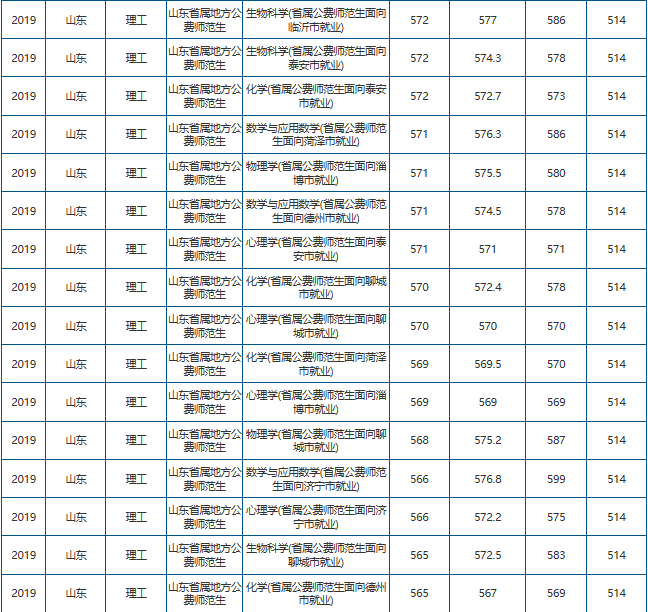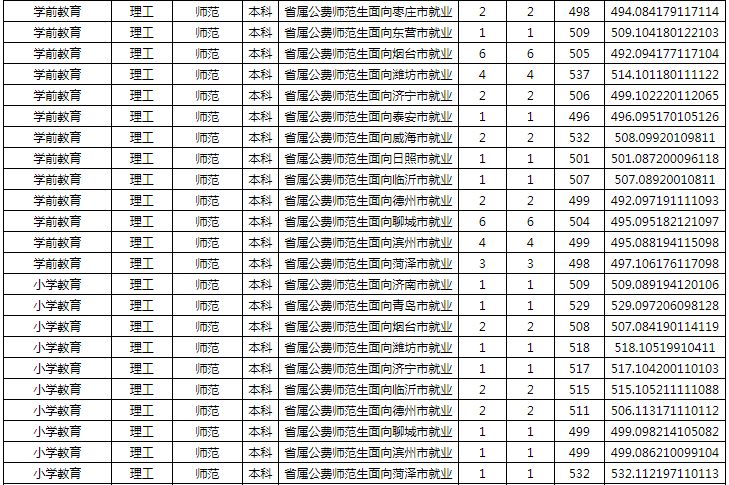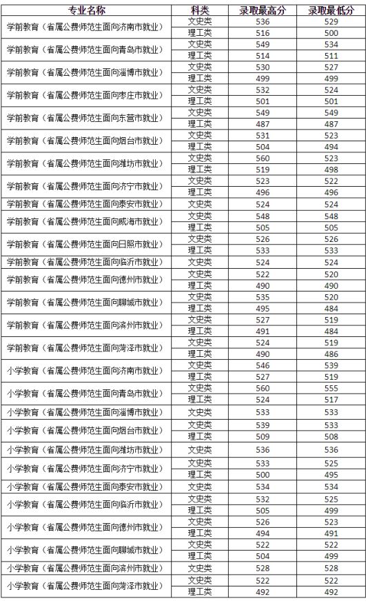 2019年山东省属院校公费师范生培养任务由山东师范大学、青岛大学、济南大学、山东理工大学、曲阜师范大学、聊城大学、鲁东大学、临沂大学、齐鲁师范学院、山东女子学院、潍坊学院、泰山学院、滨州学院、枣庄学院、菏泽学院、济宁学院、德州学院等17所高校承担。 委培师范生培养任务由山东师范大学、曲阜师范大学、聊城大学、鲁东大学、泰山学院、临沂大学、滨州学院等7所高校承担。 山东师范大学2019年公费师范生录取数据 2019年山东师范大学在山东省内共录取5330人。 山东省公费师范生、委培师范生、综合评价、普通文理类省内招生录取分数线再创历史新高。 本科提前批共录取1609人,其中录取公费师范生538人,文史类242人,最低分562分,录取位次13000名;理工类227人,最低分561分,录取位次43293名,较2018年文史类提升5000位次,理工类提升7000位次。 首次招收委培师范生,文史类最低分540分,理工类最低分556分。 2019年详细录取数据见下表: 青岛大学2019年公费师范生录取数据 2019年,公费师范生招生计划200人,比去年减少20人;招生专业5个,与去年持平。录取的文科最高分595分,高重点线53分;理科最高分586分,高重点线72分。 济南大学2019年公费师范生录取数据 济南大学在山东省属地方公费师范生招生录取结束。理工录取109人,省控线443分,录取成绩最低516分;文史录取106人,省控线503分,录取成绩最低539分。 山东理工大学2019年公费师范生录取数据 曲阜师范大学2019年公费师范生录取数据 聊城大学2019年公费师范生录取数据 聊城大学2019年在山东省本科提前批录取工作自7月2日开始,于7月10日顺利结束,首次志愿即完成招生计划。本科提前批包括公费师范生(含艺术类、体育类、普通文理类)、委培师范生及公费农科生招生专业,共录取752人。其中,公费师范生594人,委培师范生128人,公费农科生30人。 从录取情况看,生源数量充足,生源质量进一步提高。2019年,公费师范生文史类录取平均分为556分,超出自主招生录取控制参考线14分;理工类录取平均分为538分,超出自主招生录取控制参考线24分;艺术体育类生源质量较往年也有明显提高。 委培师范生是山东省2019年新增招生类型,生源数量充足,生源质量较高,文史类录取平均分为550分(面向泰安)、543分(面向滨州),分别超出自主招生录取控制参考线8分和1分;理工类录取平均分为536分(面向泰安)、523分(面向滨州),分别超出自主招生录取控制参考线22分和9分。公费农科生是我校2019年新增招生类型,招生专业为植物保护,录取平均分为512分,超出普通批录取控制分数线69分。 鲁东大学2019年公费师范生录取数据 齐鲁师范学院2019年公费师范生录取数据 7月10日,齐鲁师范学院本科提前批公费师范生已录取结束。共录取考生300人。 艺术文文化最高分492分,最低分448分,专业最高分246.66分,最低分216分。理科最高分569.114分,最低分504.083分。文科最高分577.123分,最低分529.114。 具体分专业分地市录取情况如下: 山东女子学院2019年公费师范生录取数据 枣庄学院2019年公费师范生录取数据 菏泽学院2019年公费师范生录取数据 济宁学院2019年公费师范生录取数据 德州学院2019年公费师范生录取数据 德州学院2019年山东省本科提前批公费师范生录取完成!共录取180名新生!