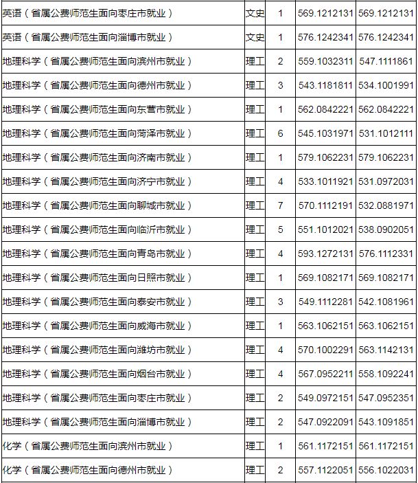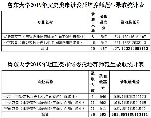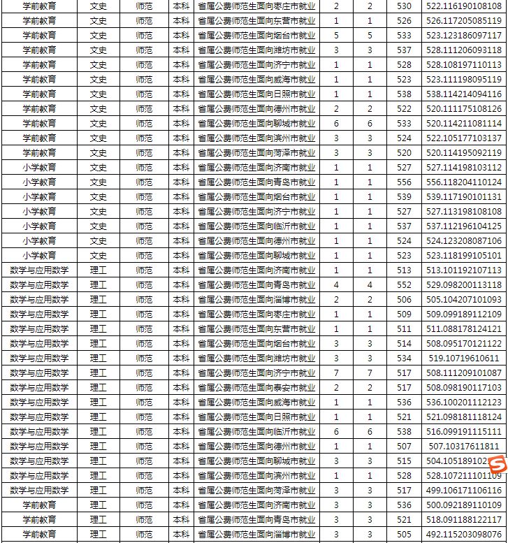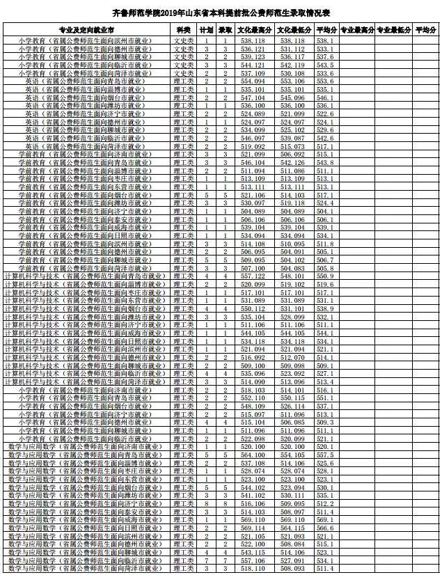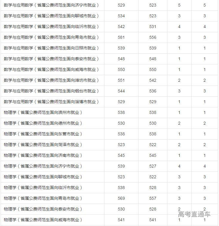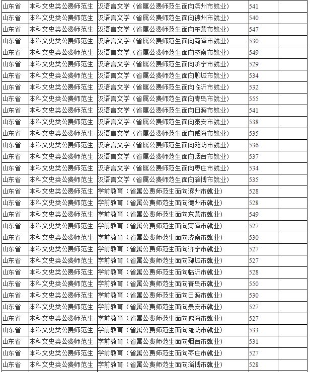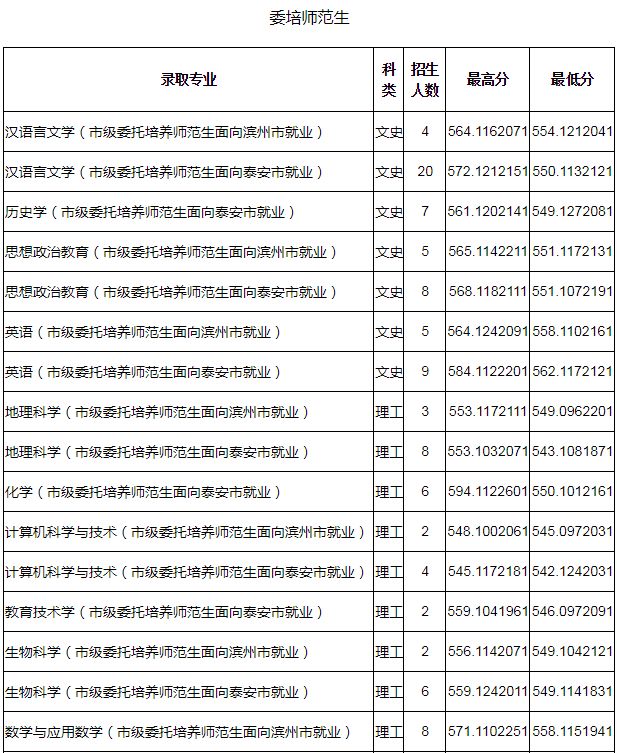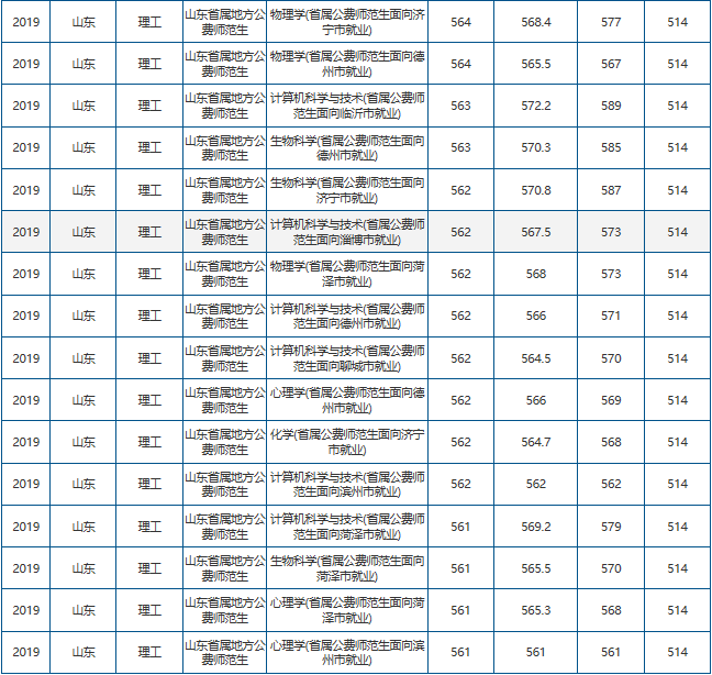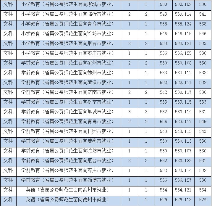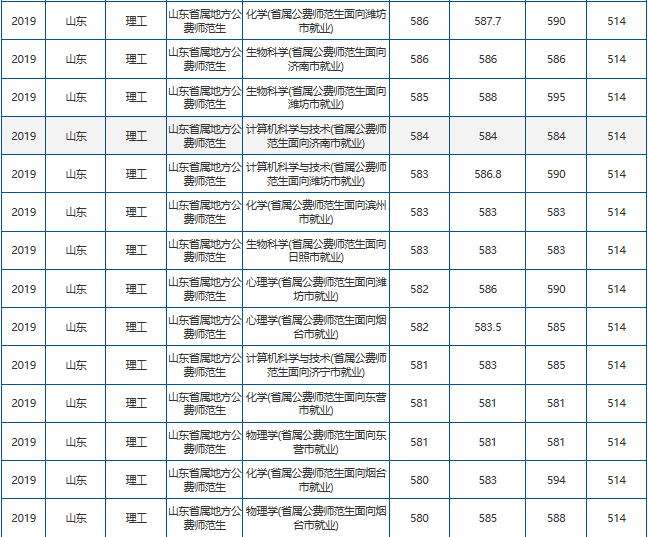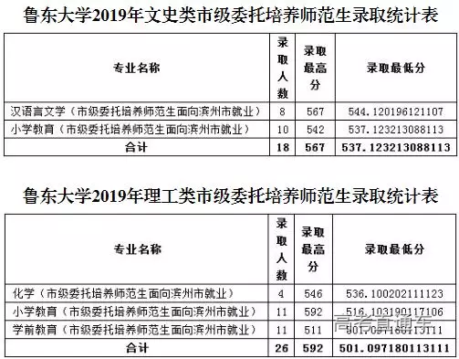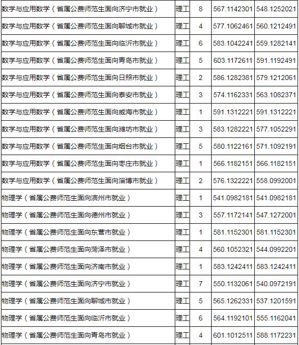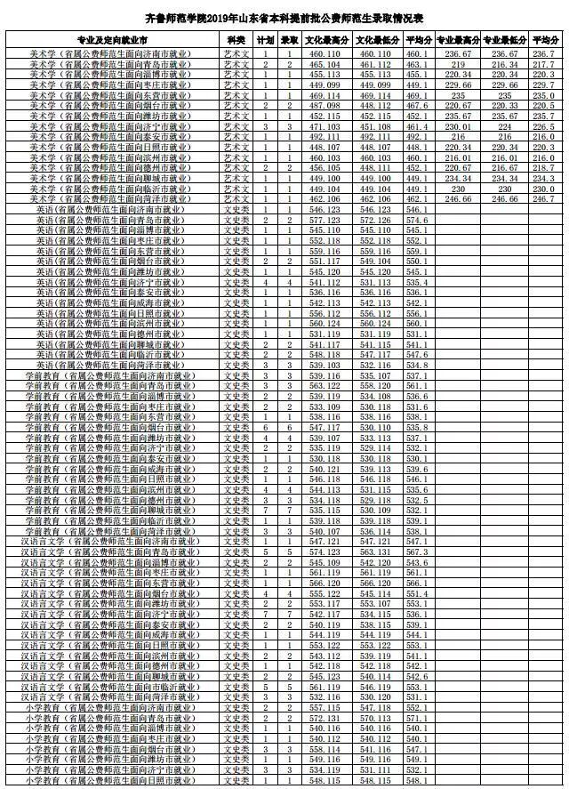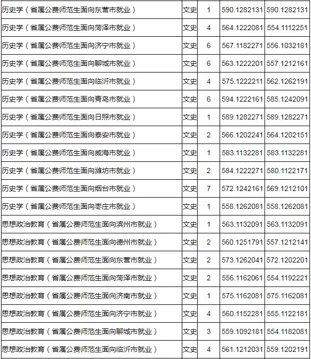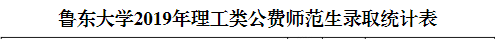 2019年山东省属院校公费师范生培养任务由山东师范大学、青岛大学、济南大学、山东理工大学、曲阜师范大学、聊城大学、鲁东大学、临沂大学、齐鲁师范学院、山东女子学院、潍坊学院、泰山学院、滨州学院、枣庄学院、菏泽学院、济宁学院、德州学院等17所高校承担。 委培师范生培养任务由山东师范大学、曲阜师范大学、聊城大学、鲁东大学、泰山学院、临沂大学、滨州学院等7所高校承担。 山东师范大学2019年公费师范生录取数据 2019年山东师范大学在山东省内共录取5330人。 山东省公费师范生、委培师范生、综合评价、普通文理类省内招生录取分数线再创历史新高。 本科提前批共录取1609人,其中录取公费师范生538人,文史类242人,最低分562分,录取位次13000名;理工类227人,最低分561分,录取位次43293名,较2018年文史类提升5000位次,理工类提升7000位次。 首次招收委培师范生,文史类最低分540分,理工类最低分556分。 2019年详细录取数据见下表: 青岛大学2019年公费师范生录取数据 2019年,公费师范生招生计划200人,比去年减少20人;招生专业5个,与去年持平。录取的文科最高分595分,高重点线53分;理科最高分586分,高重点线72分。 济南大学2019年公费师范生录取数据 济南大学在山东省属地方公费师范生招生录取结束。理工录取109人,省控线443分,录取成绩最低516分;文史录取106人,省控线503分,录取成绩最低539分。 山东理工大学2019年公费师范生录取数据 曲阜师范大学2019年公费师范生录取数据 聊城大学2019年公费师范生录取数据 聊城大学2019年在山东省本科提前批录取工作自7月2日开始,于7月10日顺利结束,首次志愿即完成招生计划。本科提前批包括公费师范生(含艺术类、体育类、普通文理类)、委培师范生及公费农科生招生专业,共录取752人。其中,公费师范生594人,委培师范生128人,公费农科生30人。 从录取情况看,生源数量充足,生源质量进一步提高。2019年,公费师范生文史类录取平均分为556分,超出自主招生录取控制参考线14分;理工类录取平均分为538分,超出自主招生录取控制参考线24分;艺术体育类生源质量较往年也有明显提高。 委培师范生是山东省2019年新增招生类型,生源数量充足,生源质量较高,文史类录取平均分为550分(面向泰安)、543分(面向滨州),分别超出自主招生录取控制参考线8分和1分;理工类录取平均分为536分(面向泰安)、523分(面向滨州),分别超出自主招生录取控制参考线22分和9分。公费农科生是我校2019年新增招生类型,招生专业为植物保护,录取平均分为512分,超出普通批录取控制分数线69分。 鲁东大学2019年公费师范生录取数据 齐鲁师范学院2019年公费师范生录取数据 7月10日,齐鲁师范学院本科提前批公费师范生已录取结束。共录取考生300人。 艺术文文化最高分492分,最低分448分,专业最高分246.66分,最低分216分。理科最高分569.114分,最低分504.083分。文科最高分577.123分,最低分529.114。 具体分专业分地市录取情况如下: 山东女子学院2019年公费师范生录取数据 枣庄学院2019年公费师范生录取数据 菏泽学院2019年公费师范生录取数据 济宁学院2019年公费师范生录取数据 德州学院2019年公费师范生录取数据 德州学院2019年山东省本科提前批公费师范生录取完成!共录取180名新生!